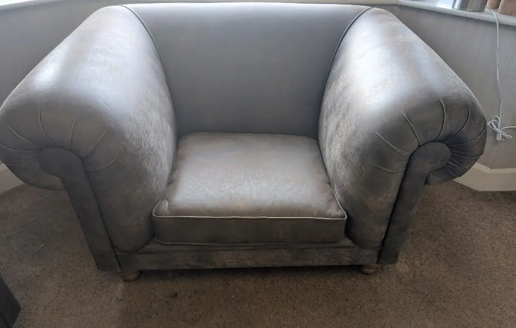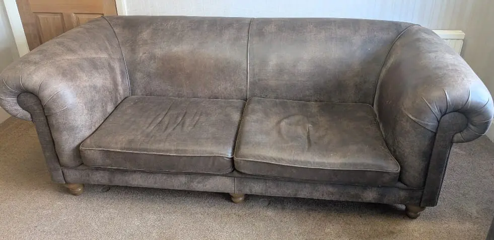 Selling a matching three-seater and armchair due to a house move. They are “Northbank” from Distinctive Chesterfields in brown with oak “Vegas” feet and foam and fibre filling.