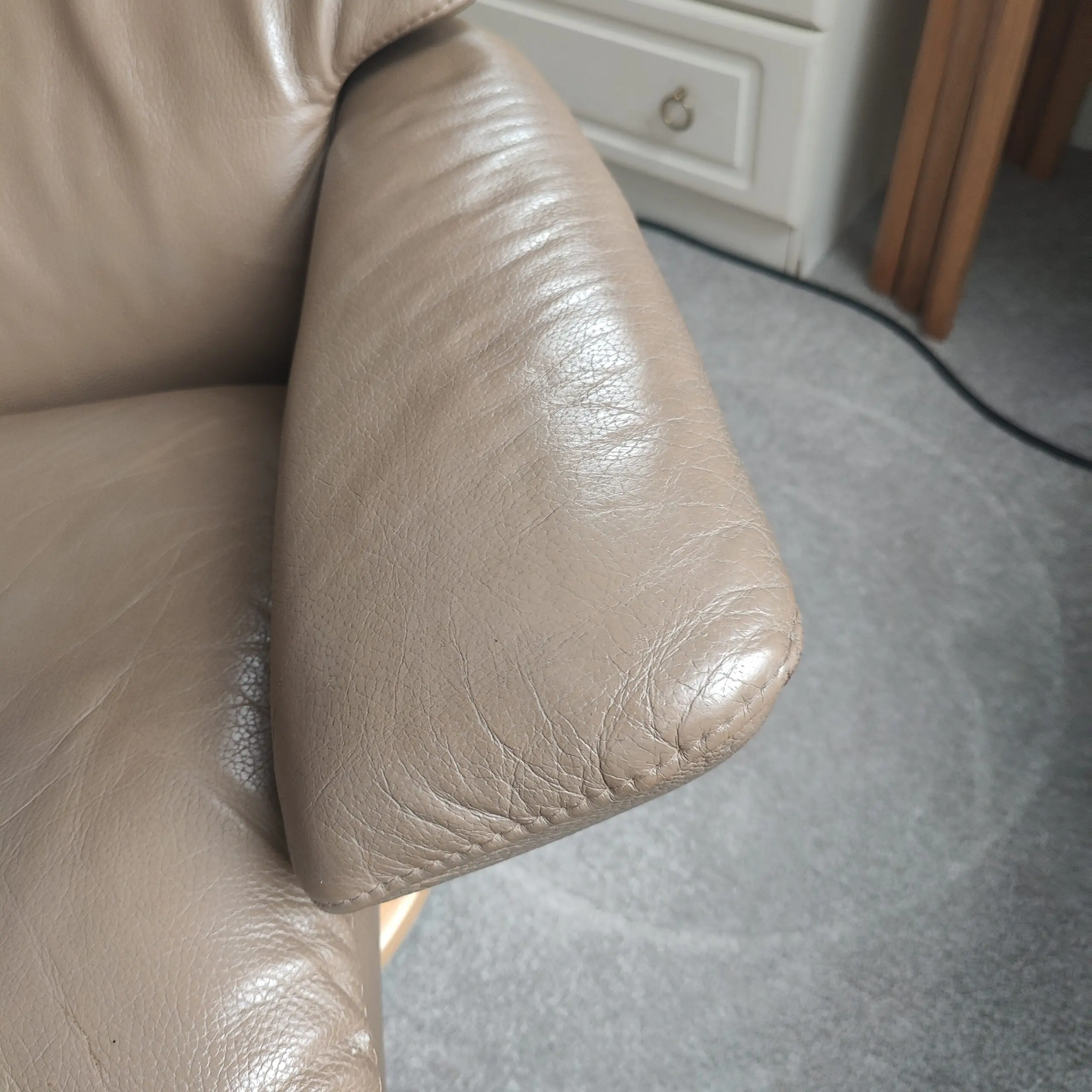 A two seater recliner sofa, two reclining armchairs with pale wood swivel bases and two tilt adjustable footstools.