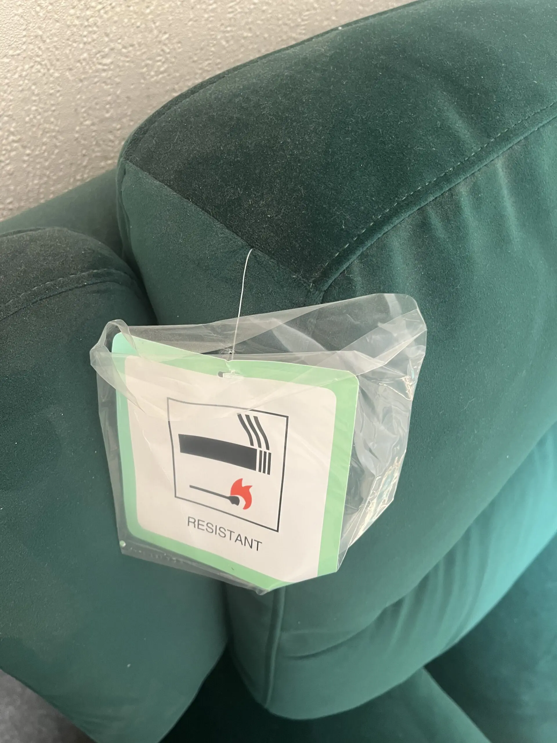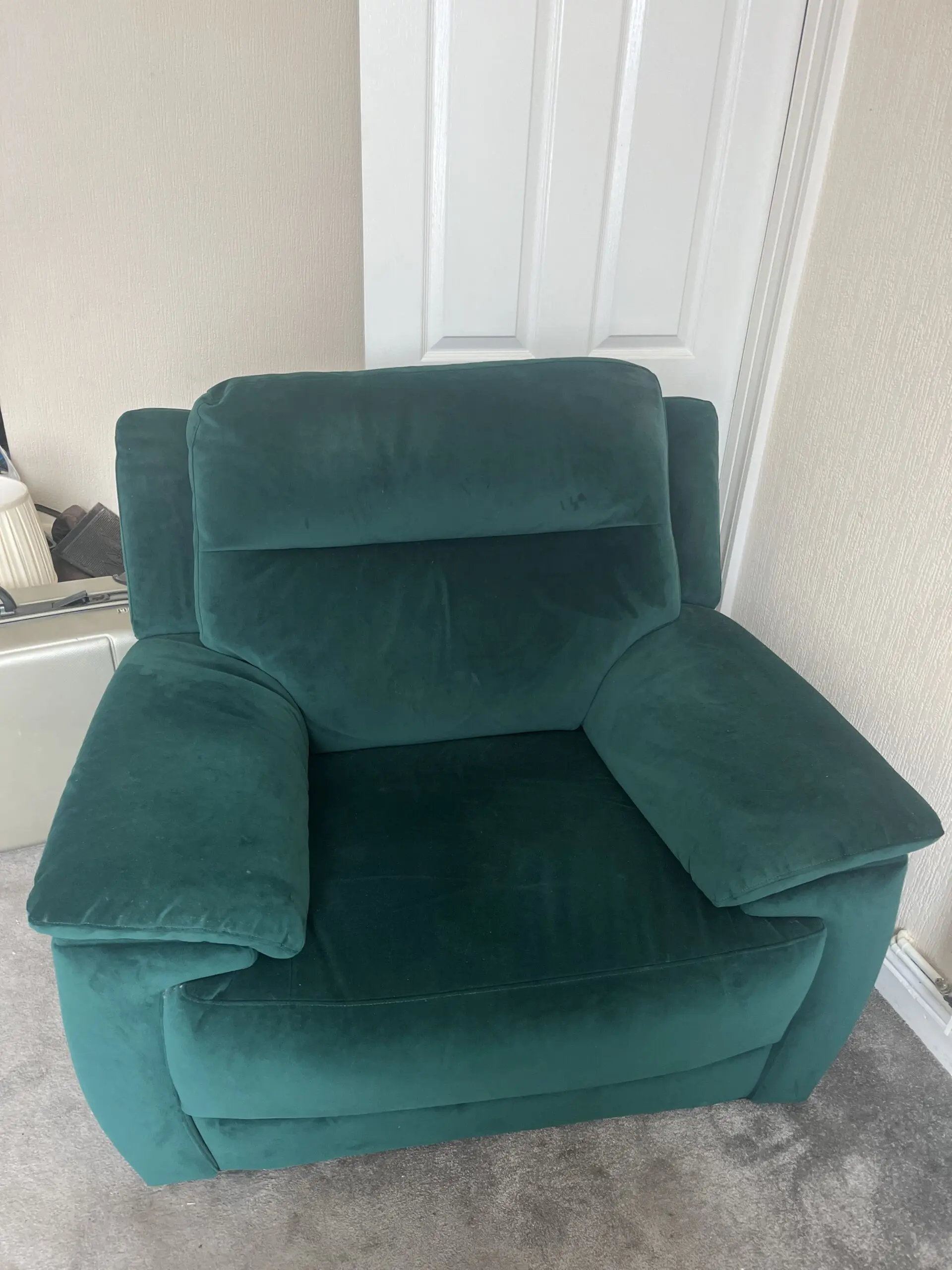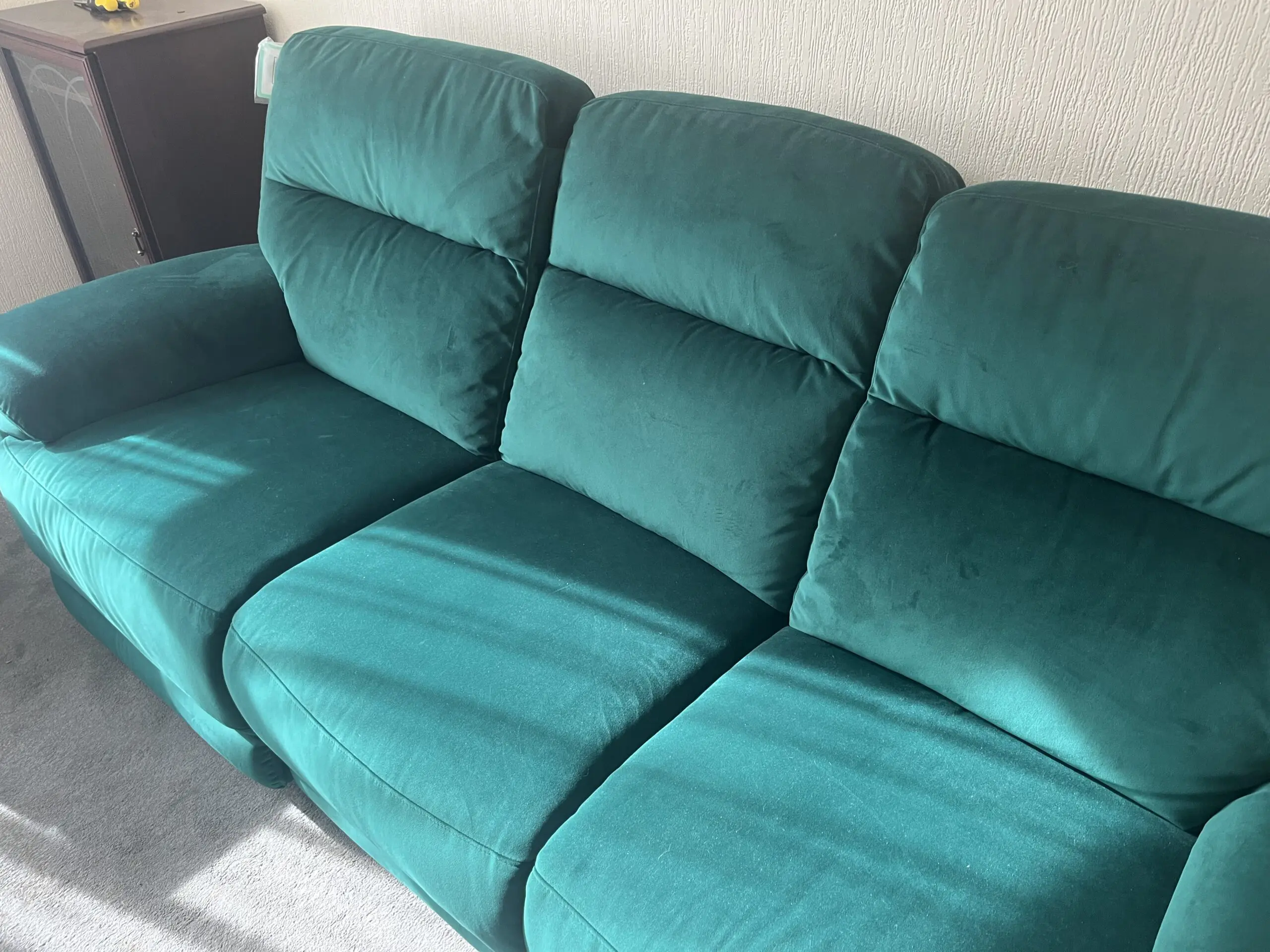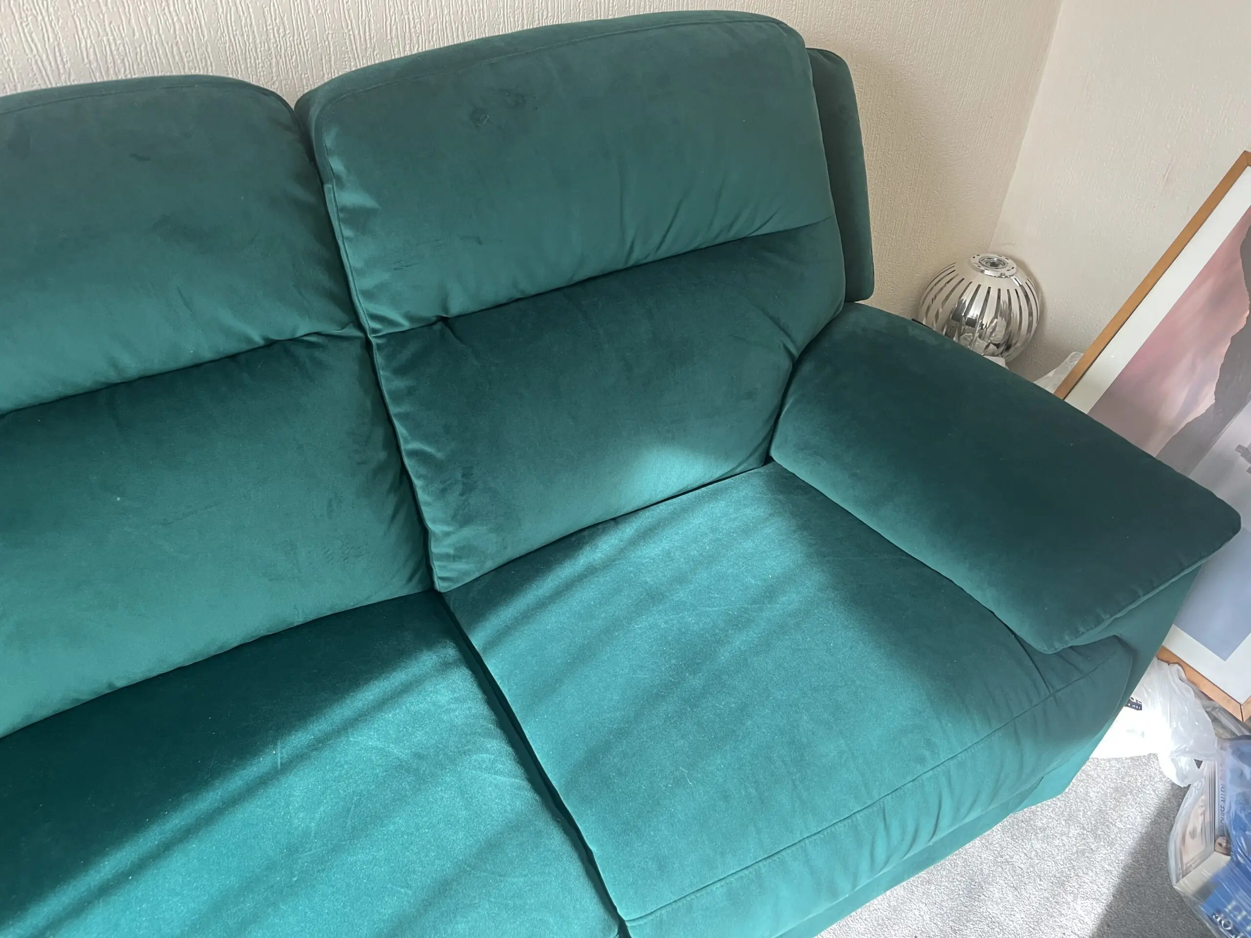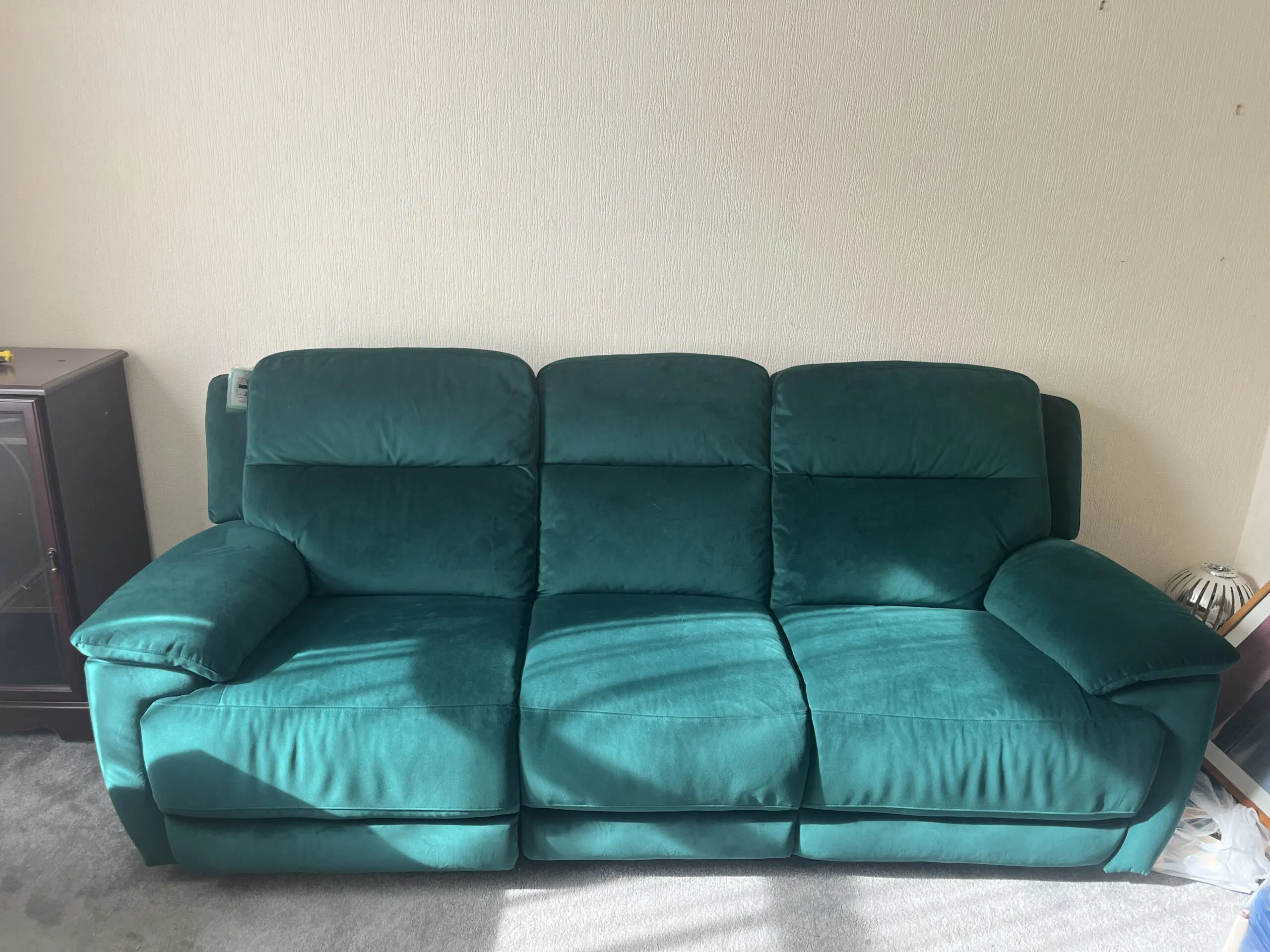 Emerald green three-seater sofa with electric footrest built into end seat. Only two years old. Comfy and smart. Selling because it doesn’t suit the style of my new place.