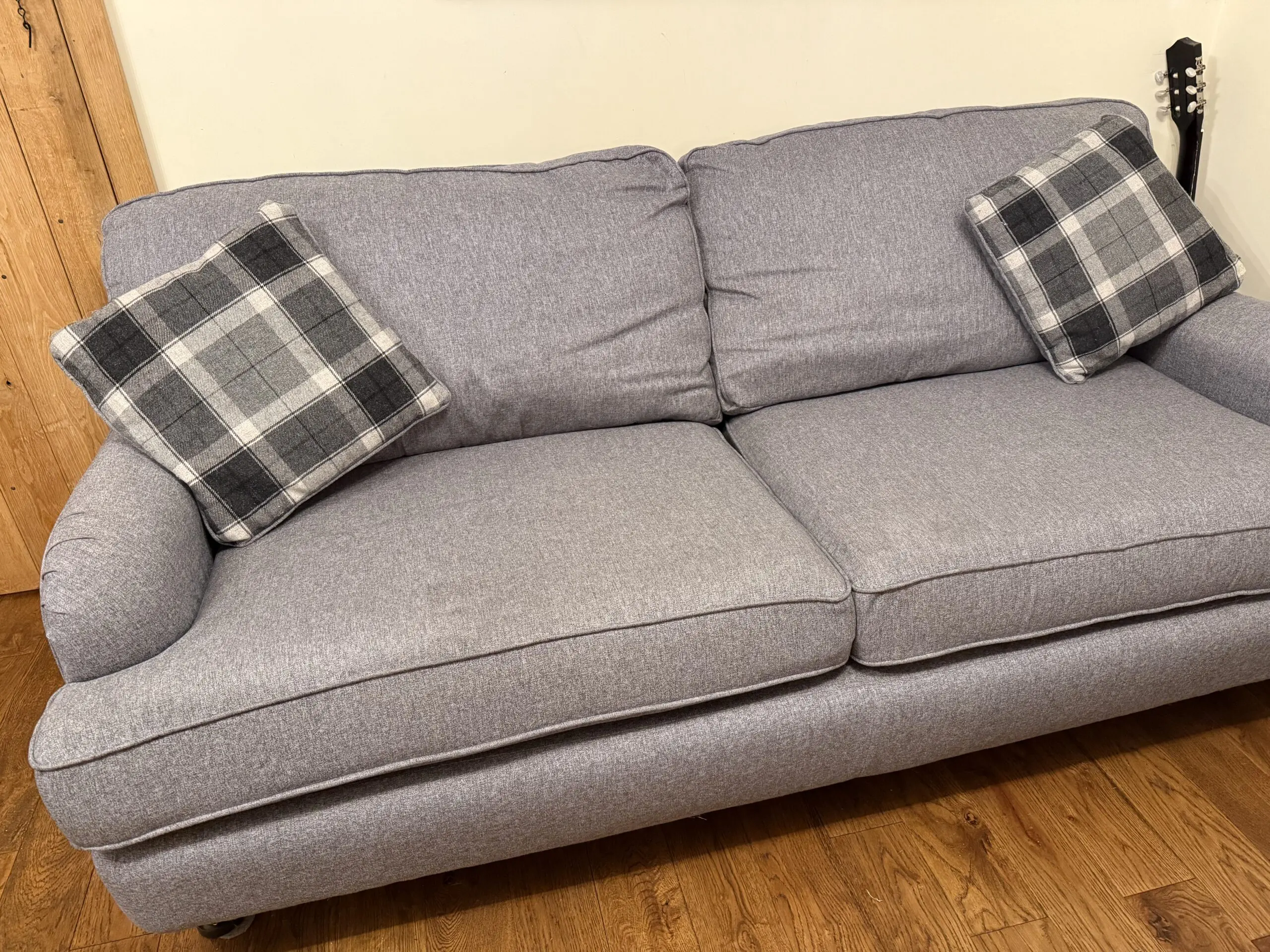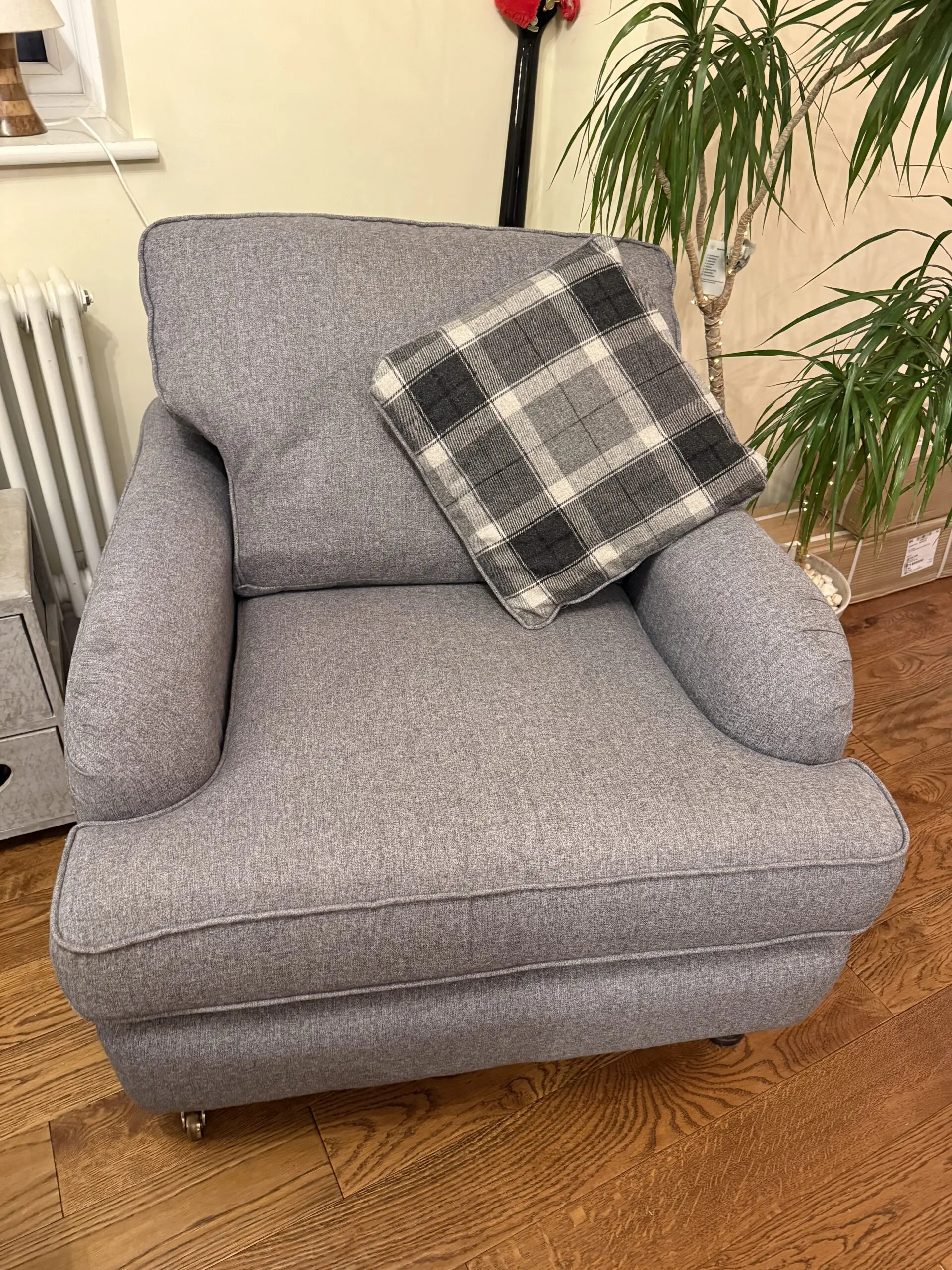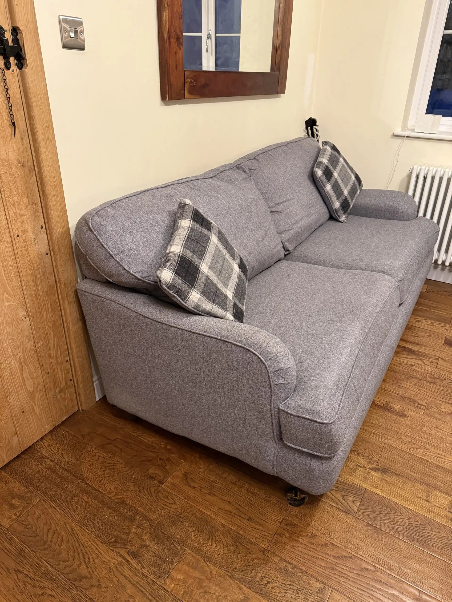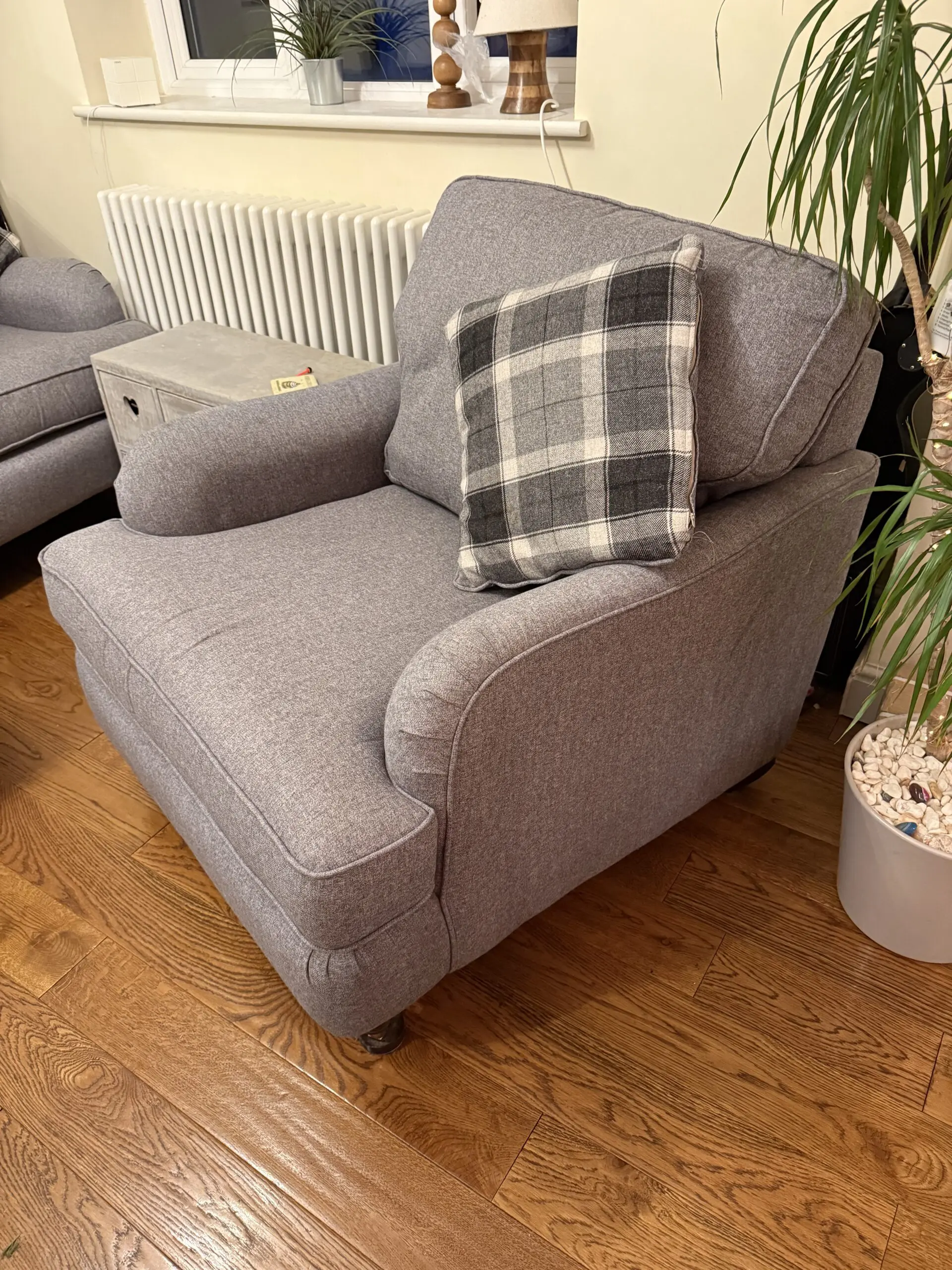 Lovely grey sofa and chair, hardly used as was in a spare room, chair still has tags on! Excellent condition, covers are removable and reversible (so one side has never been sat on). Scatter cushions included. Very comfortable.