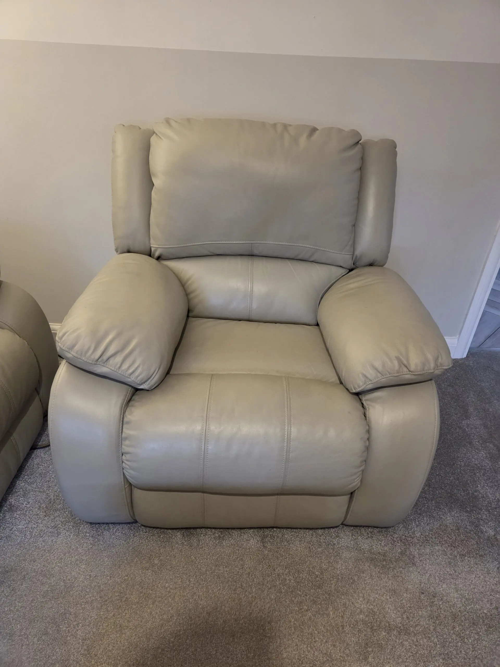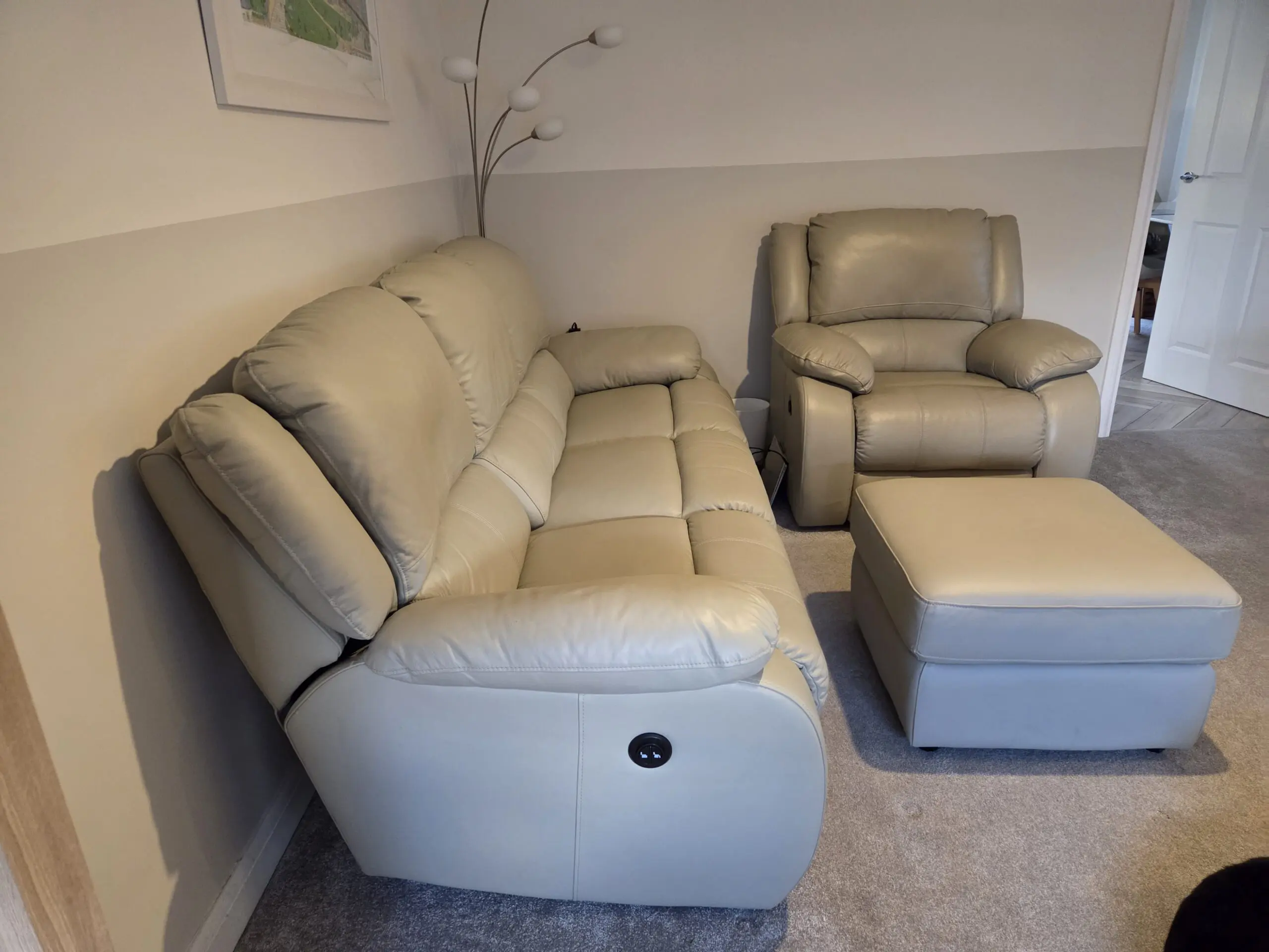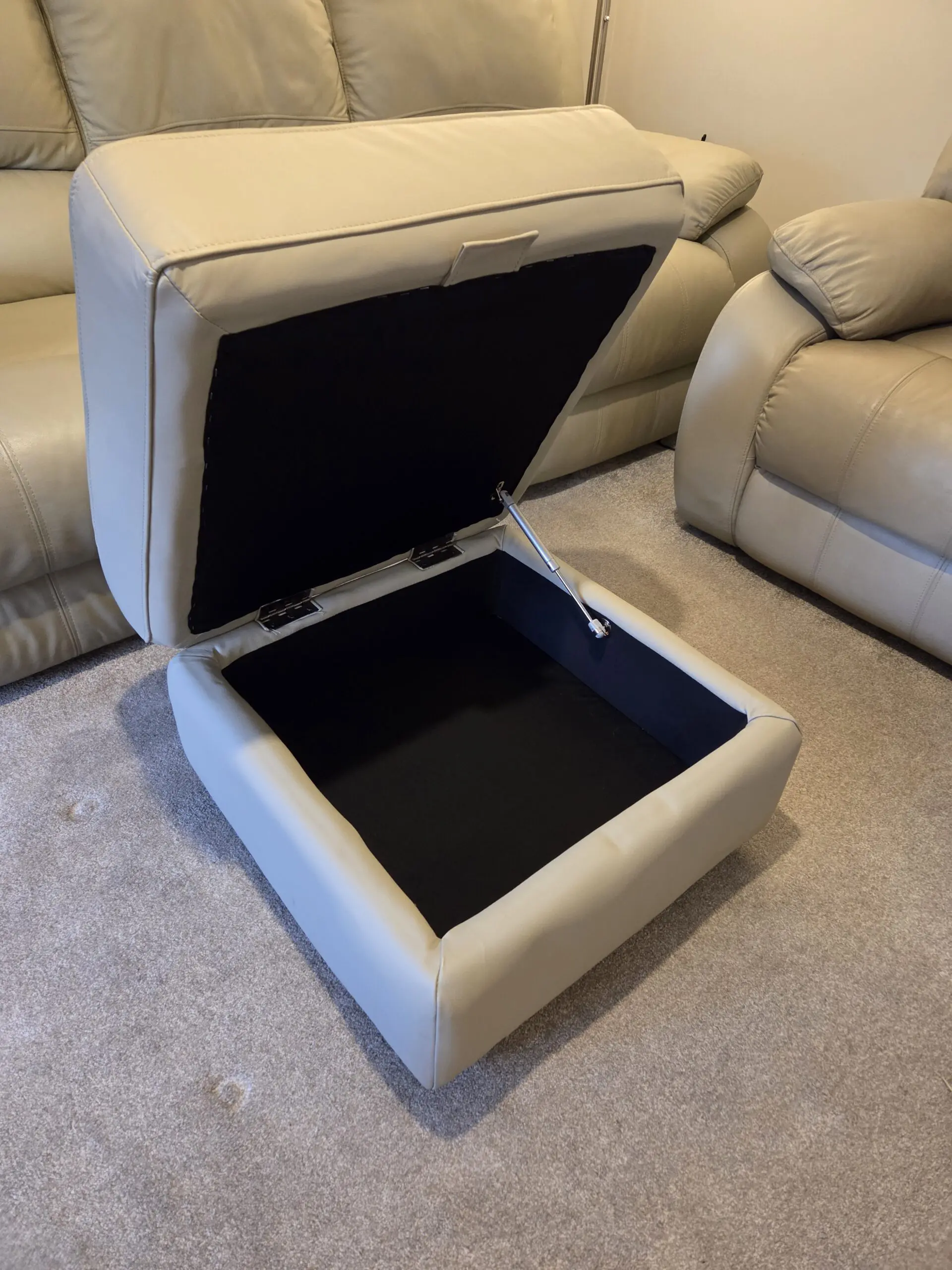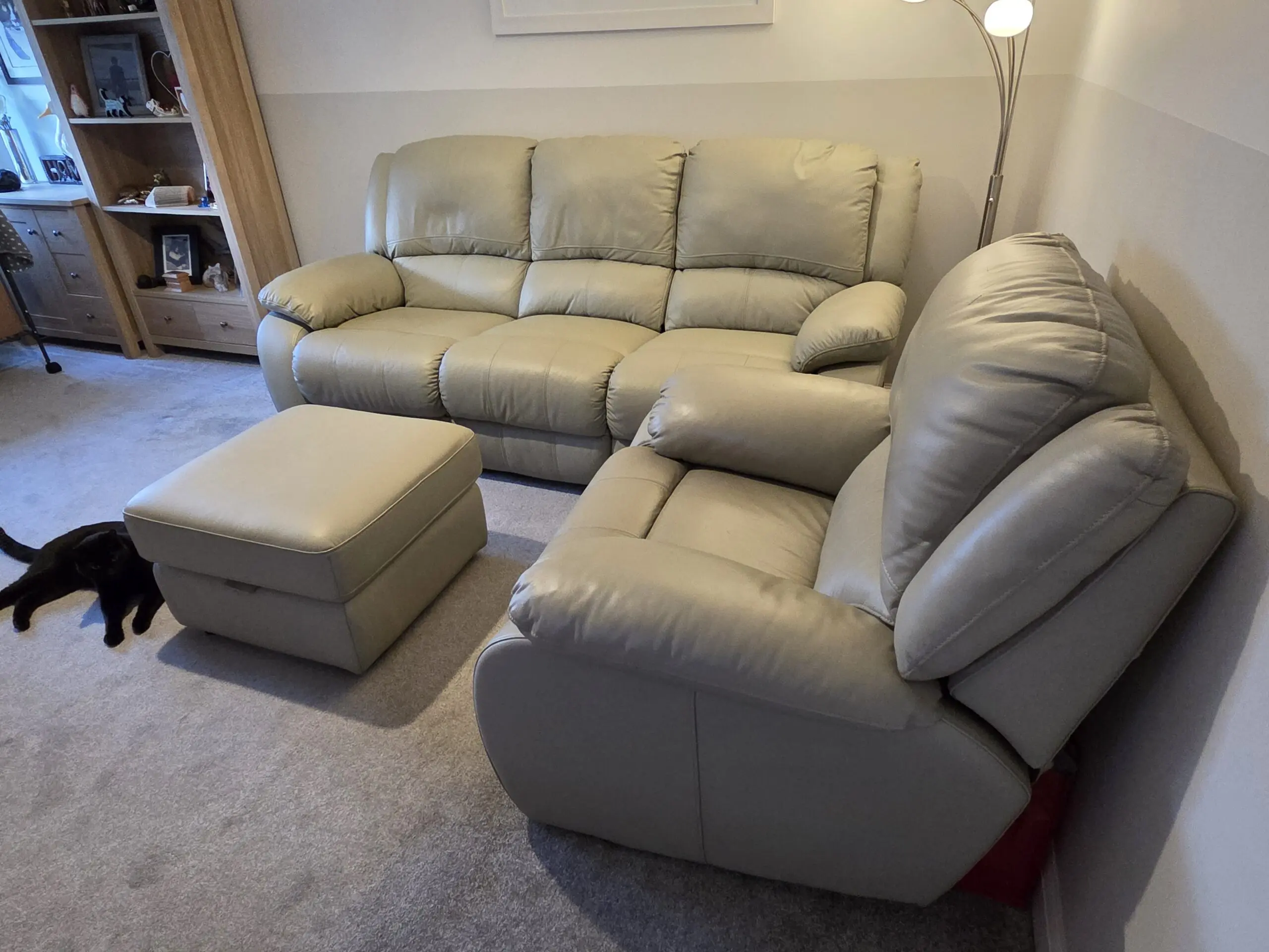 Set comprises 3 seater recliner sofa (both end chairs recline), recliner armchair and footstool with storage.