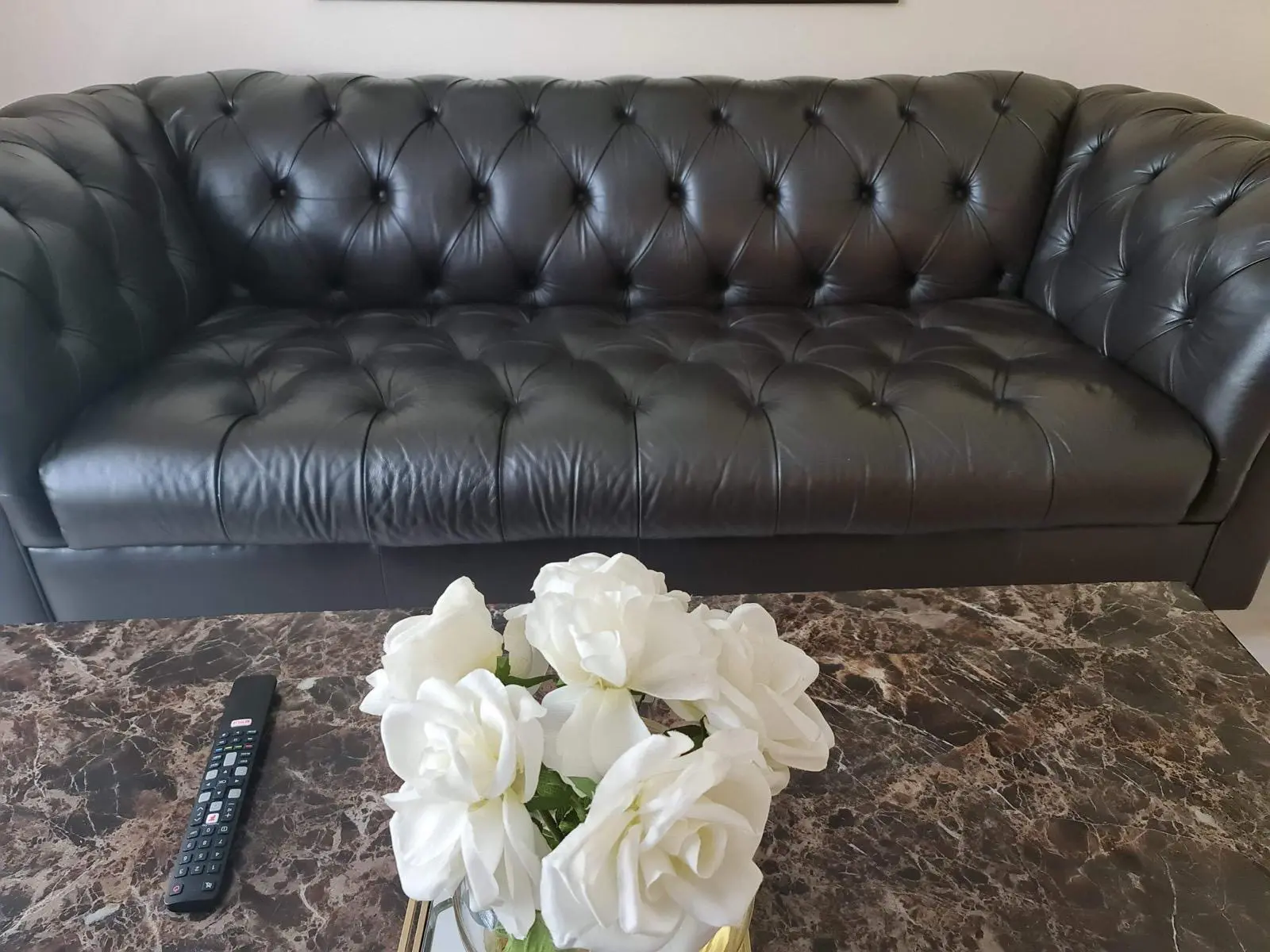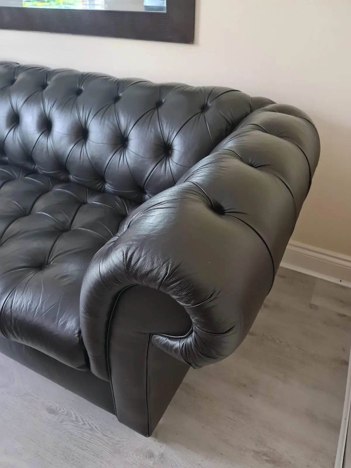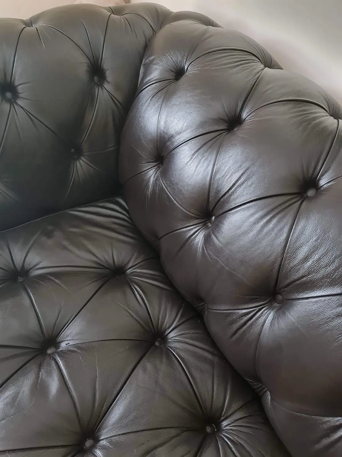 The Fully Button Brown Leather Chesterfield Three and two Piece Suite is a luxurious addition to any home, featuring a classic Chesterfield design with a wooden frame in a rich brown colour. The upholstery fabric is made from high-quality leather, adding a touch of elegance and durability to the suite. With no additional parts or assembly required, this United Kingdom-made furniture piece is ready to be enjoyed straight away in any living room or lounge. this is in used condition with no rips or tears