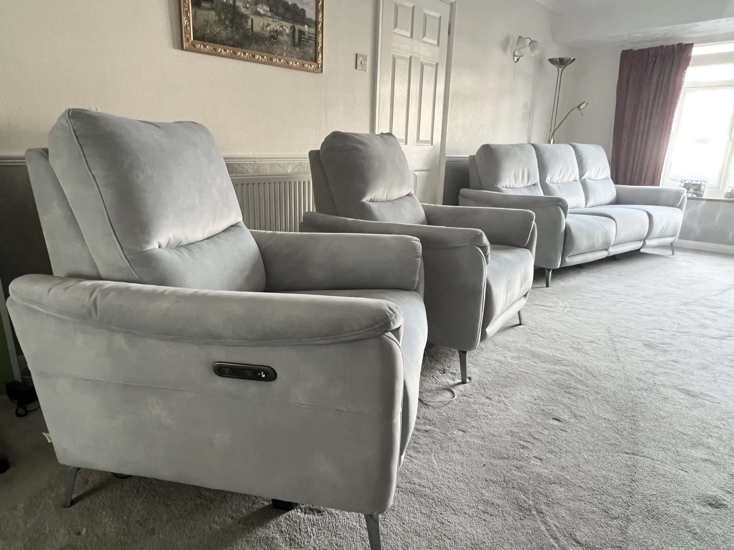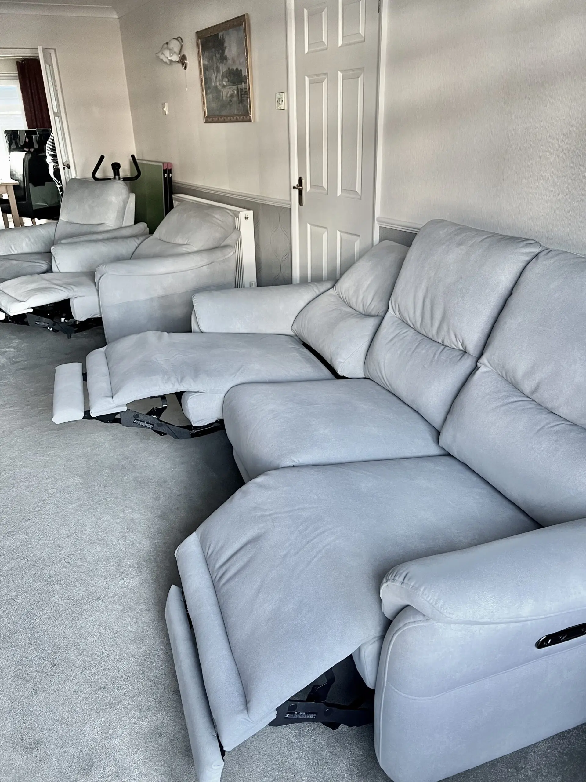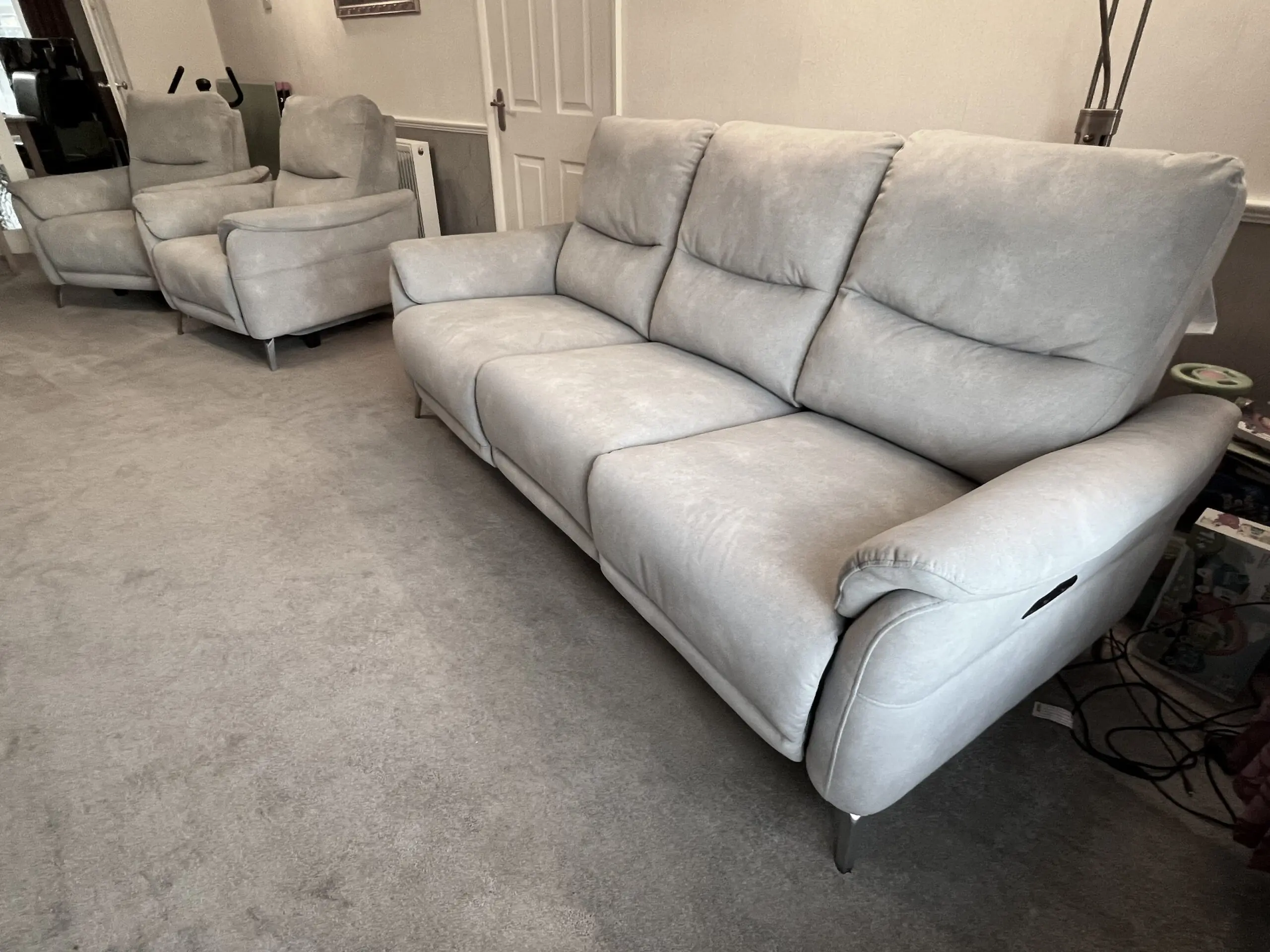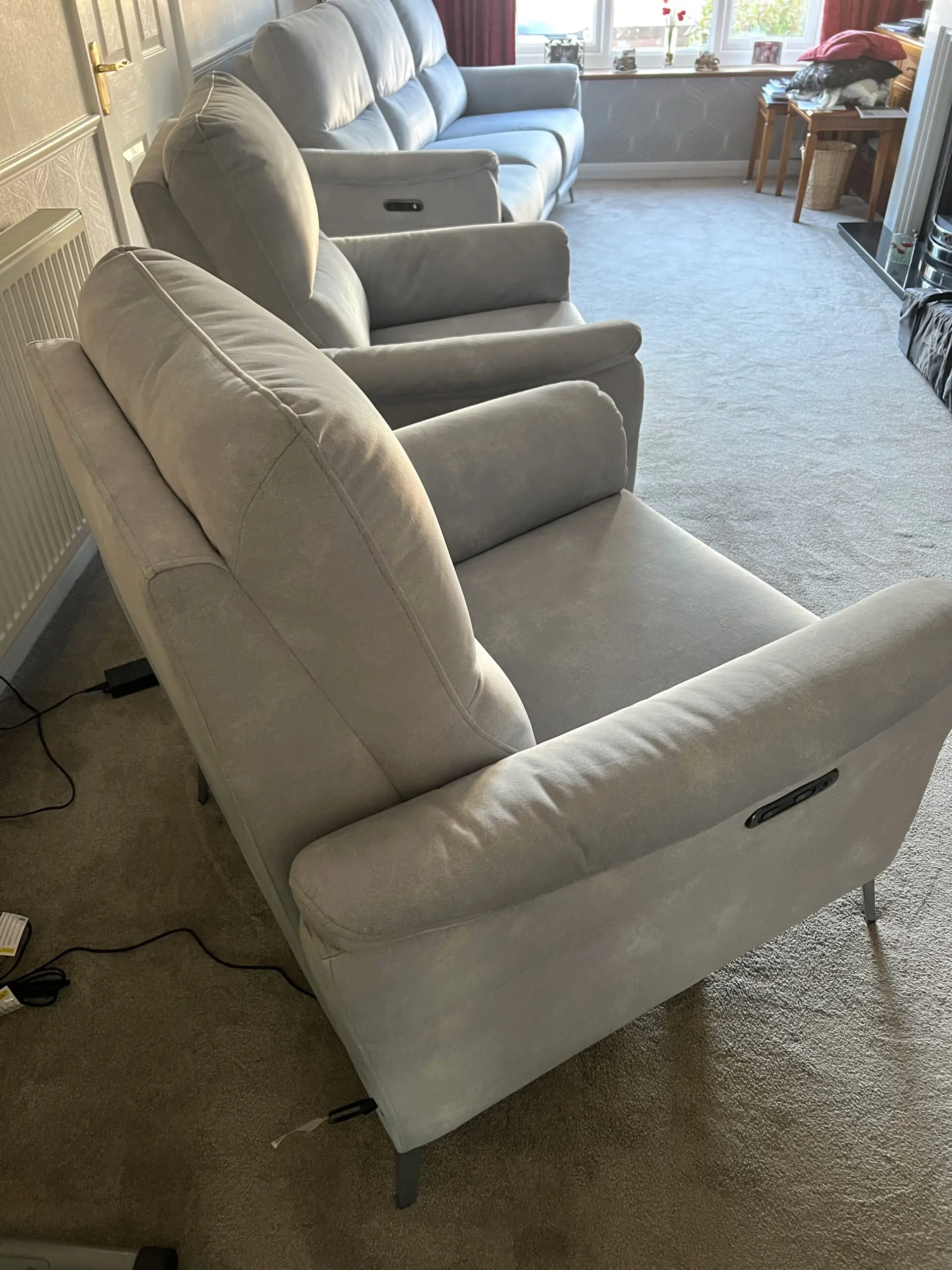 Mainly used one seat of sofa and one chair so the chair cushioning has not yet fully softened throughout the suite. There is still a little noise to the recliner actions caused by fabric/fabric contact but told to expect this to ease with use.