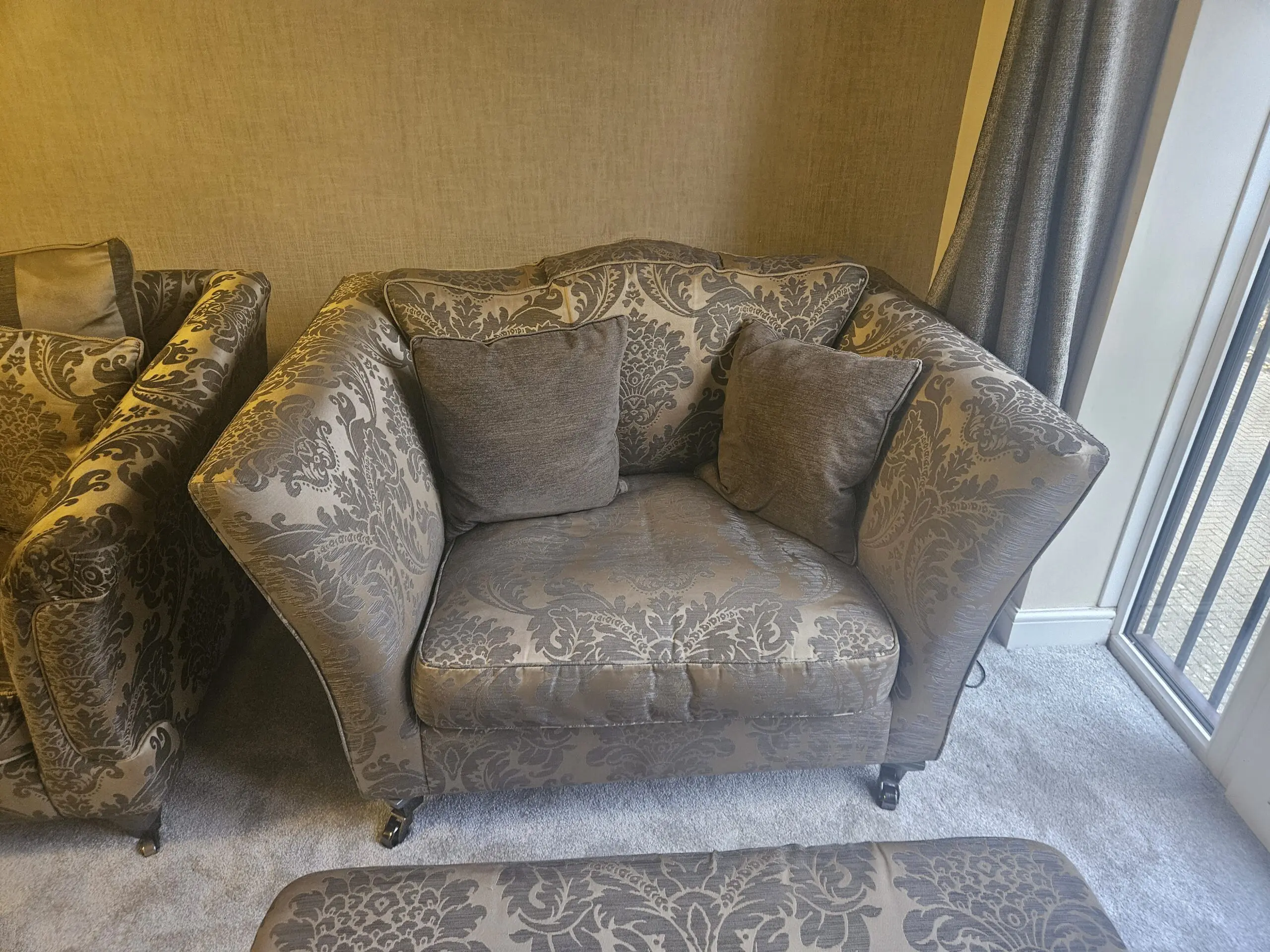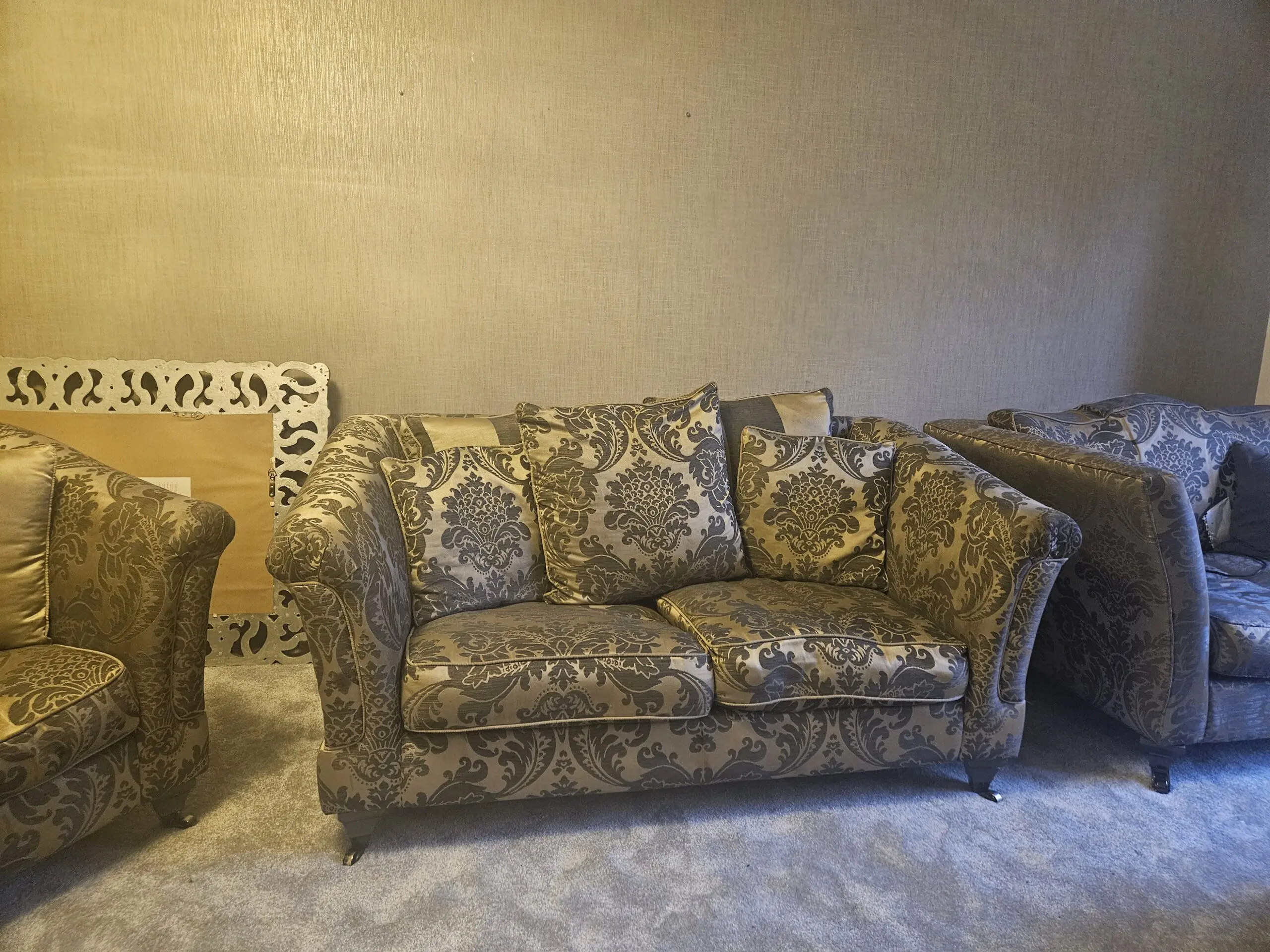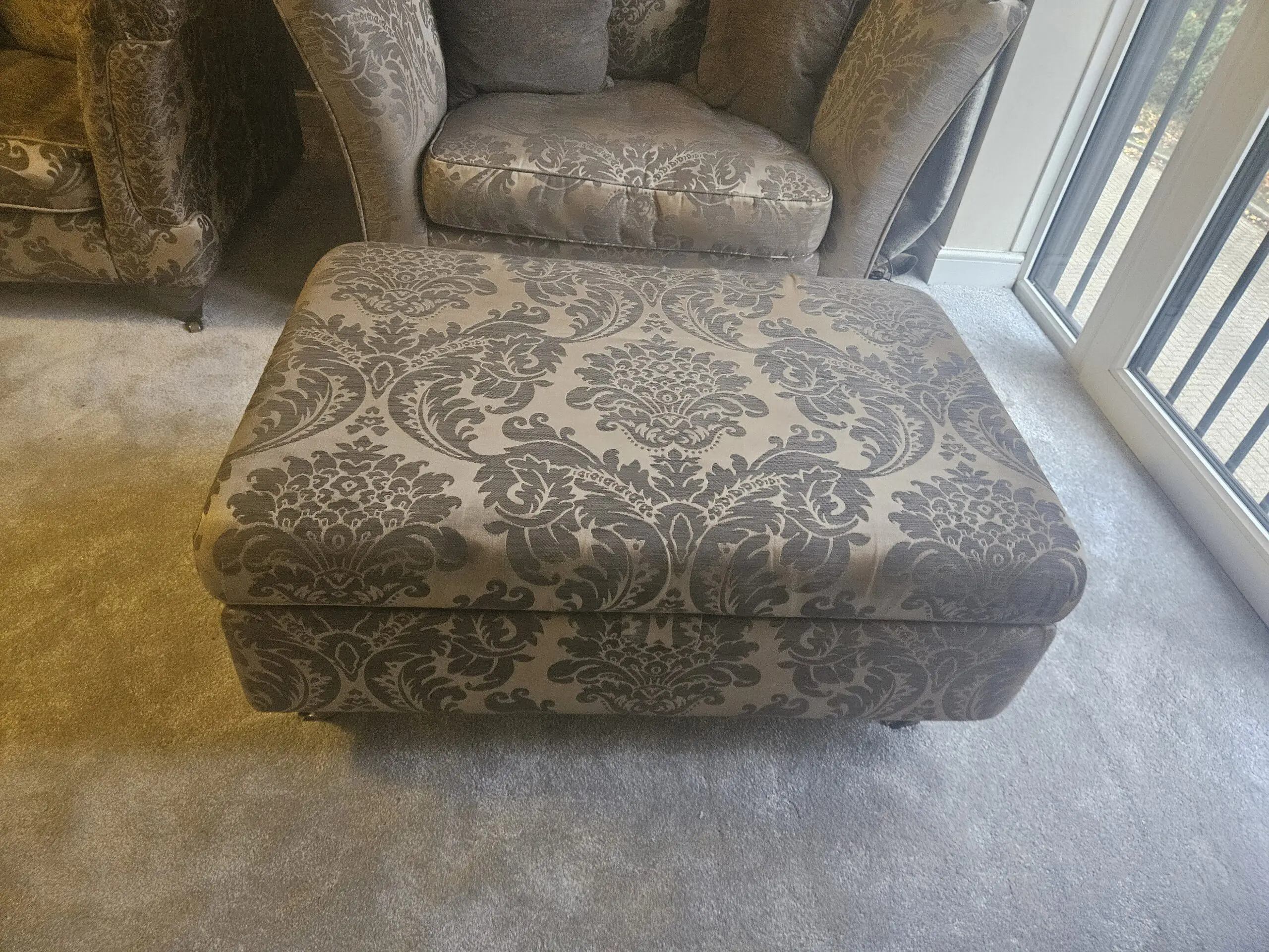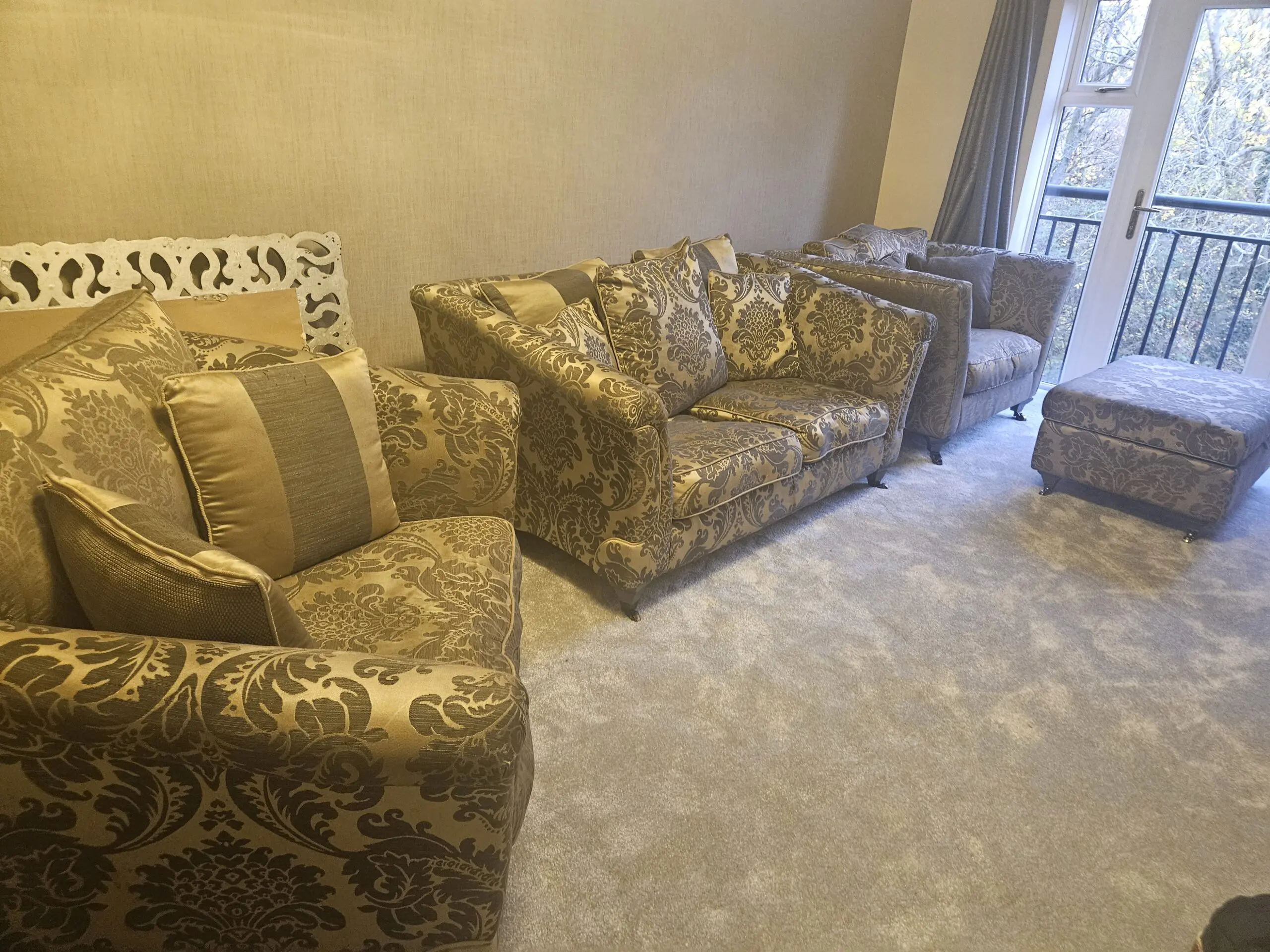 Vantage Furniture Village Damask Gold Sofa Set. 3 seater and 2 x large snuggle chairs. Used. With Cushions and Footstool/Blanket box.