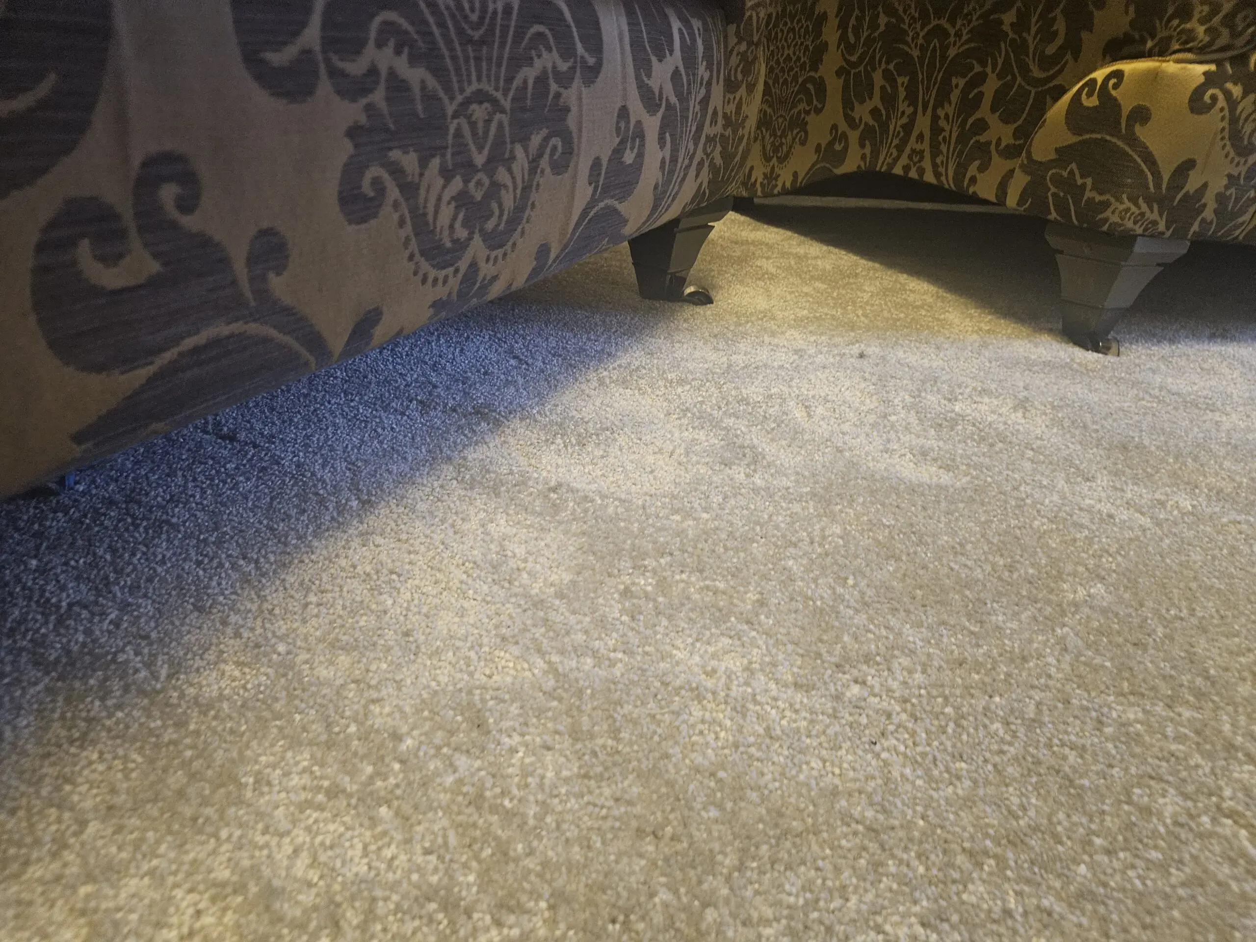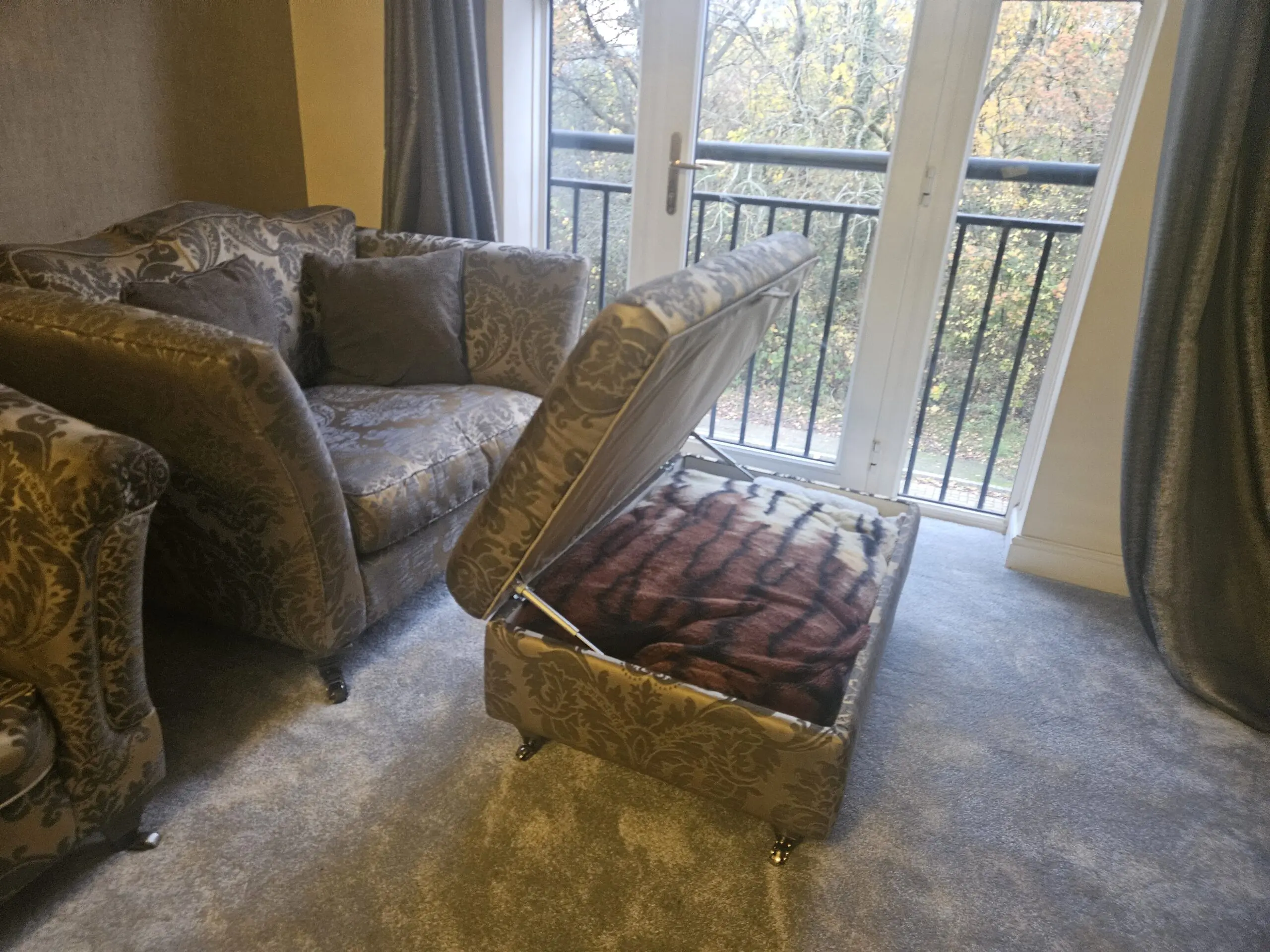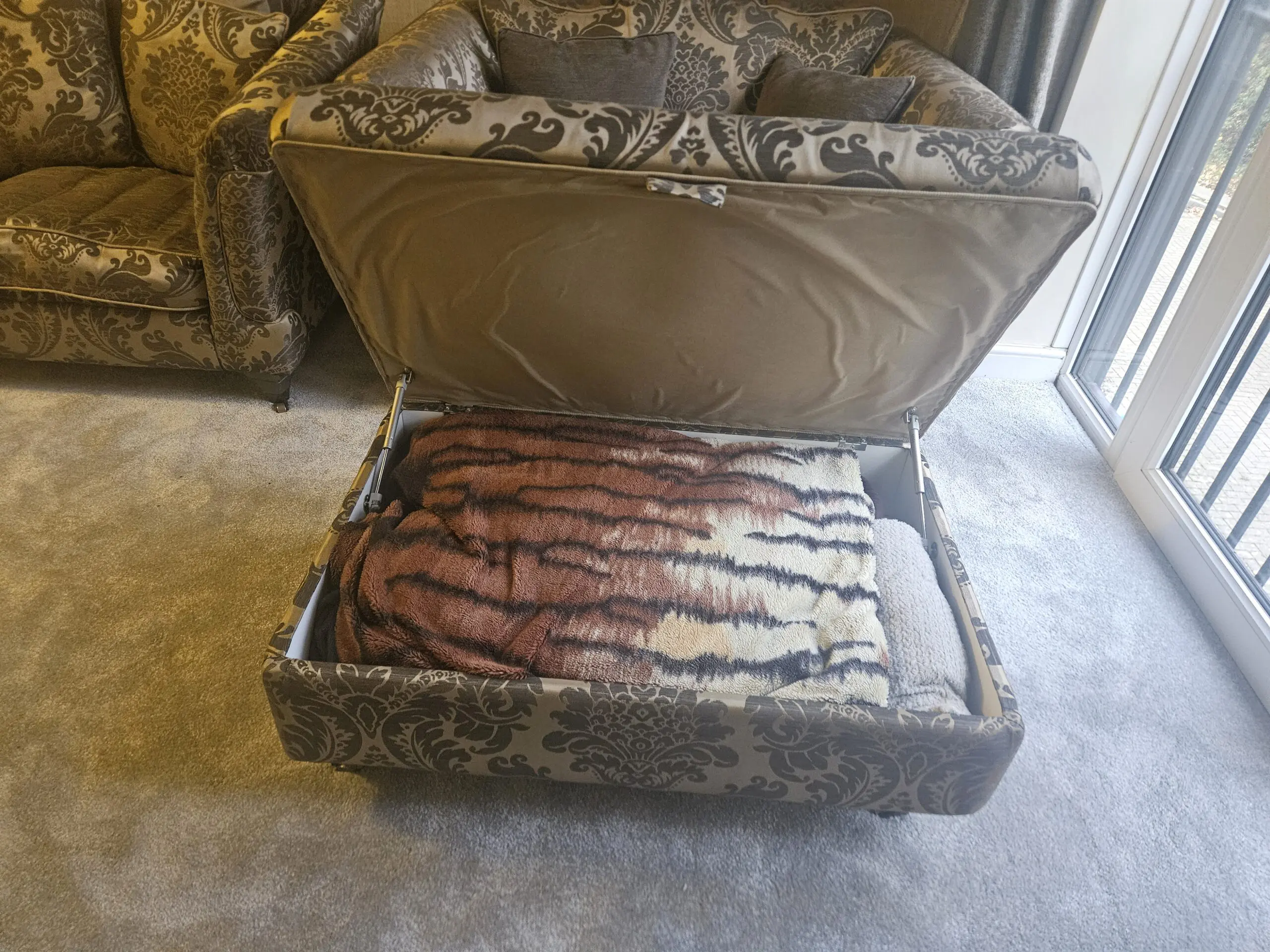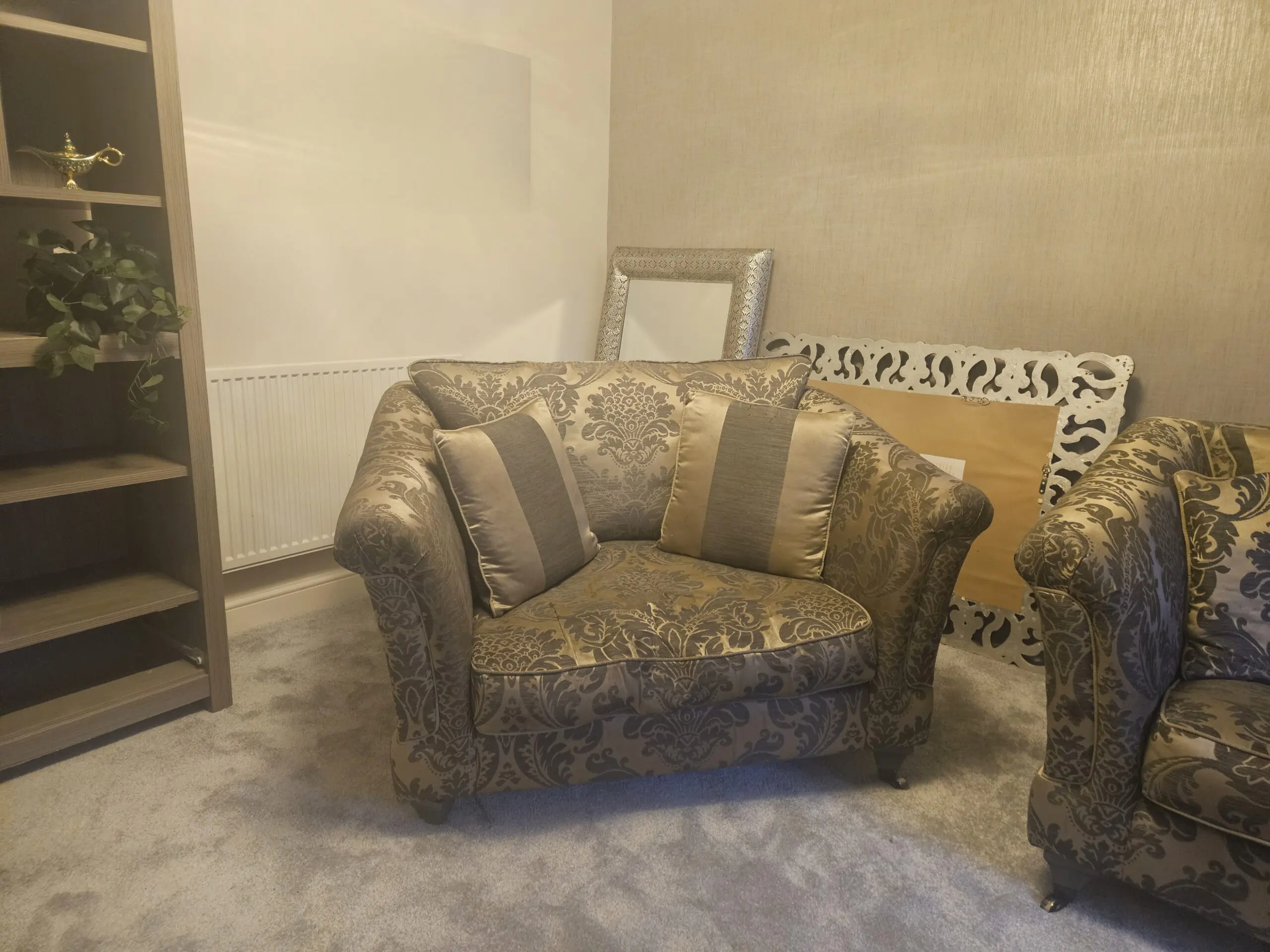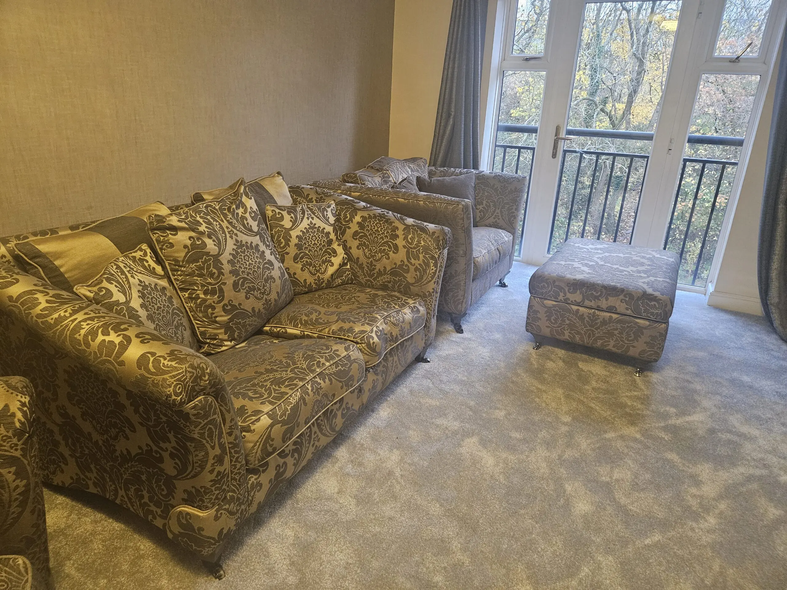 Vantage Furniture Village Damask Gold Sofa Set. 3 seater and 2 x large snuggle chairs. Used. With Cushions and Footstool/Blanket box.