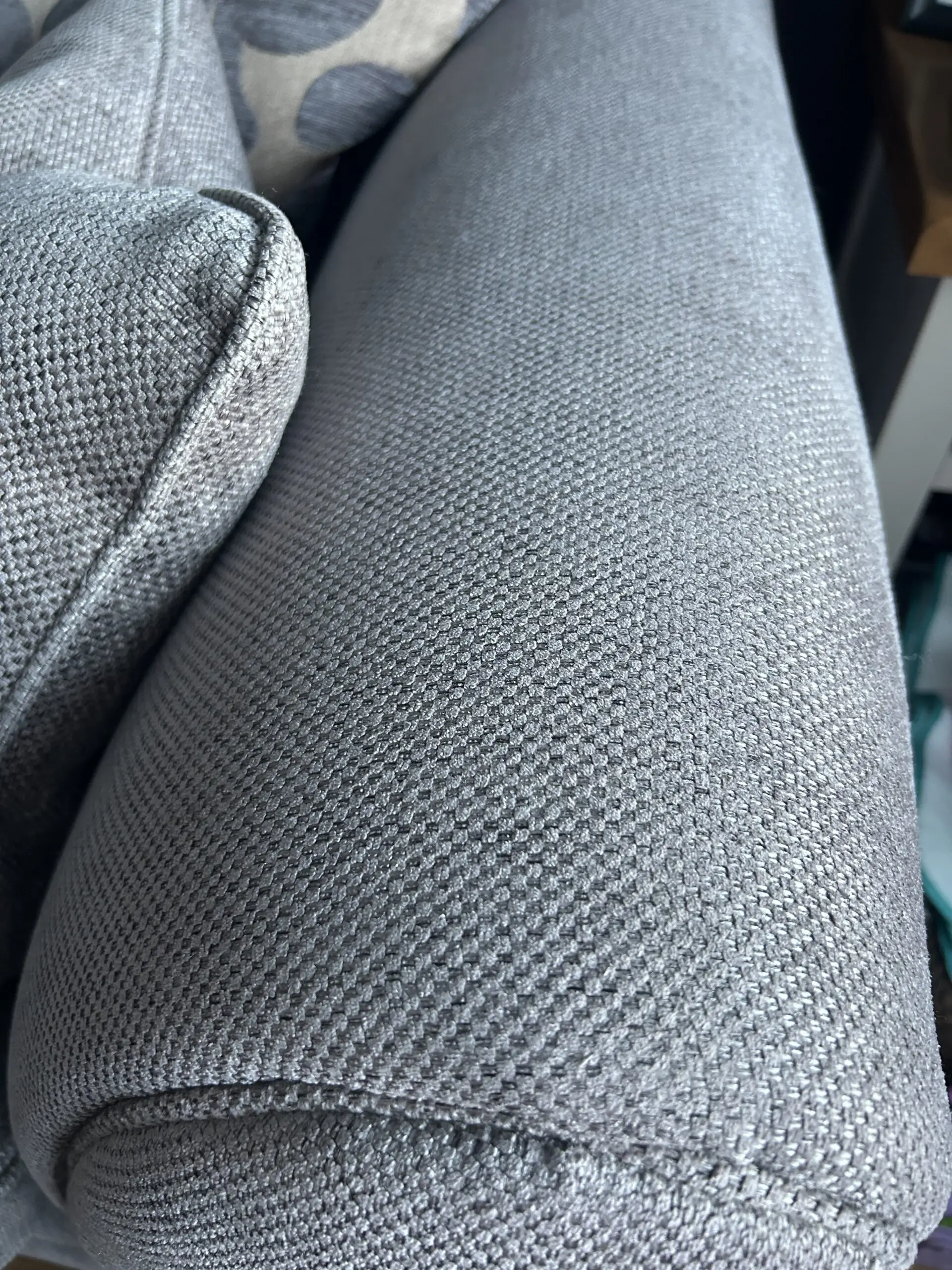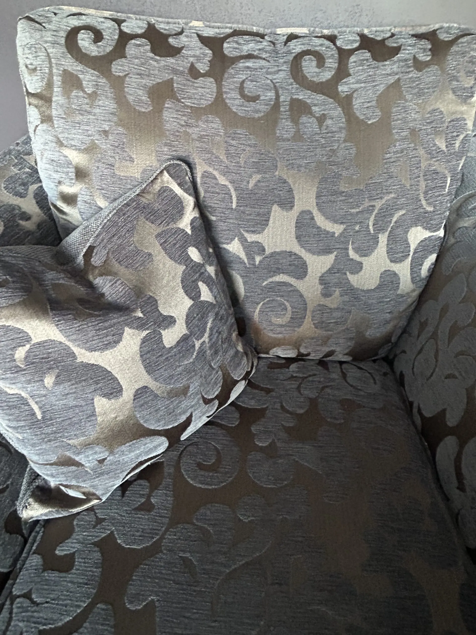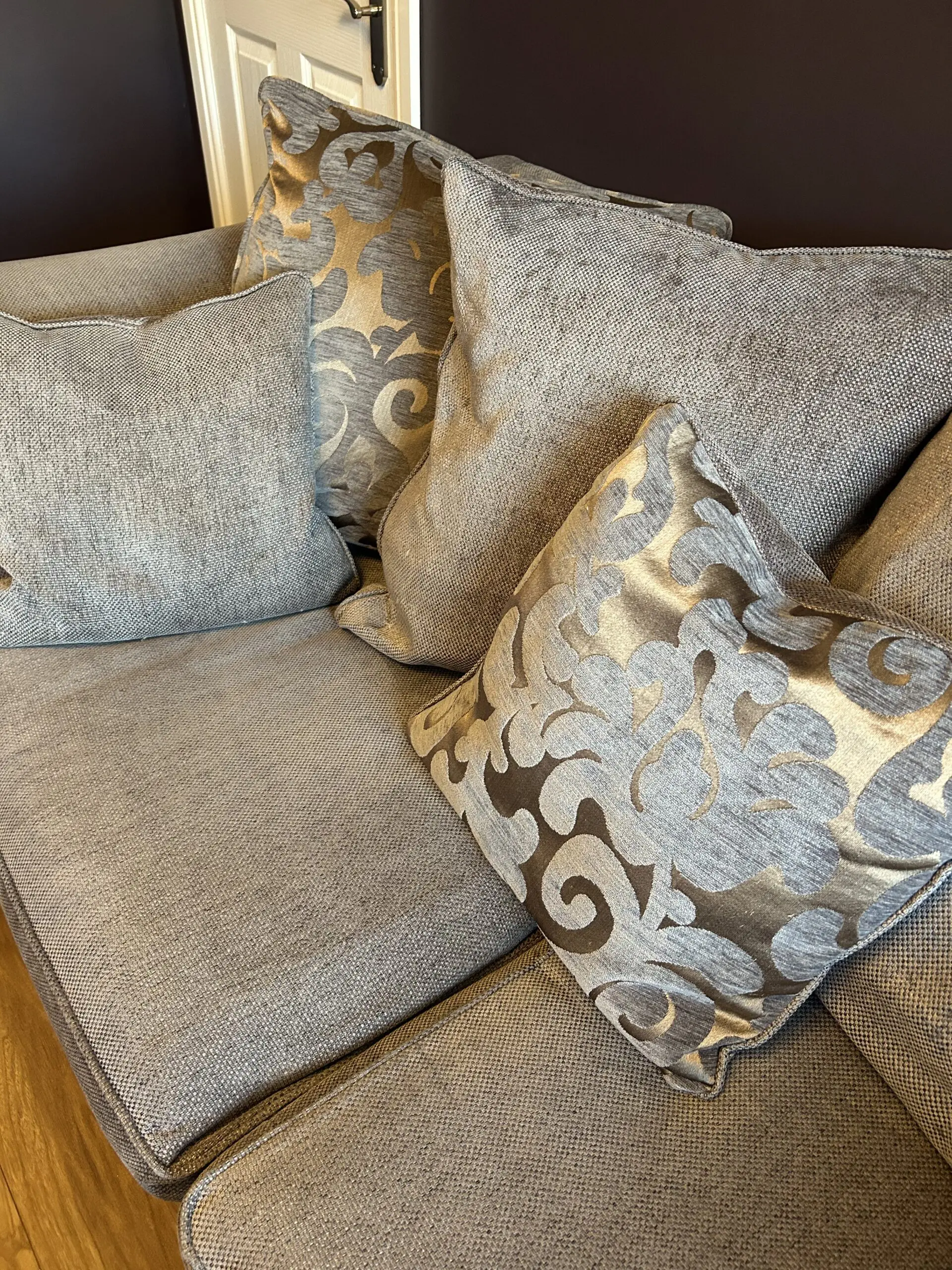 Grey/silver/purple three seater sofa and matching patterned armchair
