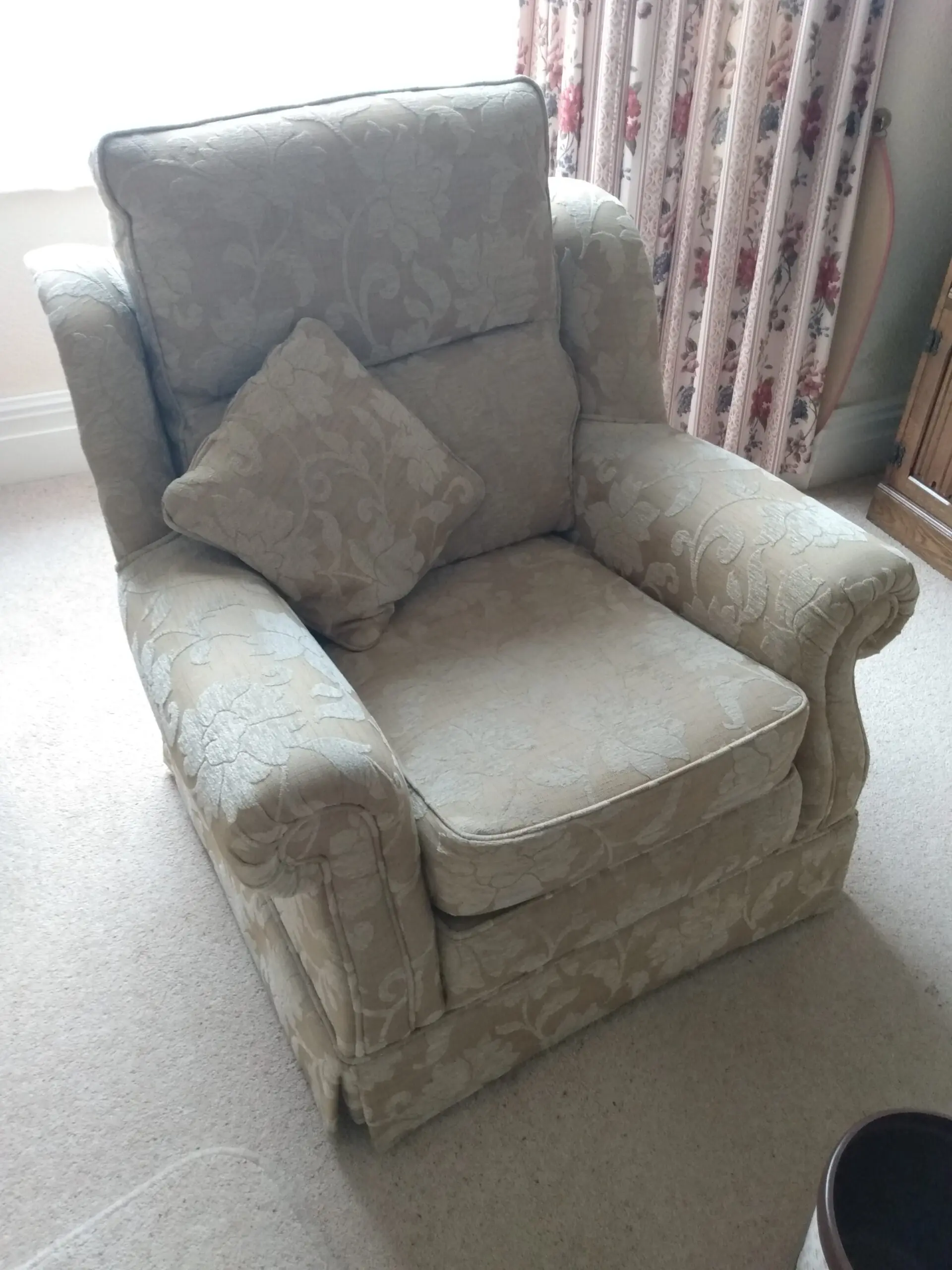 This Gainsborough Carrington 3-piece sofa set comprises a 3-seater sofa and 2 armchairs, with a pair of matching cushions. The fabric is a subtle floral design in beige and light brown.