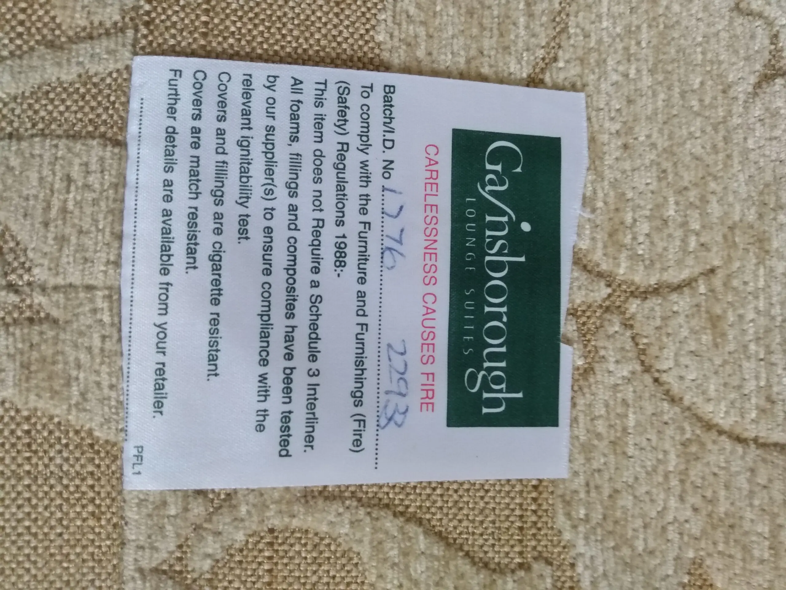 Fire safety labels are sewn-in to each item, under cushions (see photo).
