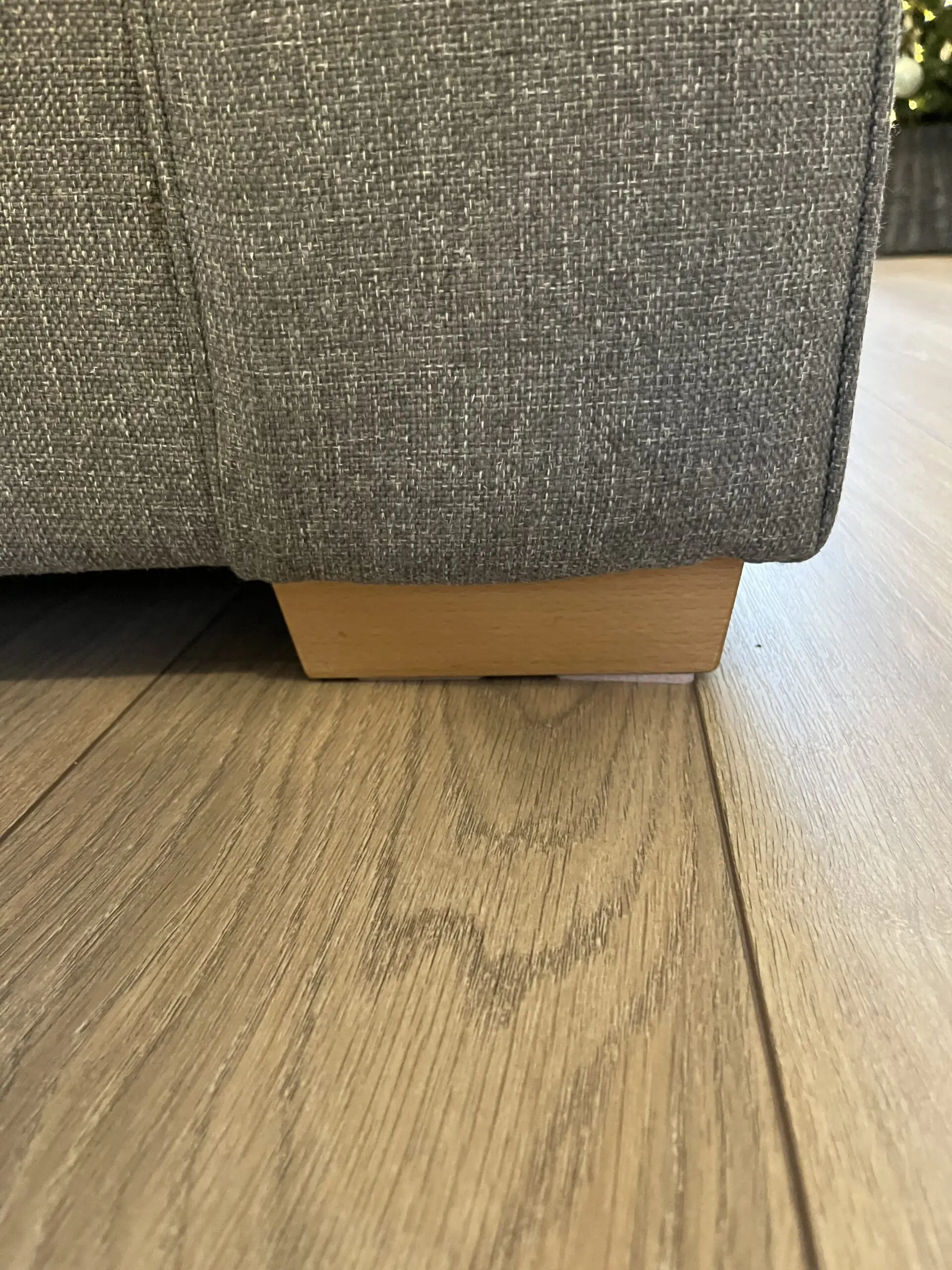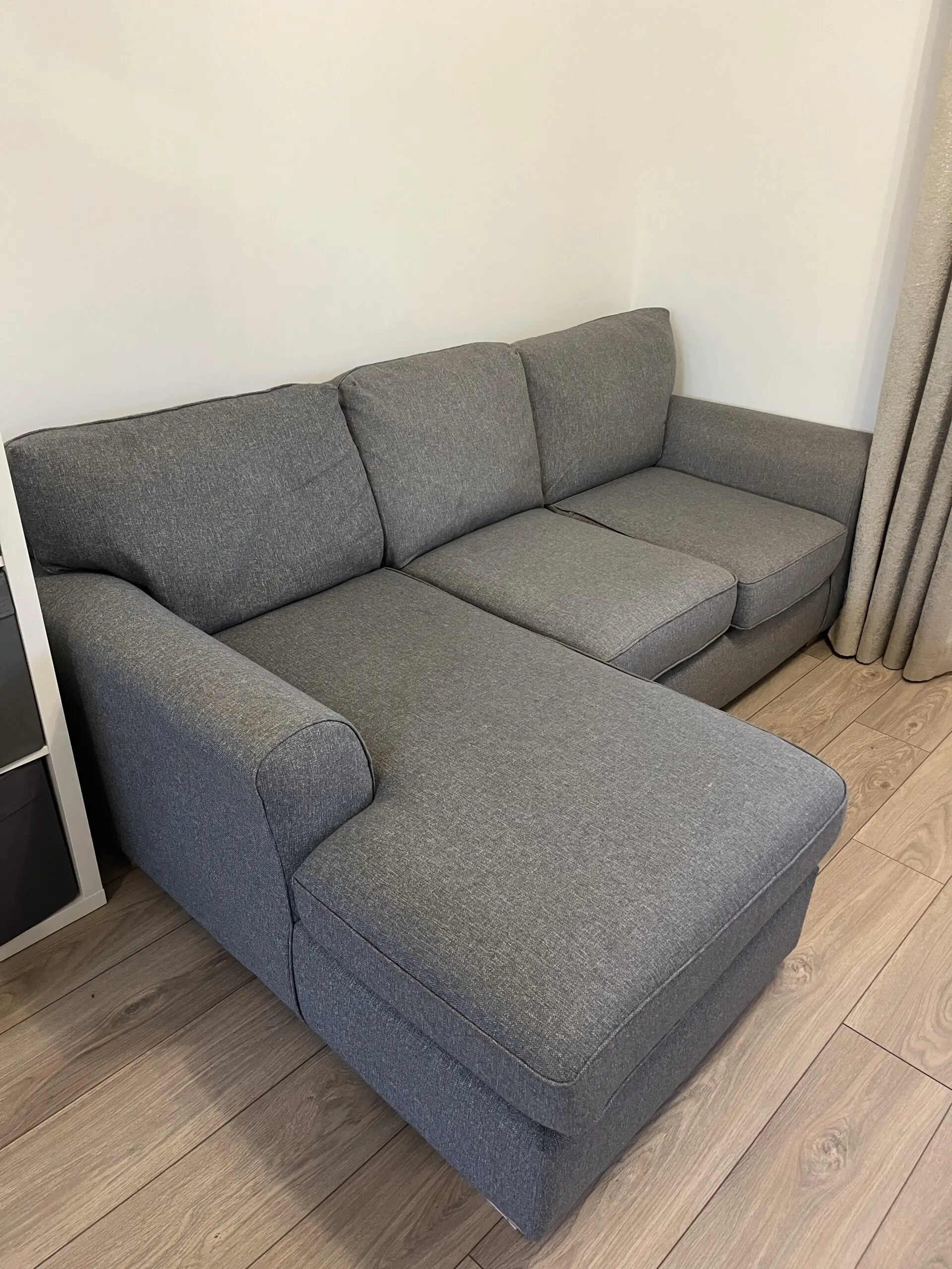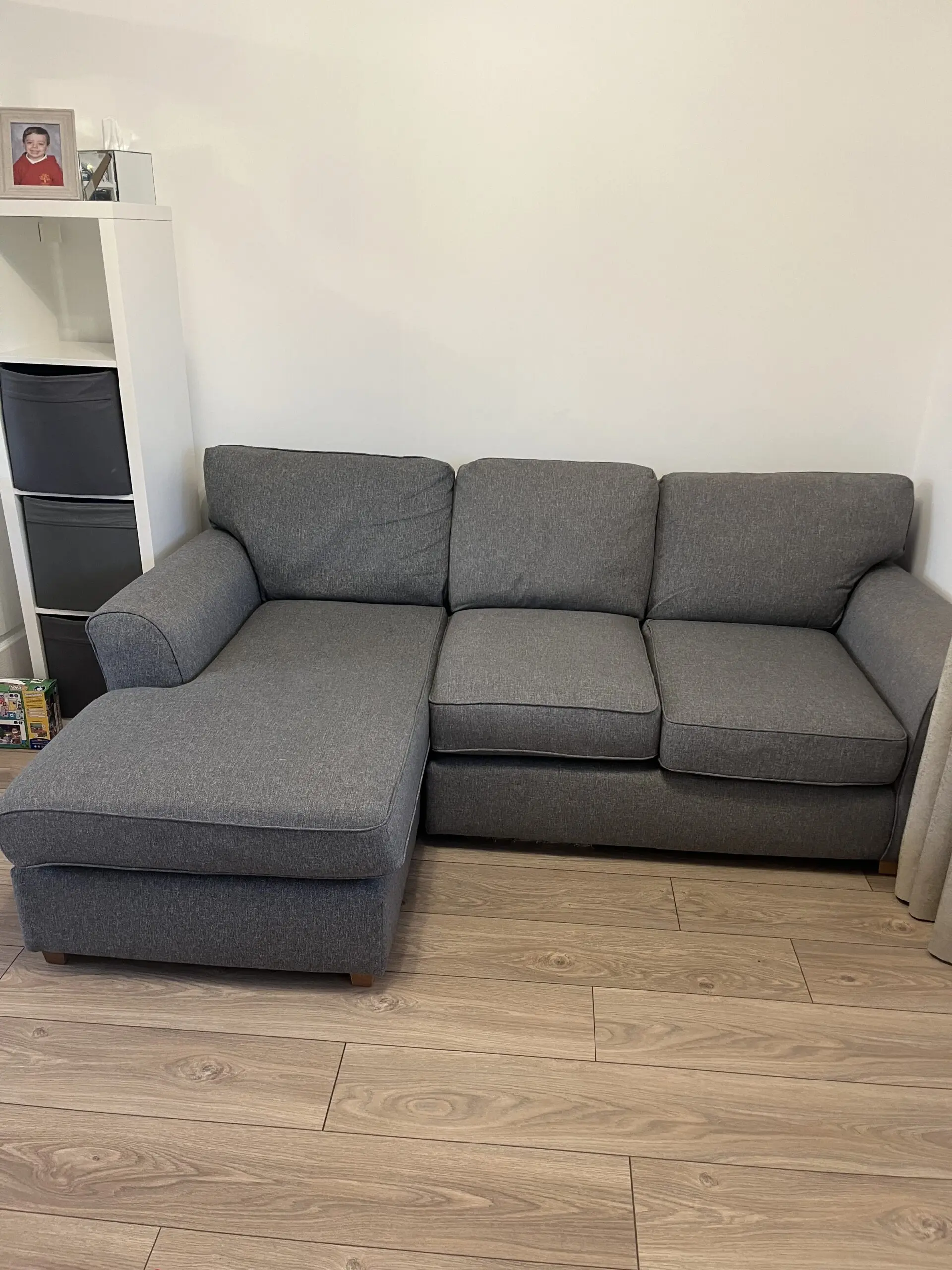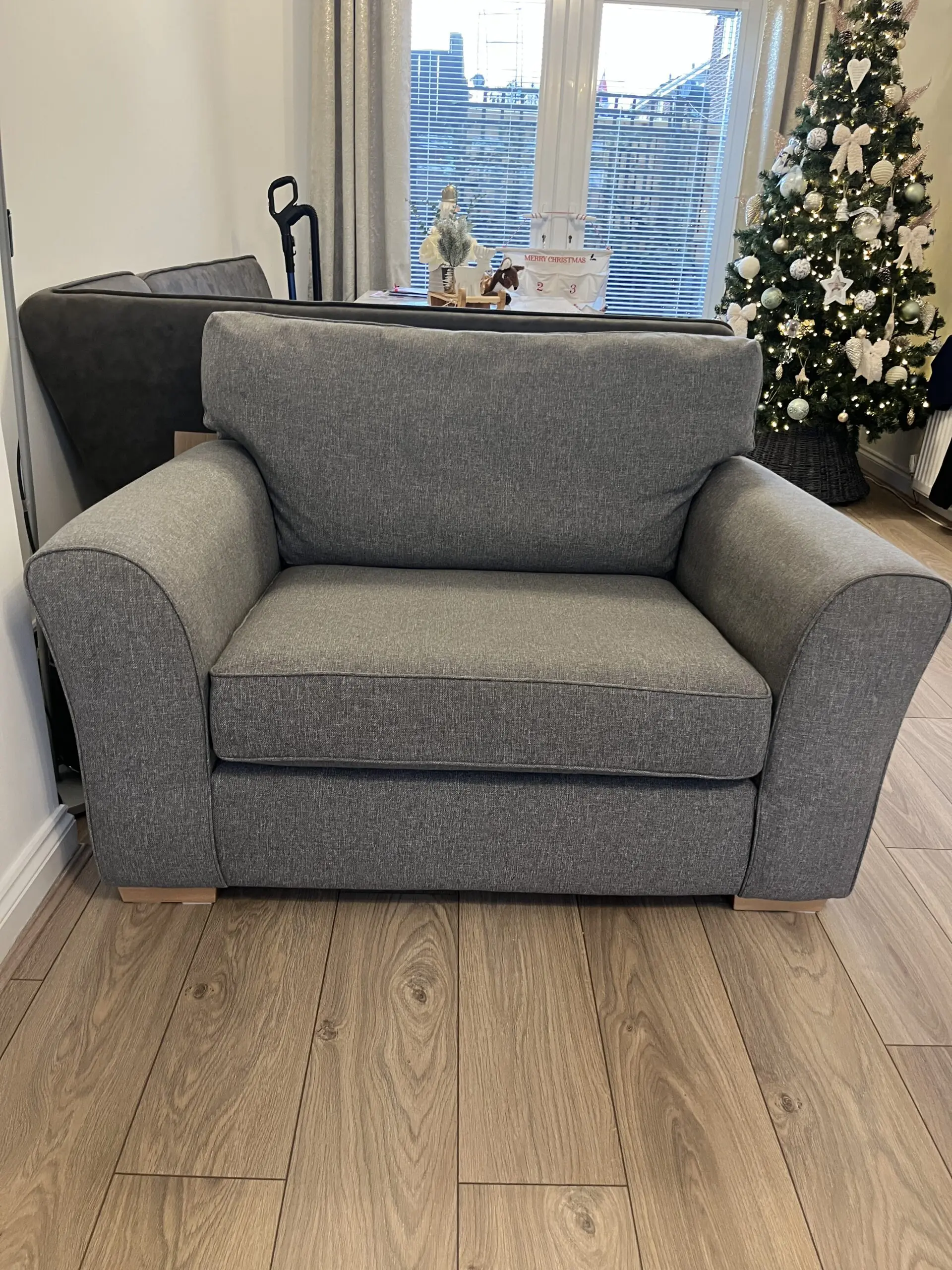 Grey Next 3 seater chase sofa and snuggle chair – light oak feet on sofa