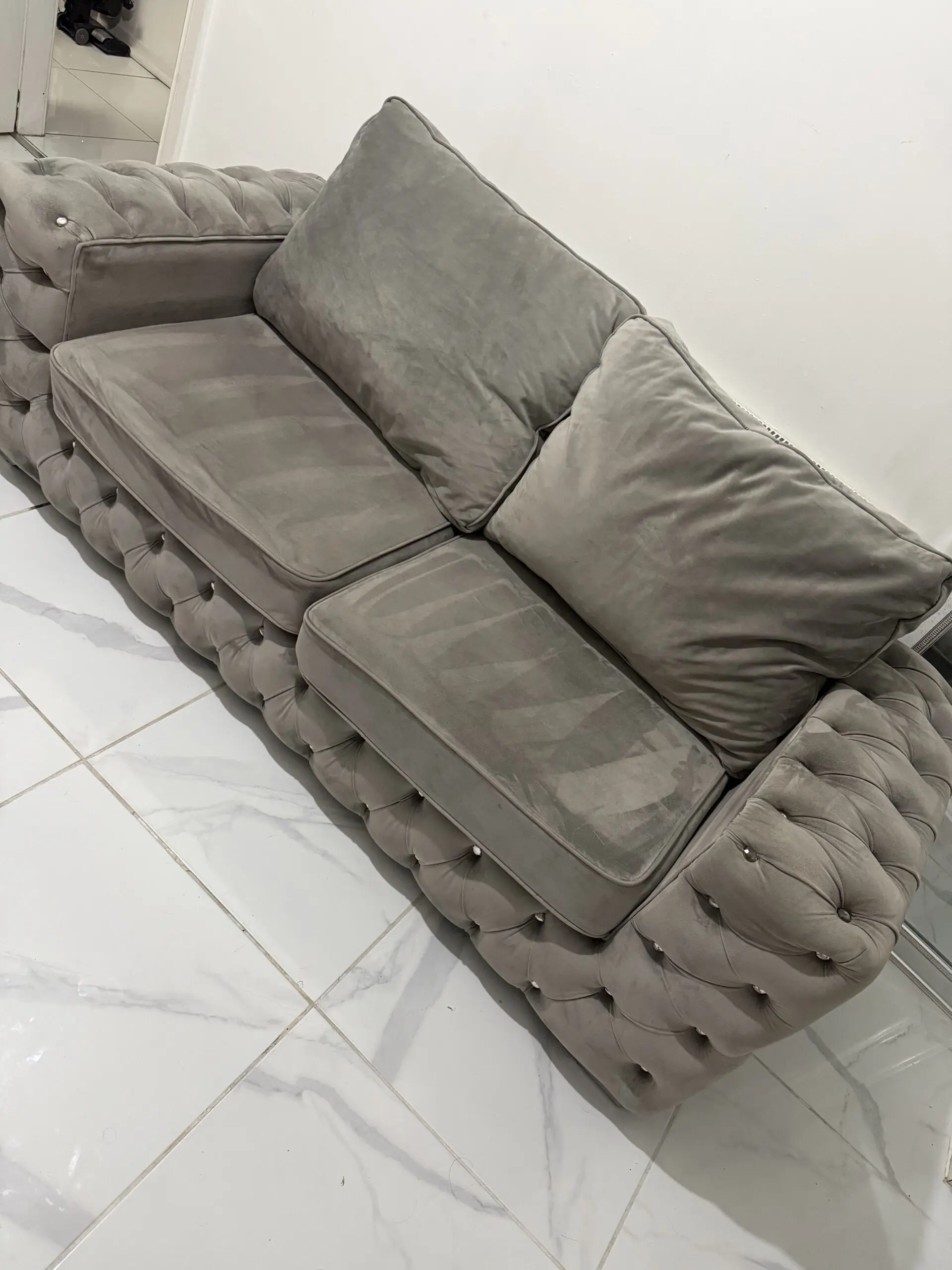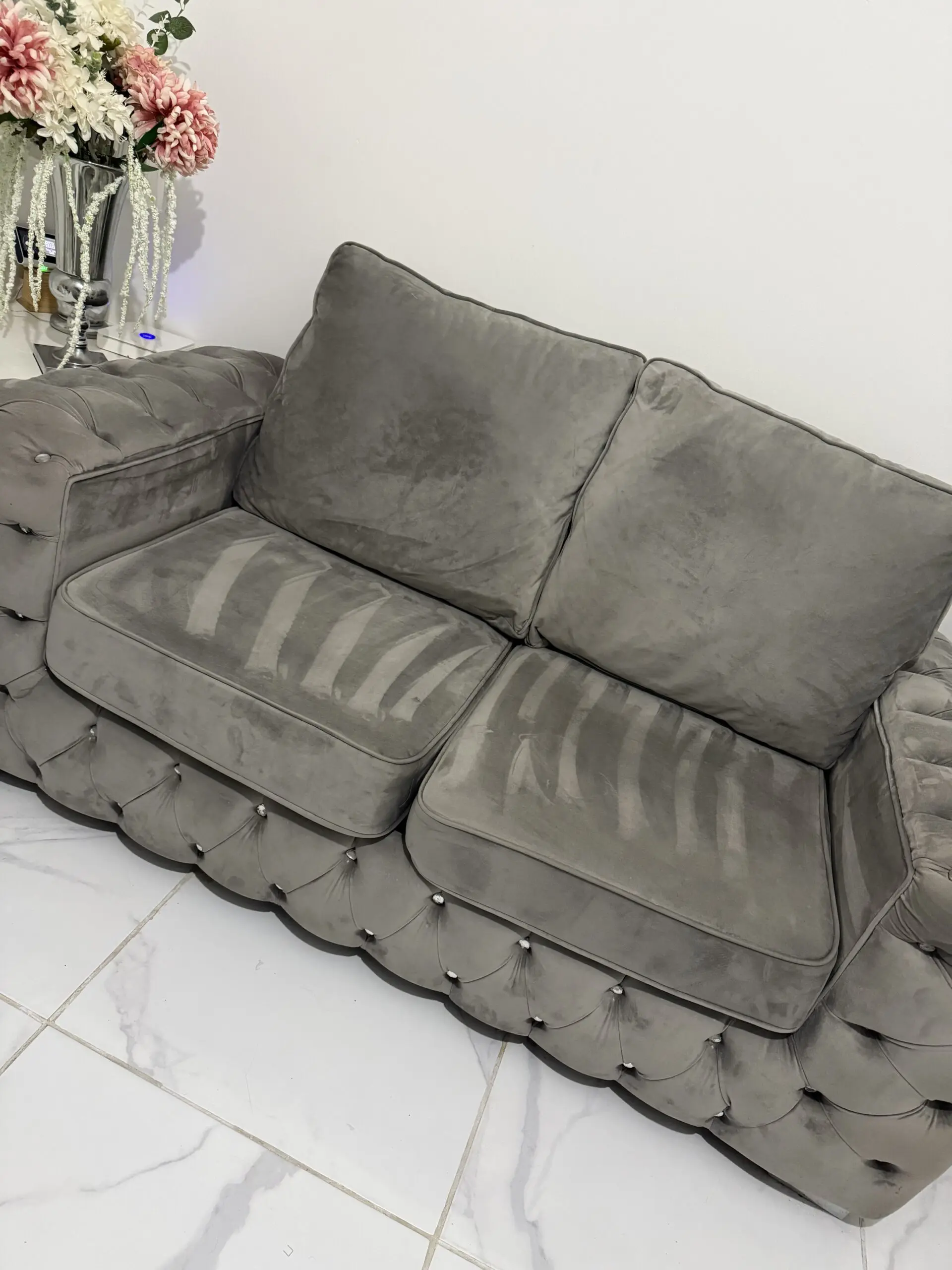 In grey plush velvet material with crystal stud detail and silver mirror feet