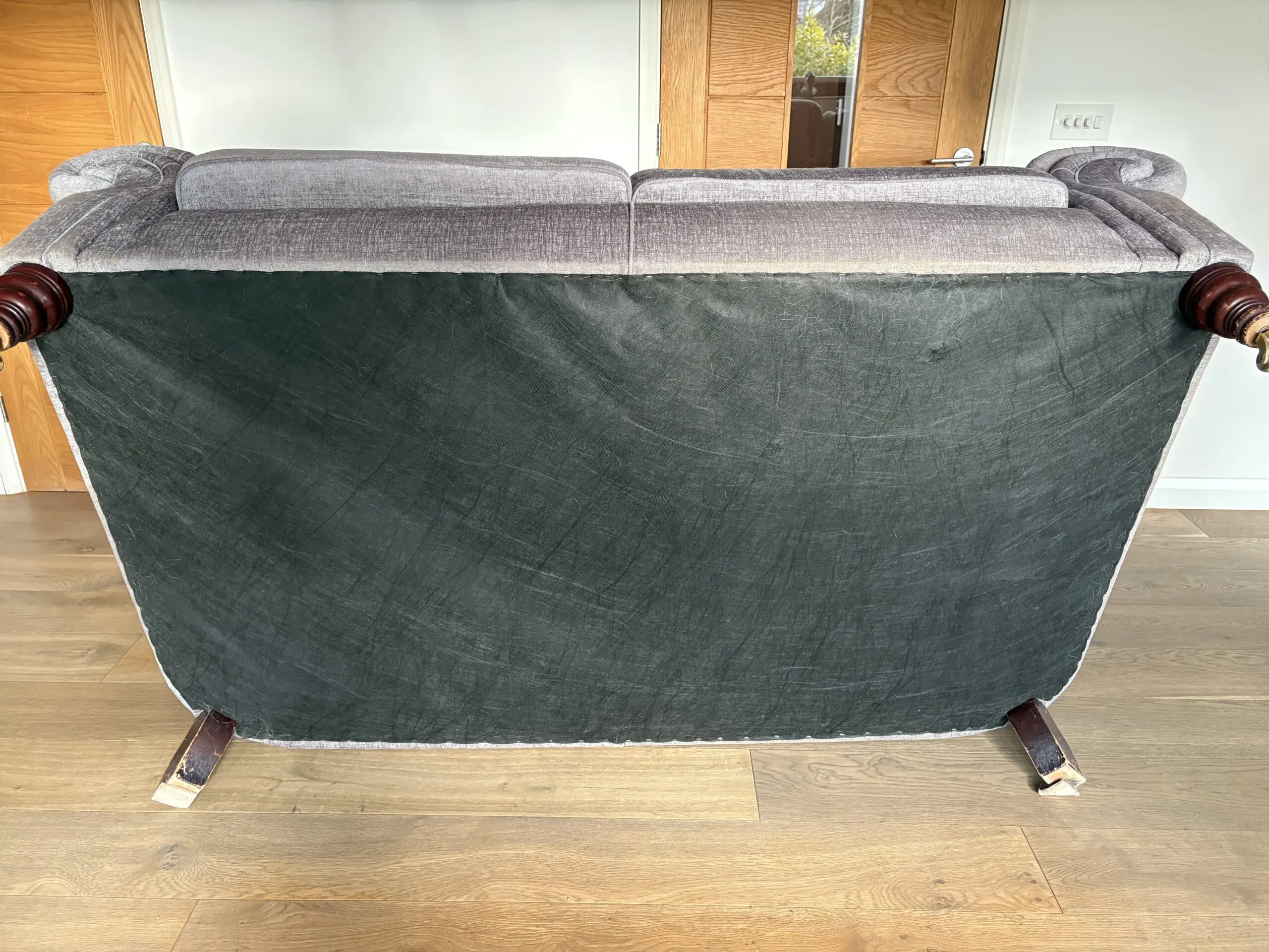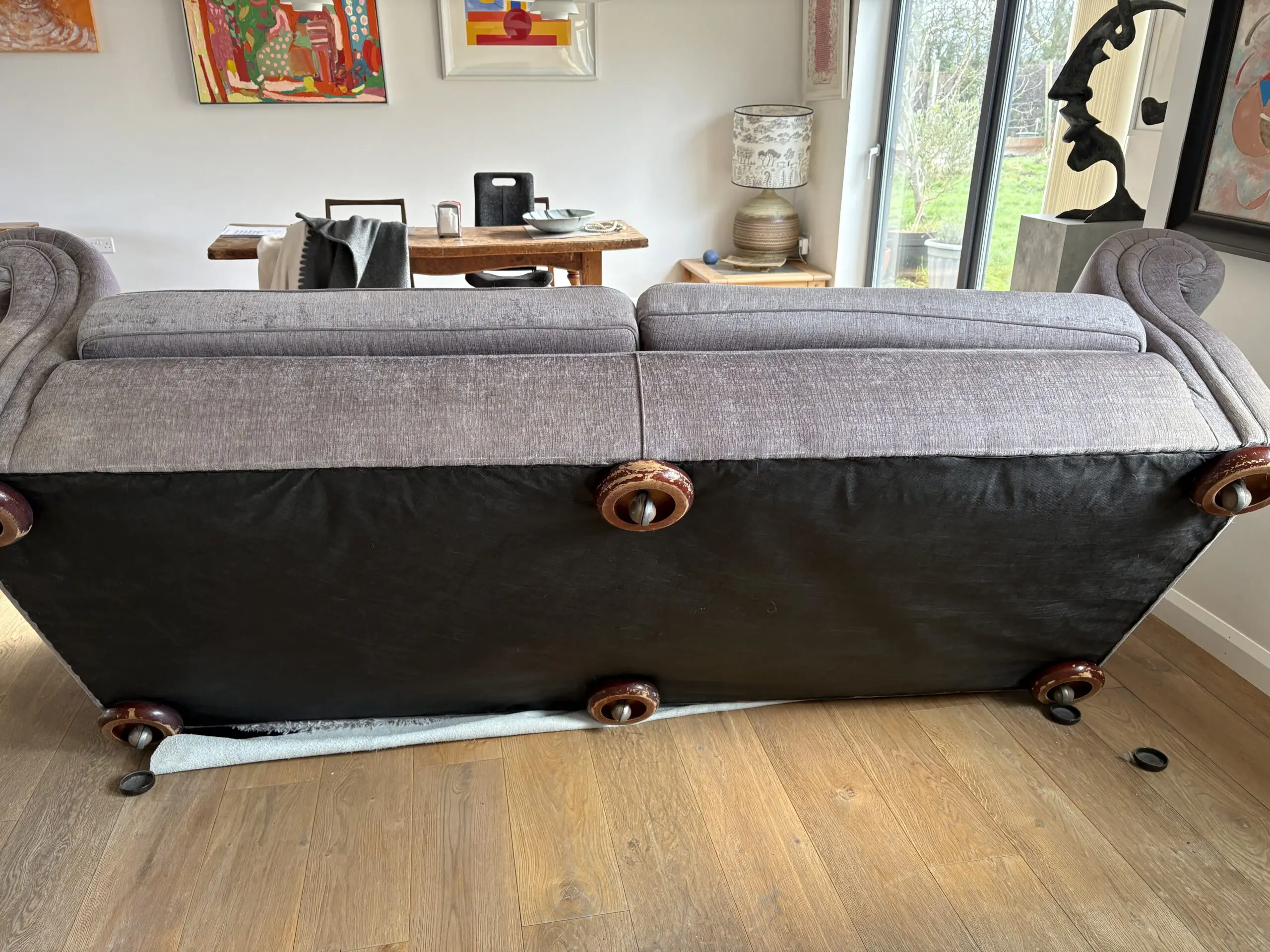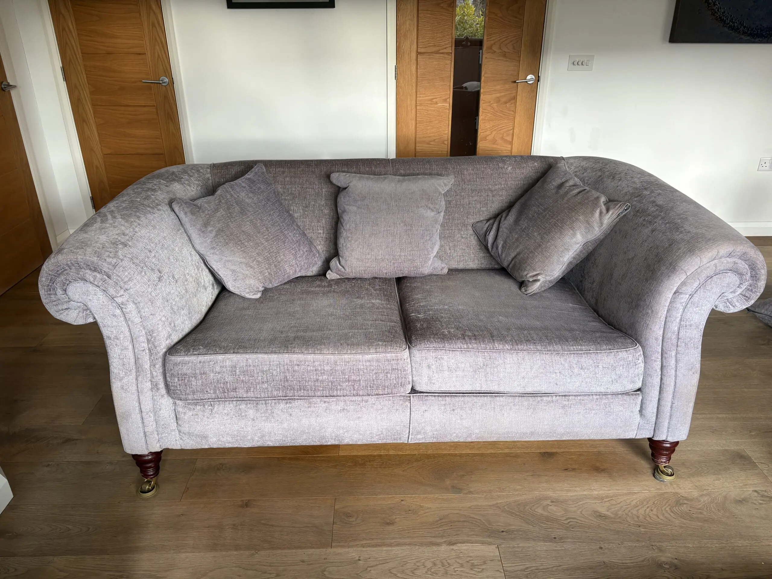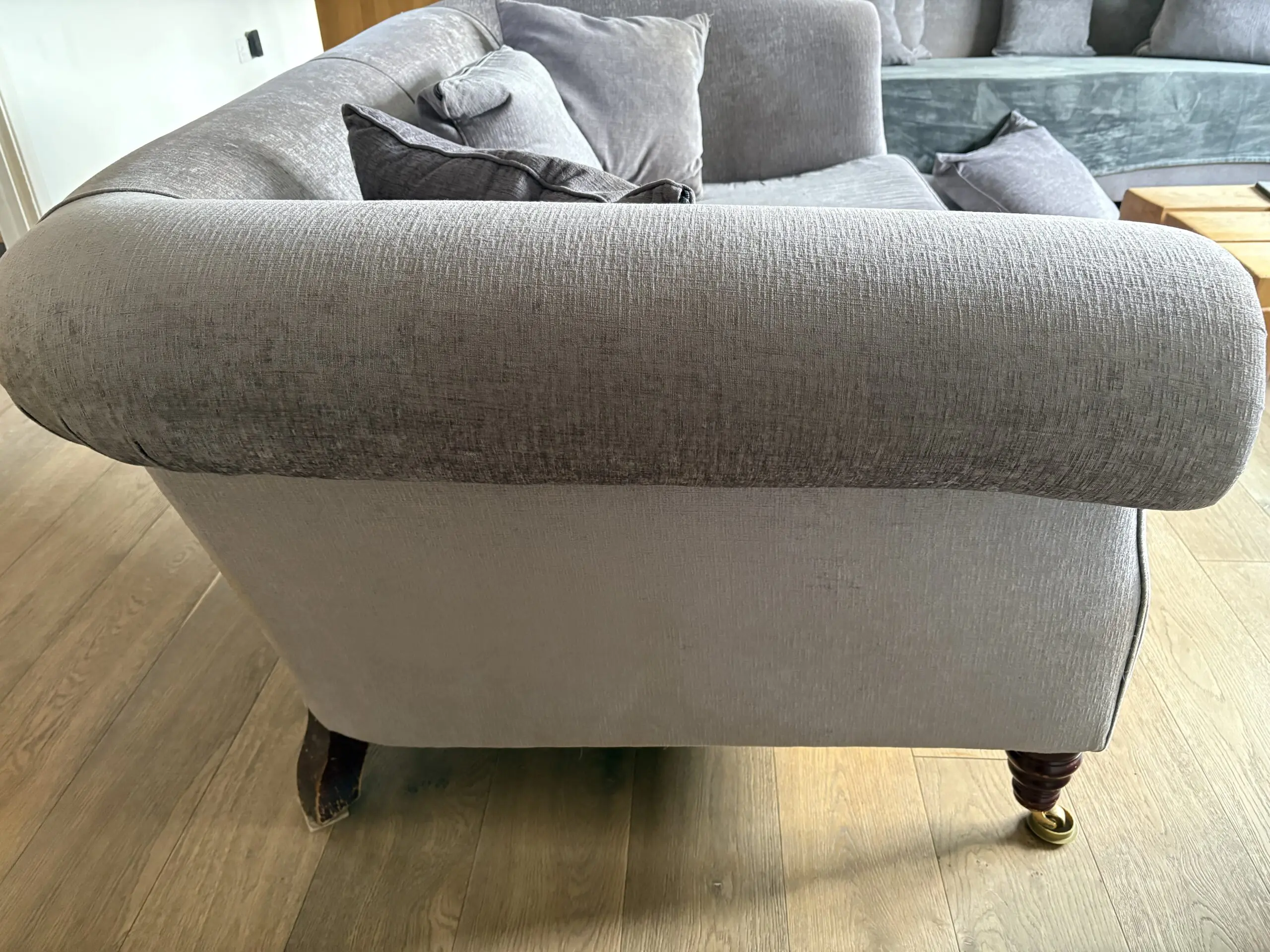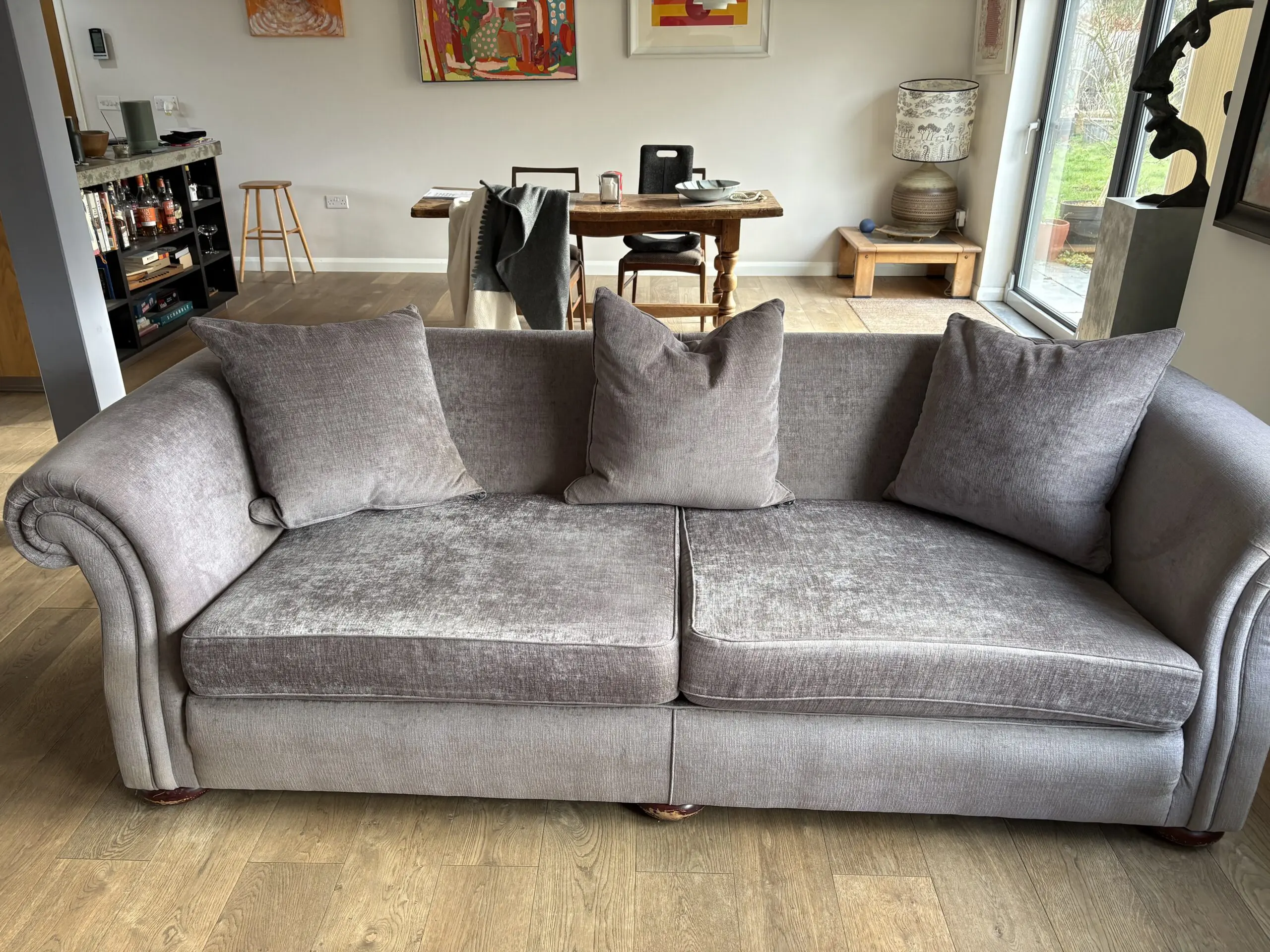 Pair of large grey sofas. Unknown make but of a very good quality. Re-upholstered by Plum with stain resistant velvet type material. Solid peices of furniture. Cushions as per images, same material