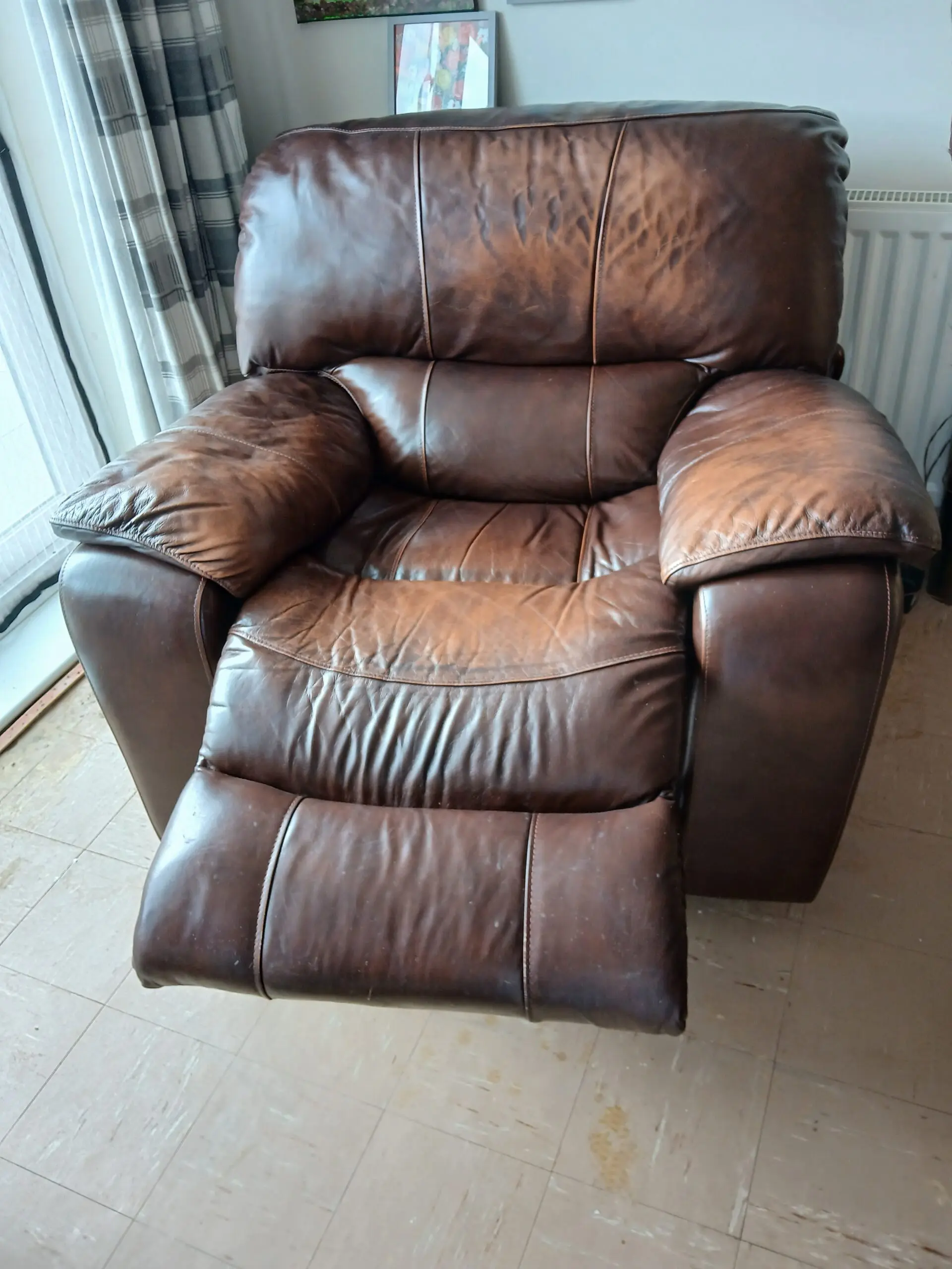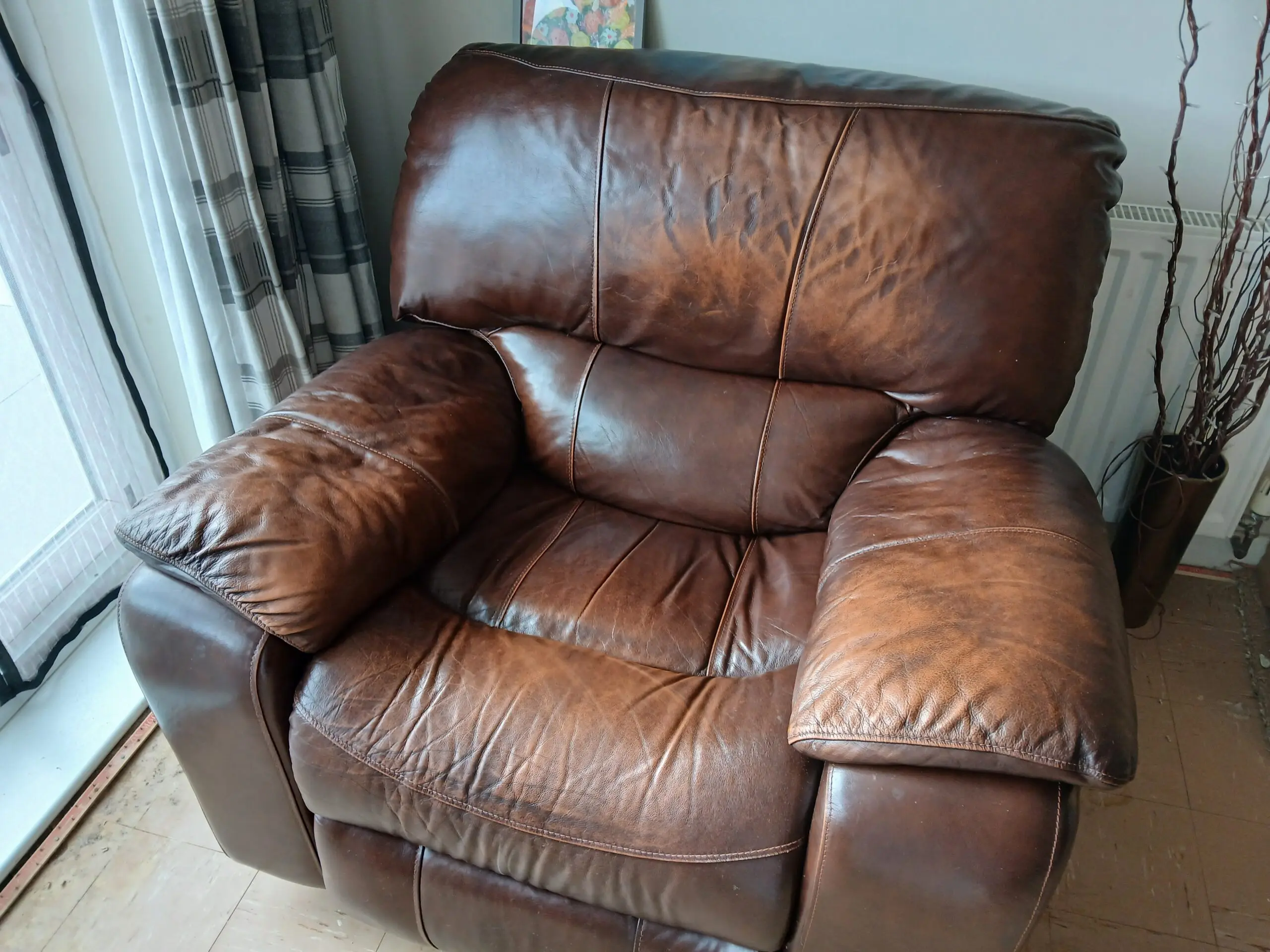 Soft brown leather three seater reclining sofa electric plus one manual reclining armchair