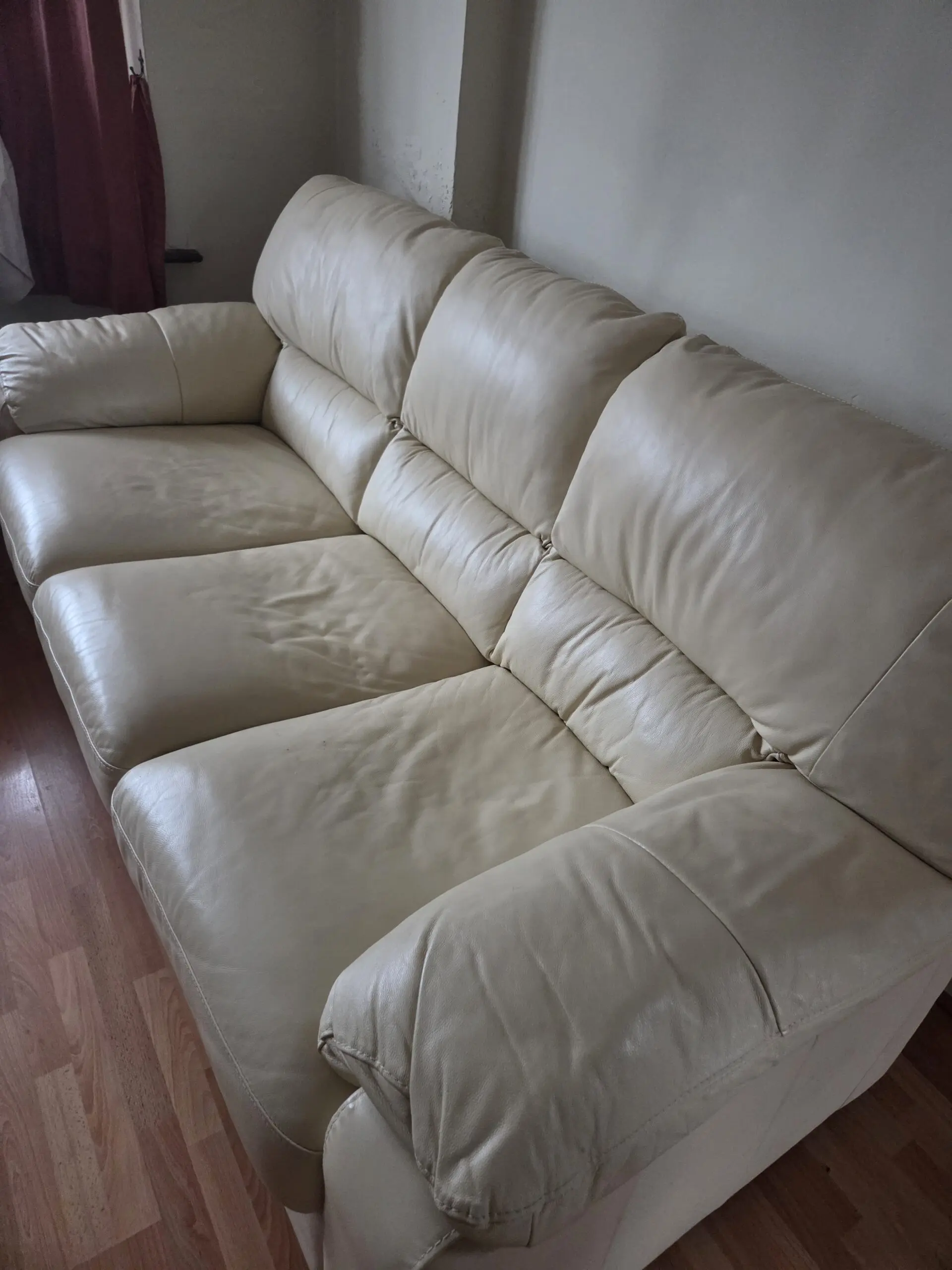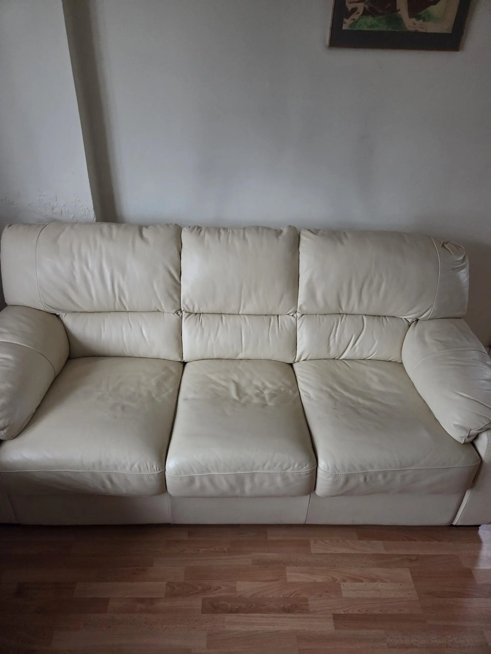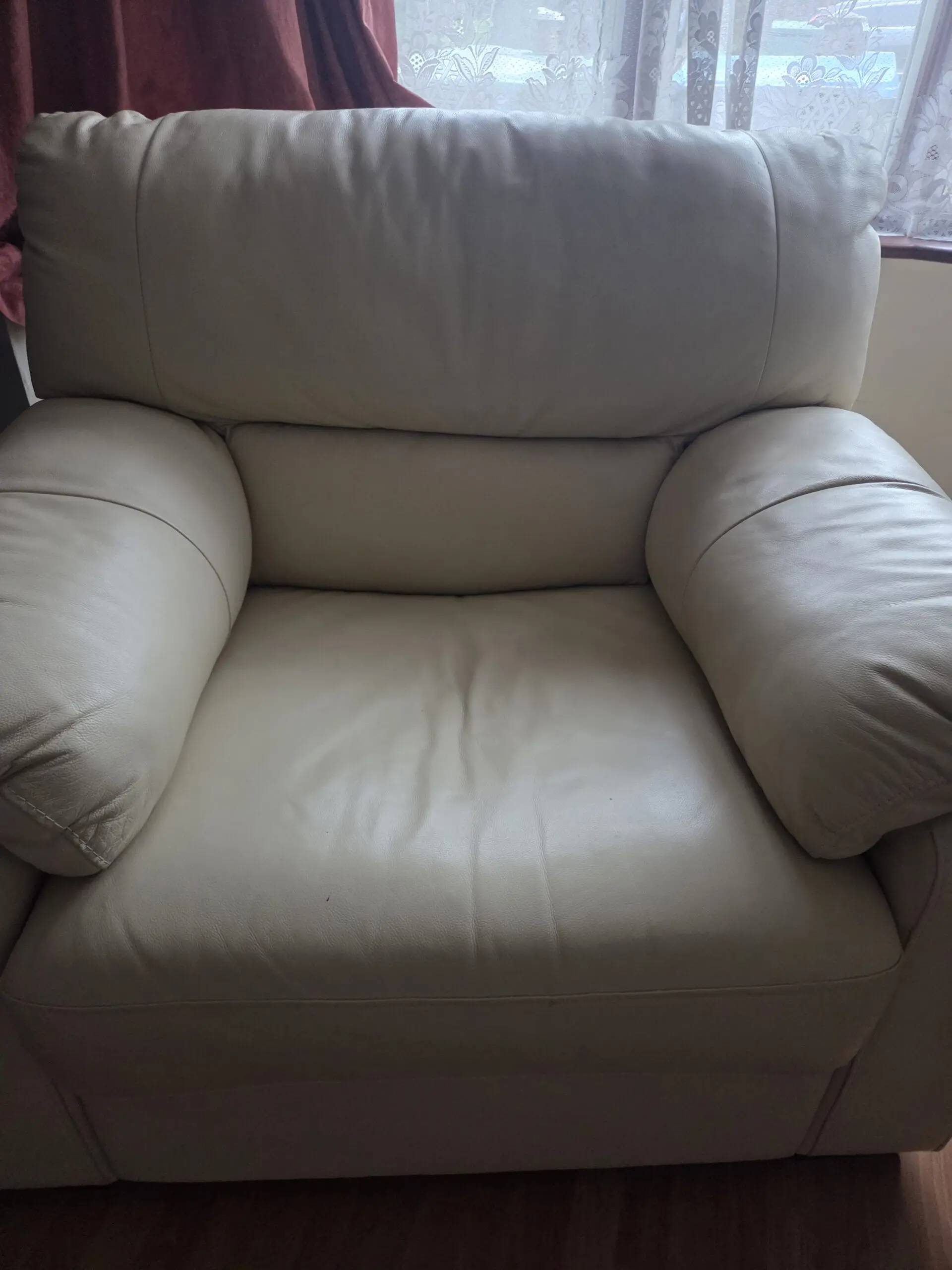 Italian leather sofa, cream coloured. 3 seater sofa and Armchair. Gently Used but good condition.