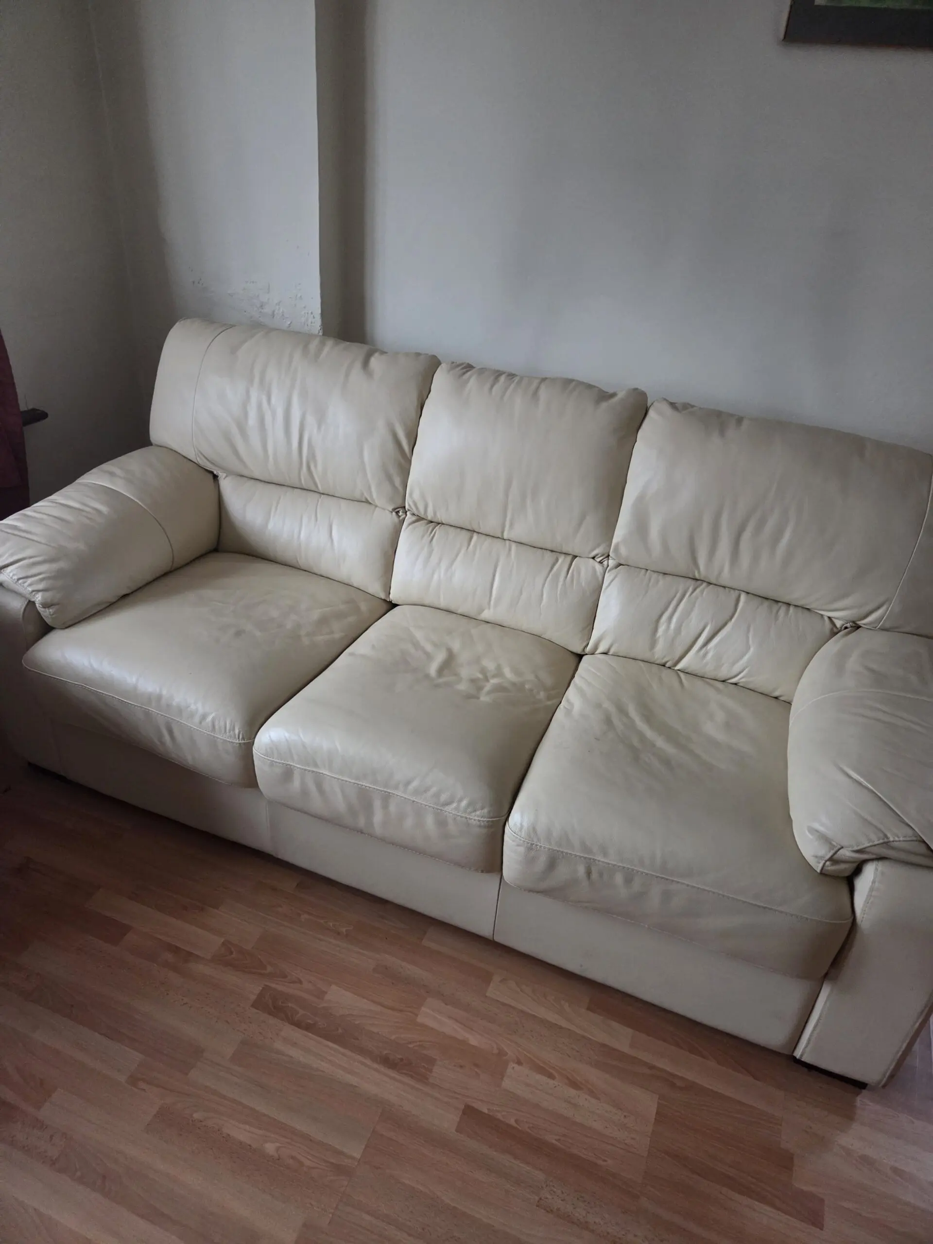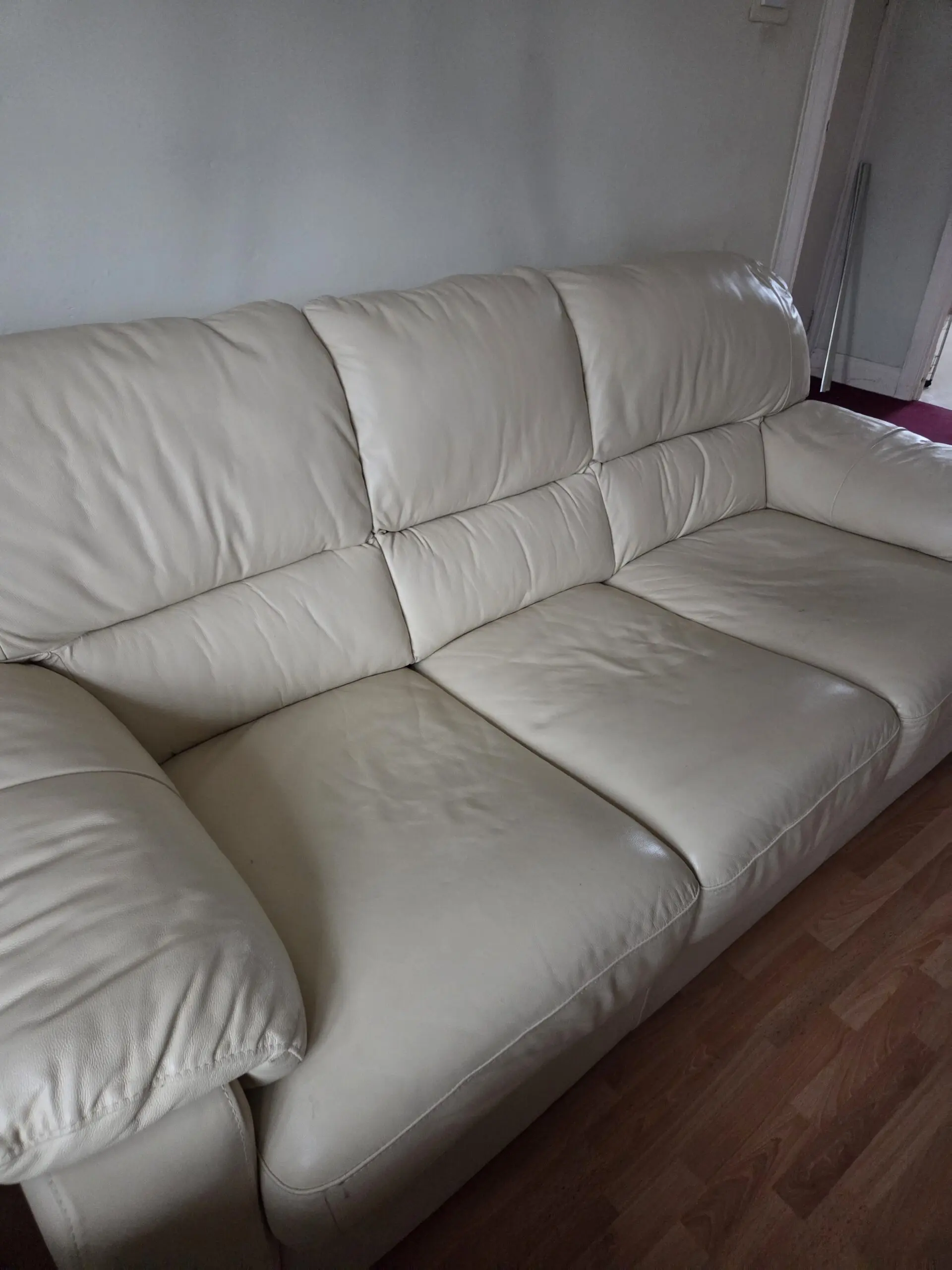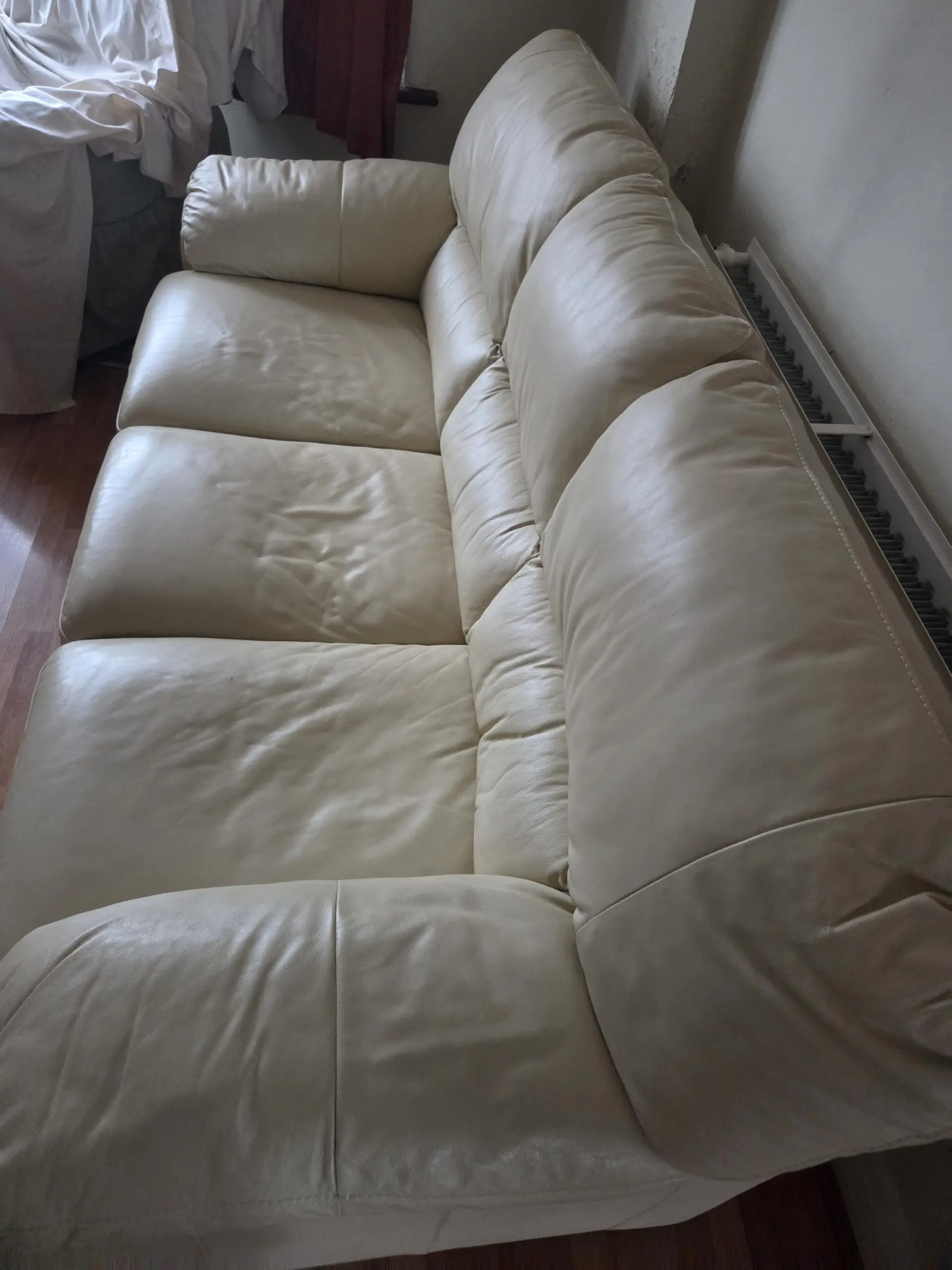 Italian leather sofa, cream coloured. 3 seater sofa and Armchair. Gently Used but good condition.