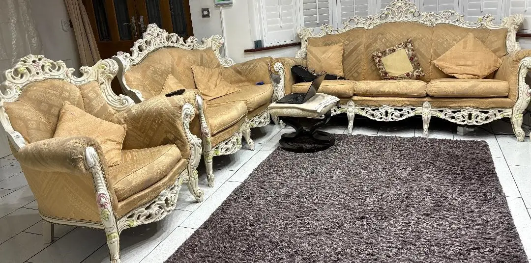 Full set of 3 seater, 2 seater and 1 seater. Italian Sofa from Mondital. Golden colour with carved beige carved border. Unique design and looks very different from ordinary sofa sets
