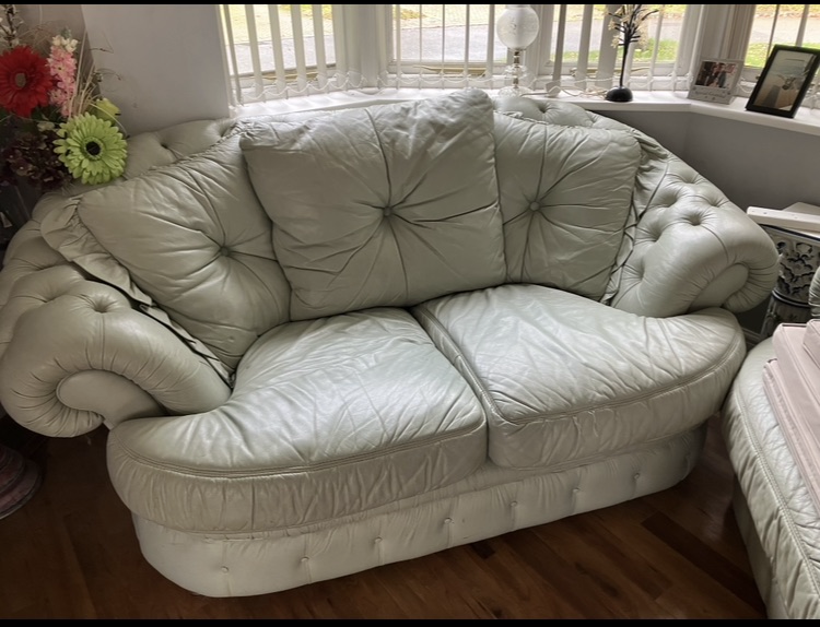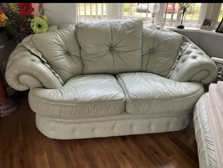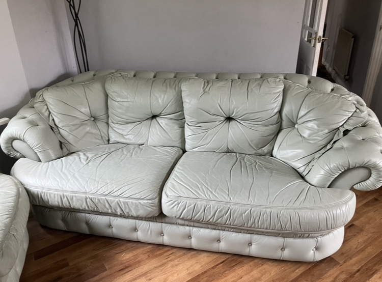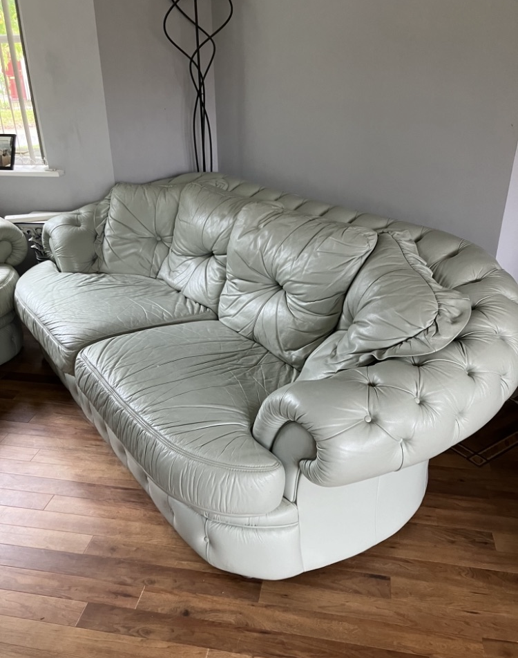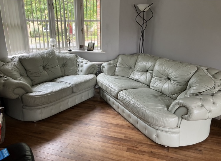 Matching two and three seater sofas. Light Green. All covers zip off for easy clean, as shown in pictures. Very good condition with only occasional use. Fire safety labels.