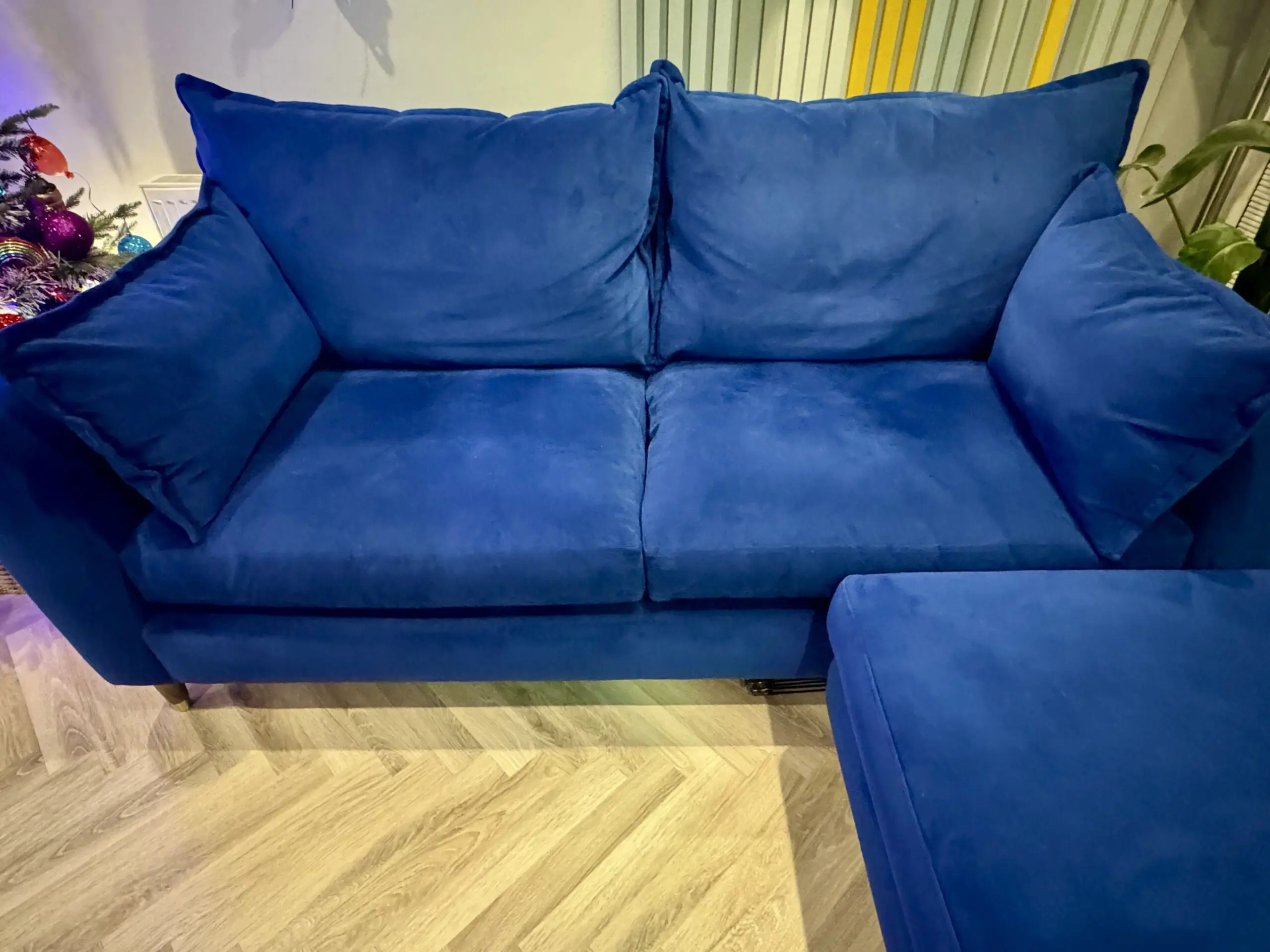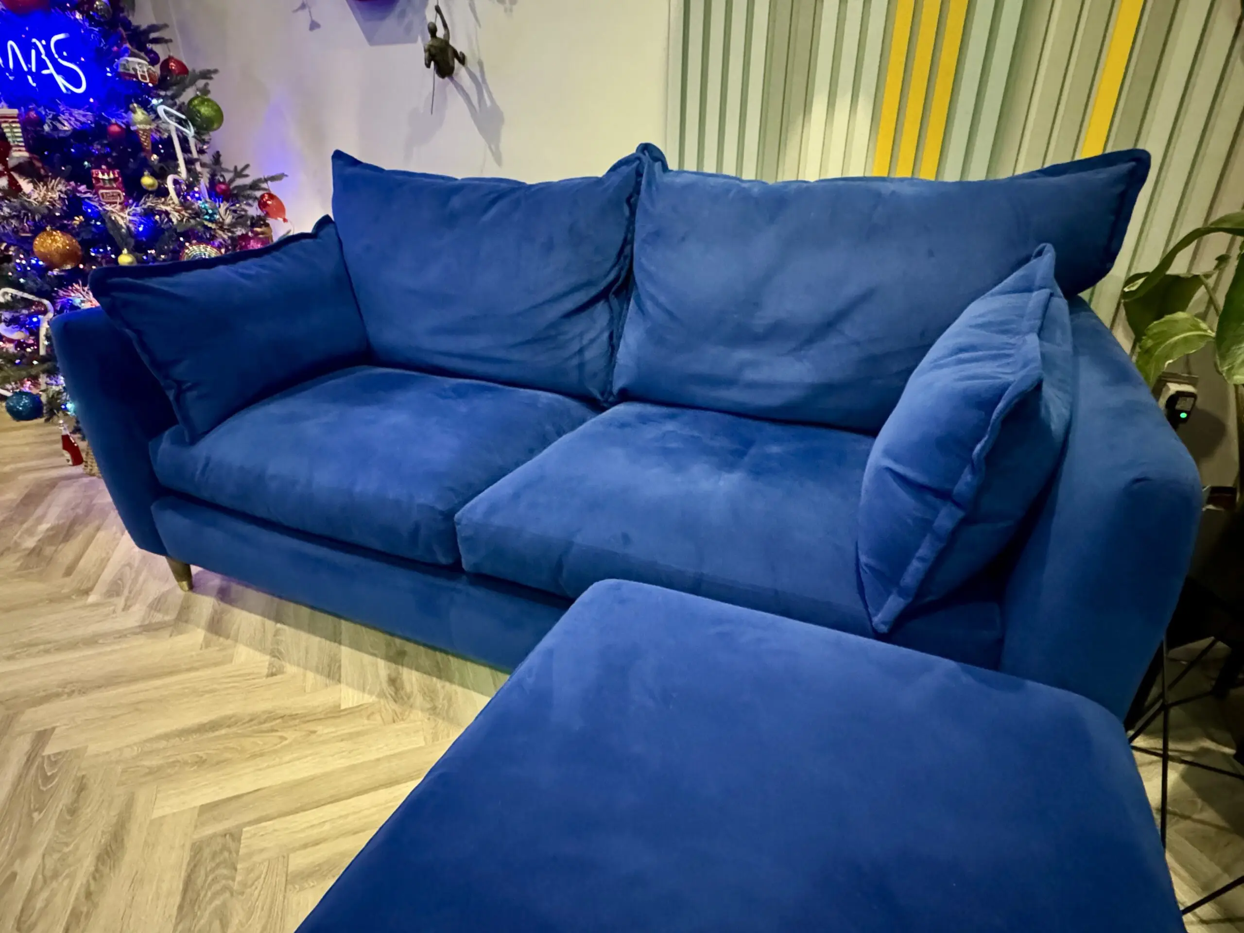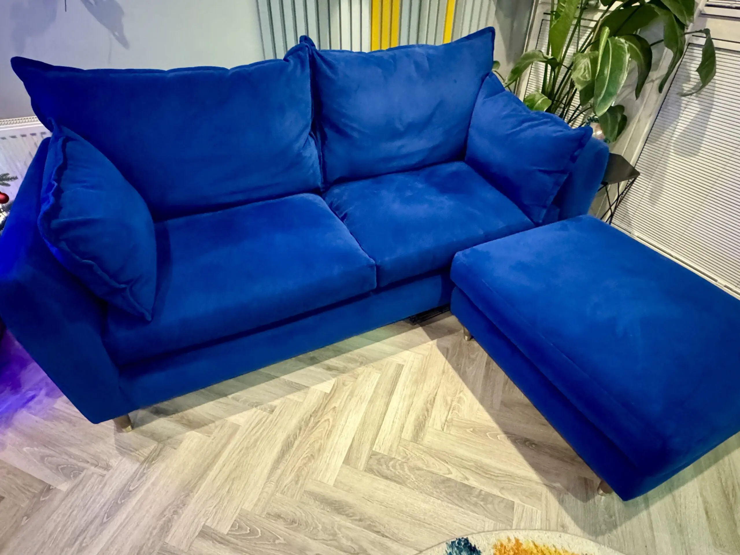 Stylish and comfortable Charlotte sofa in rich royal blue crushed velvet. Oversized cushions with Oxford style borders and soft hollowfibre filling give a cosy, relaxed feel. Slim arms and neat proportions keep the design compact while still offering a generous seating area.