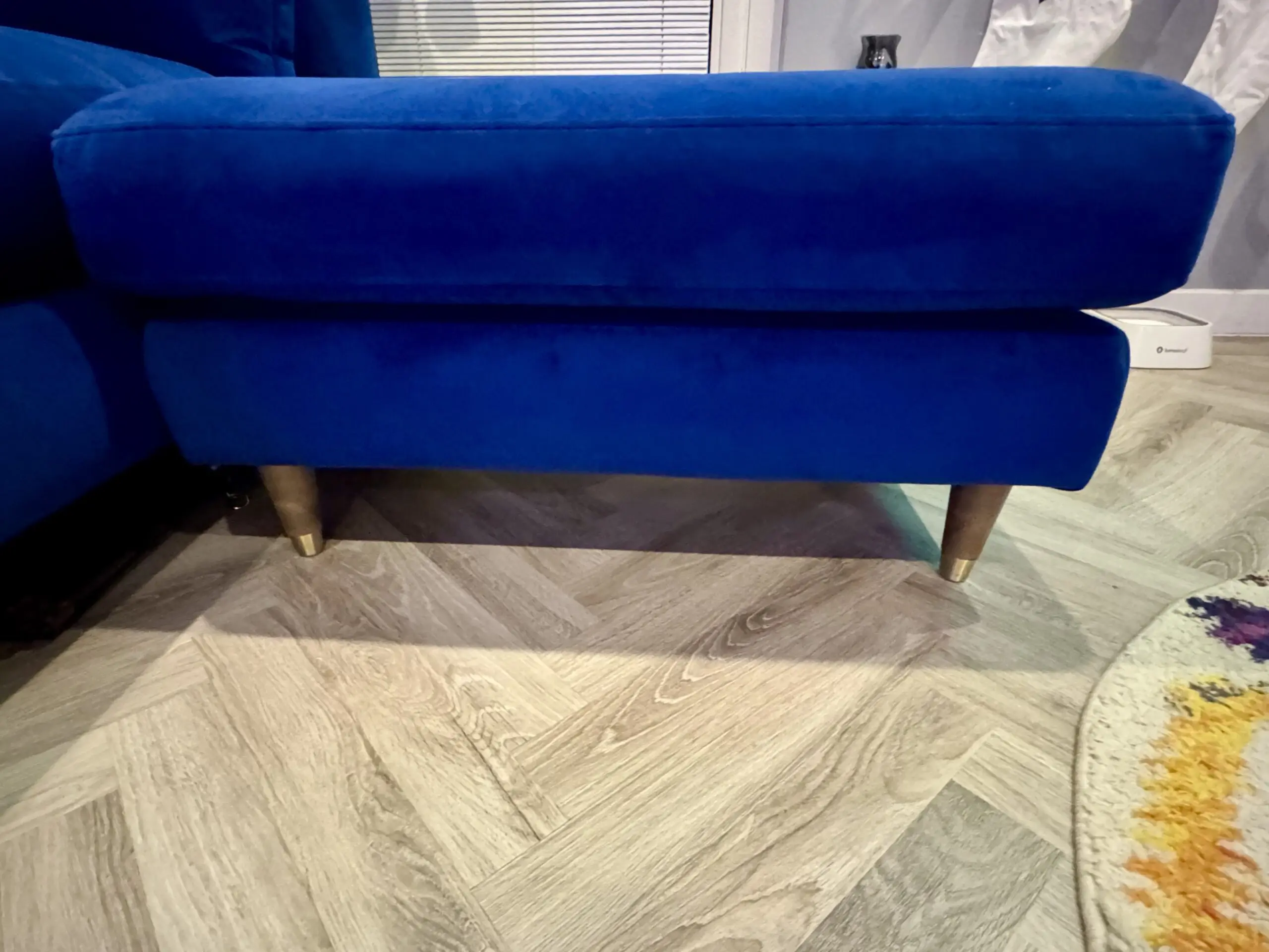 The matching footstool is the same height as the sofa, so you can line it up to create an L shape or a large lounging setup. Walnut legs with brass capped tips complete the look. Excellent condition. Selling only because I am moving house.