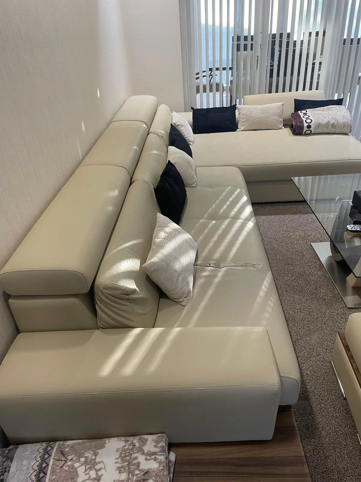 Modern cream leather corner sofa with matching ottoman/footstool.