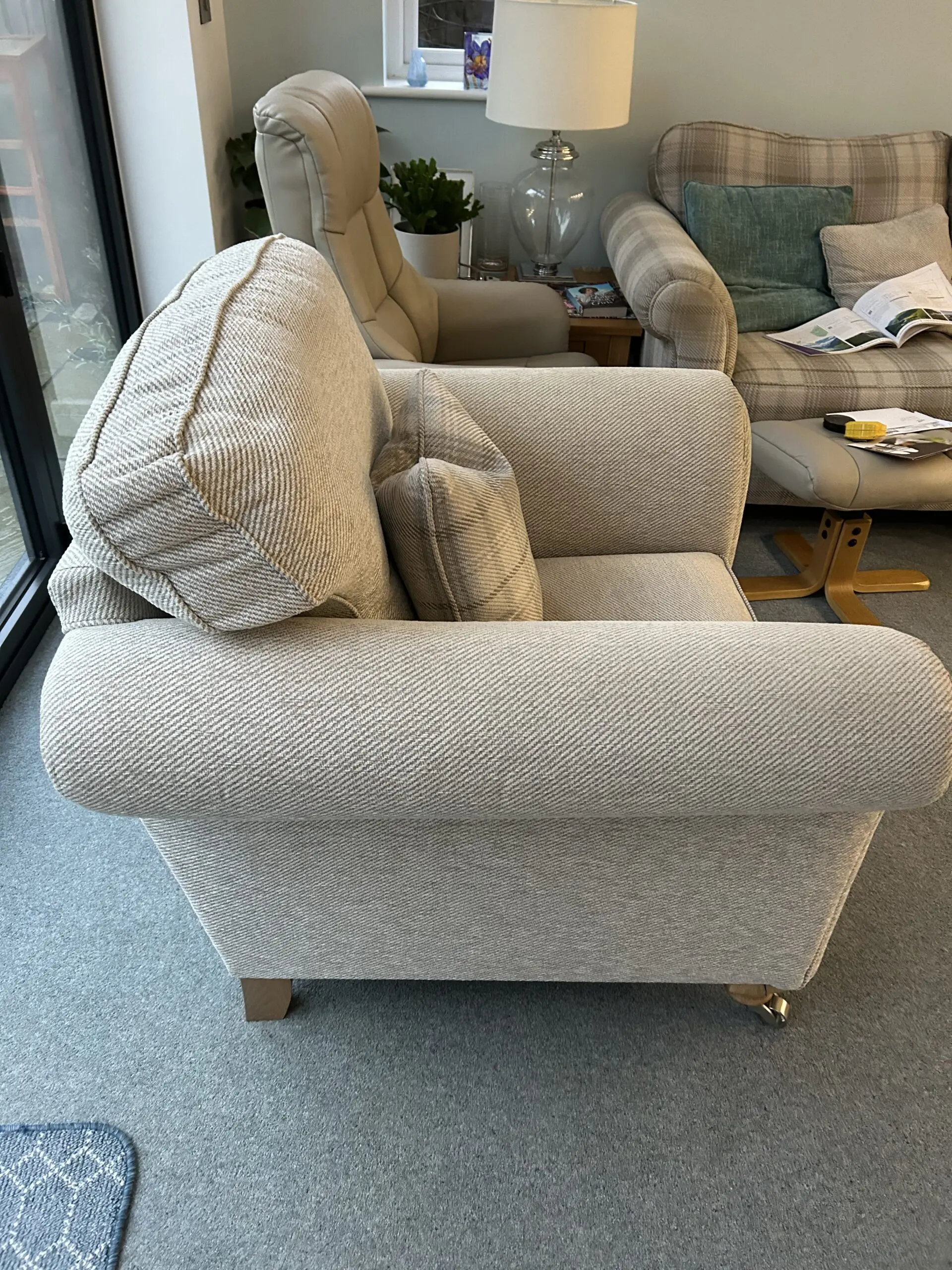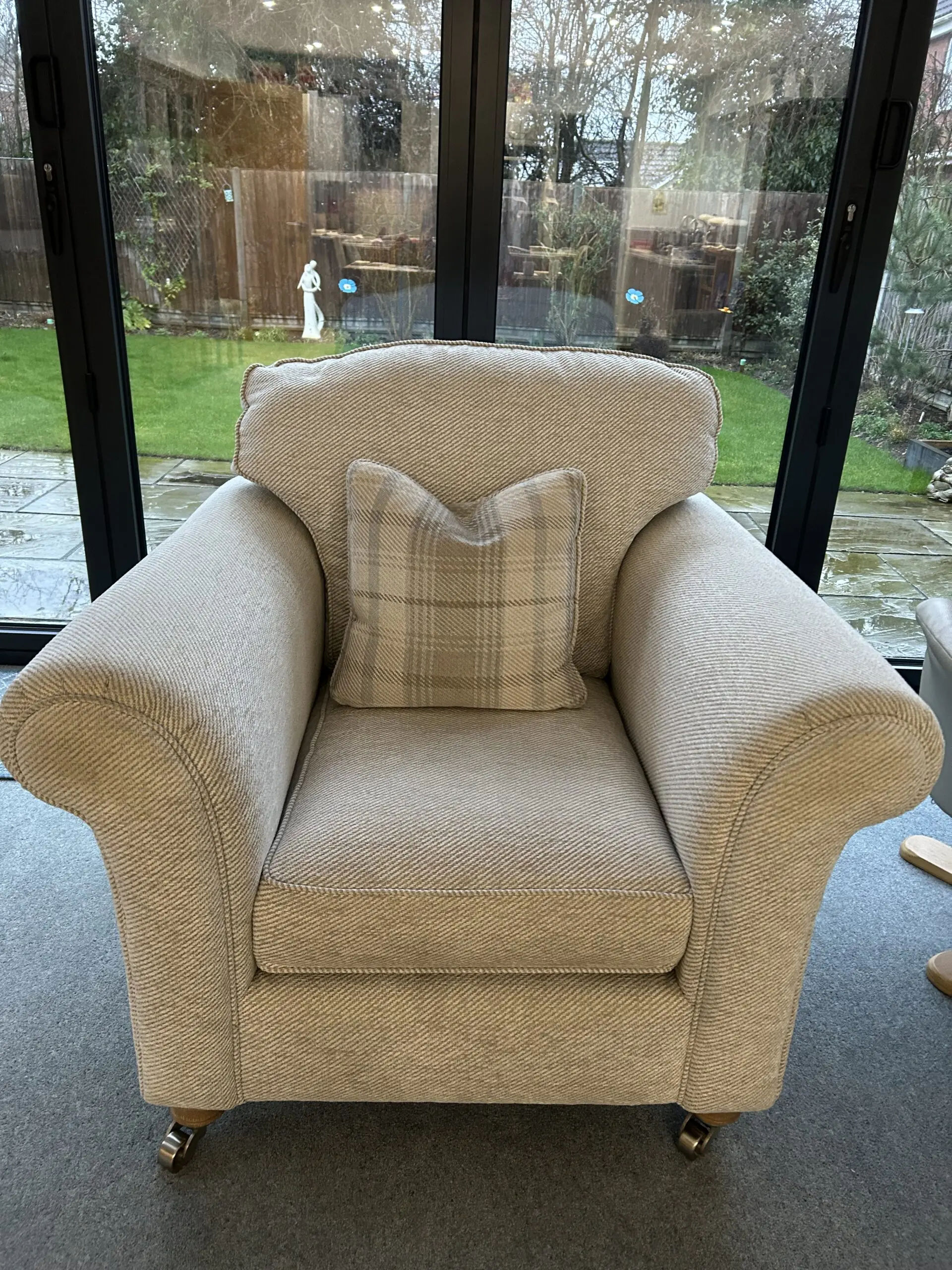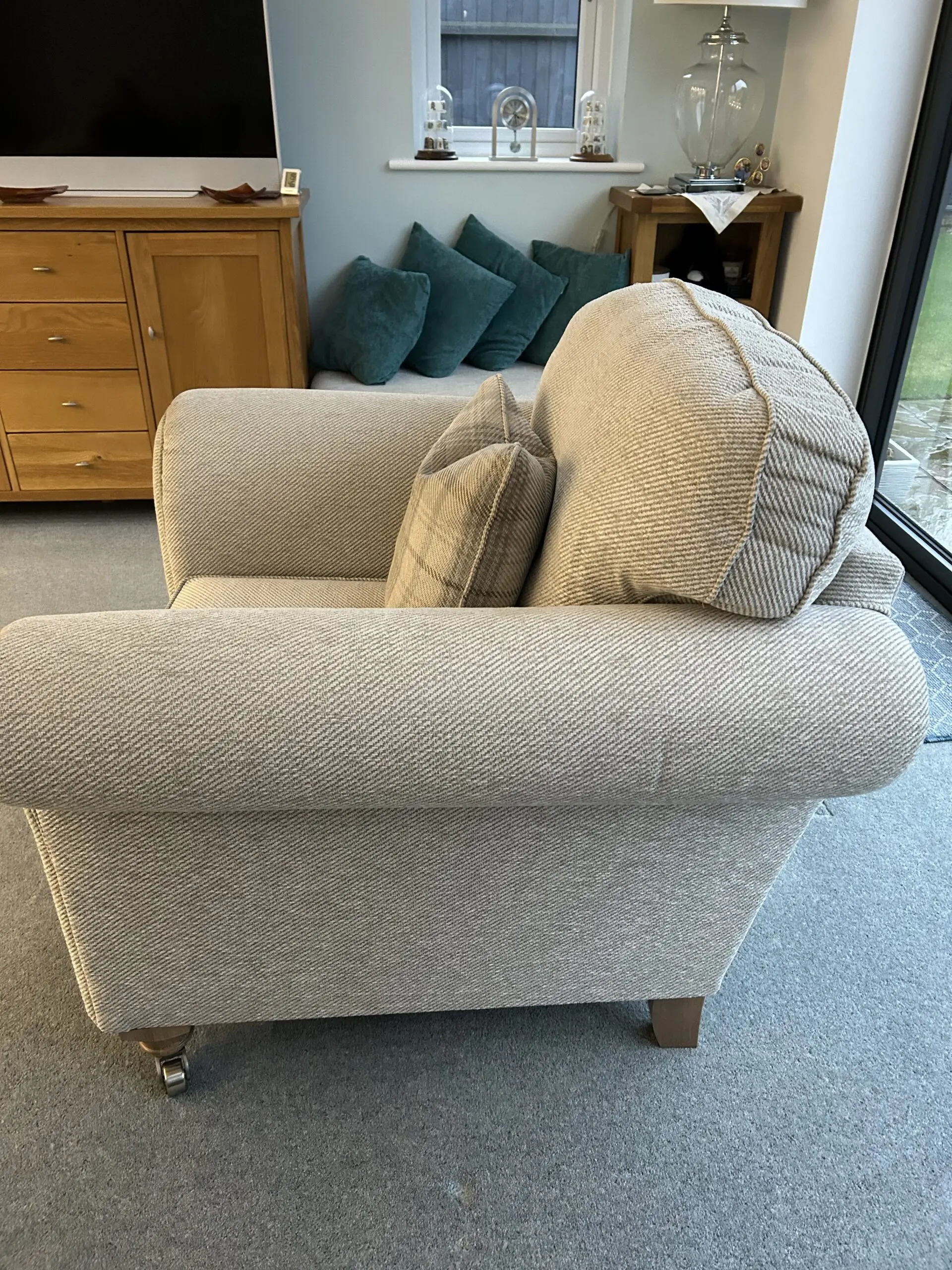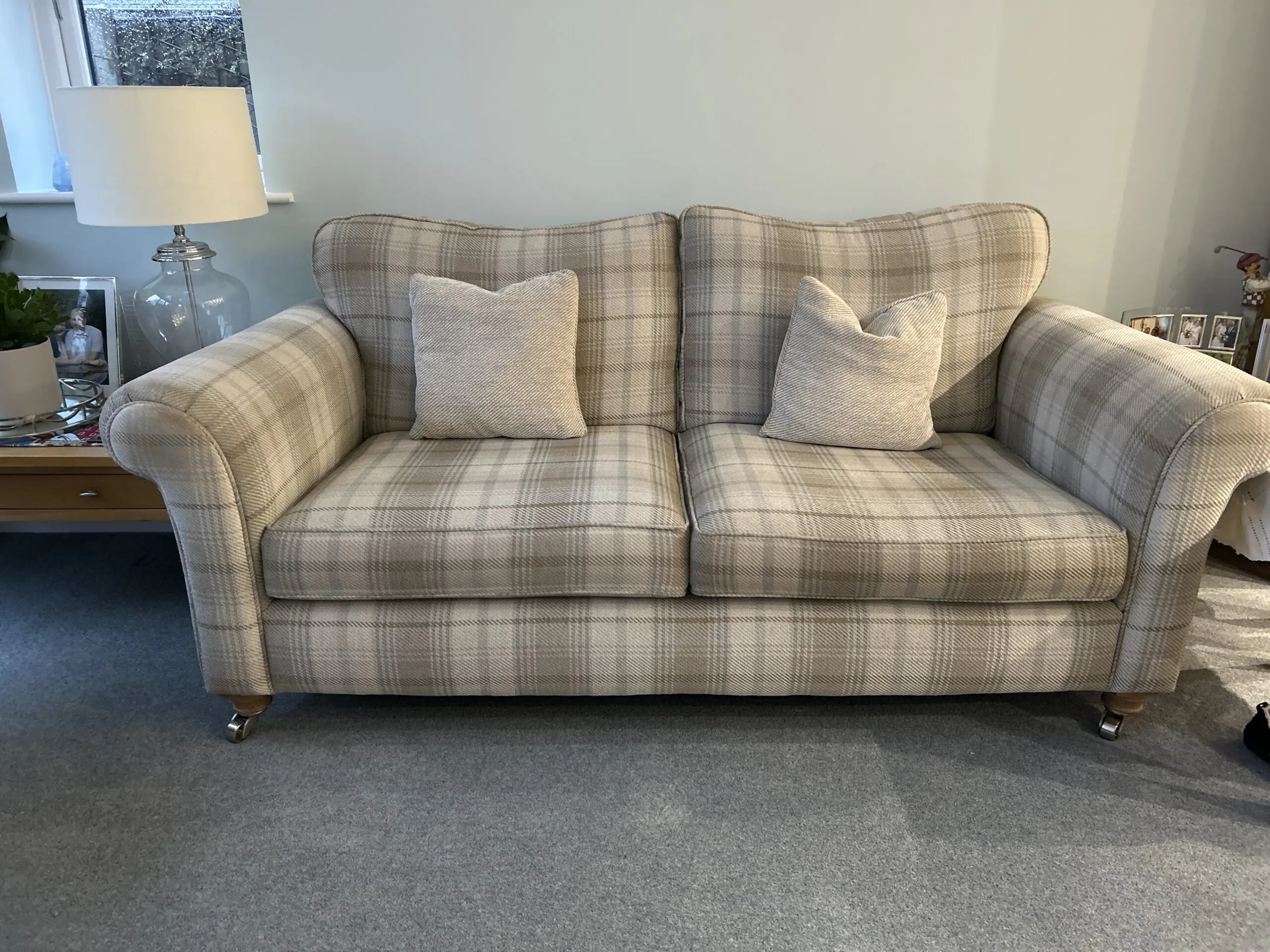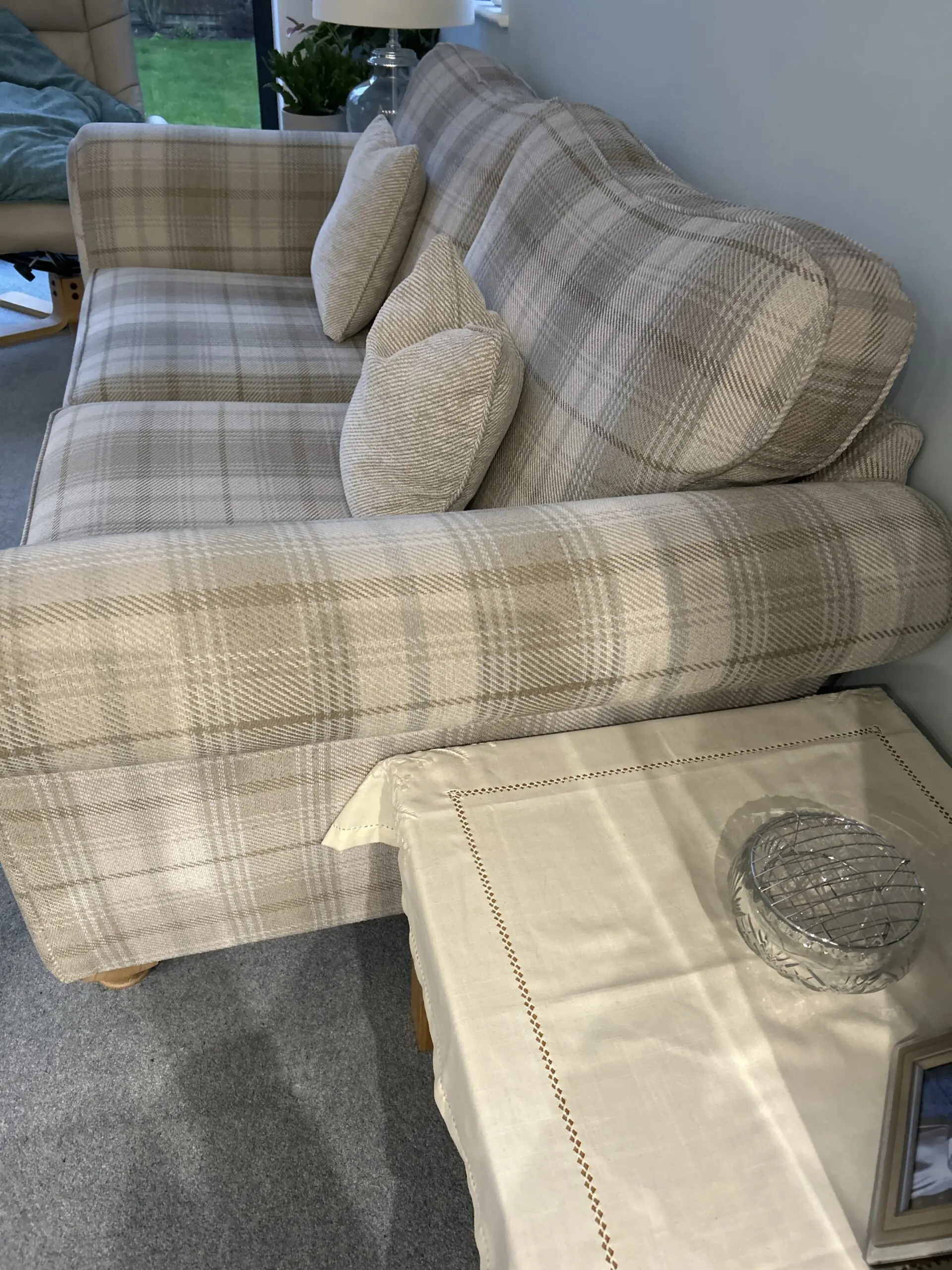 Beautiful sofa and chair with three matching cushions. Pet and smoke free environment. Staincare was obtained at purchase. 15 year guarantee still valid but not sure if can be transferred on sale. Well kept and all maintenance advice has been followed,