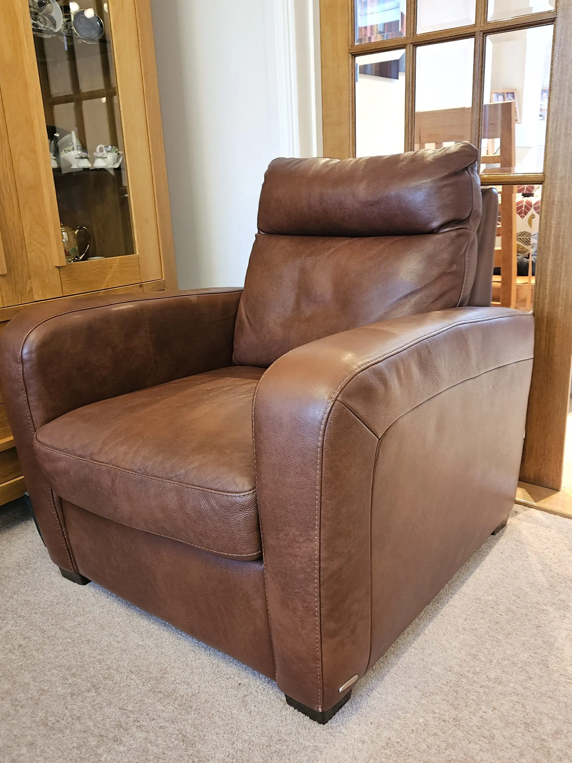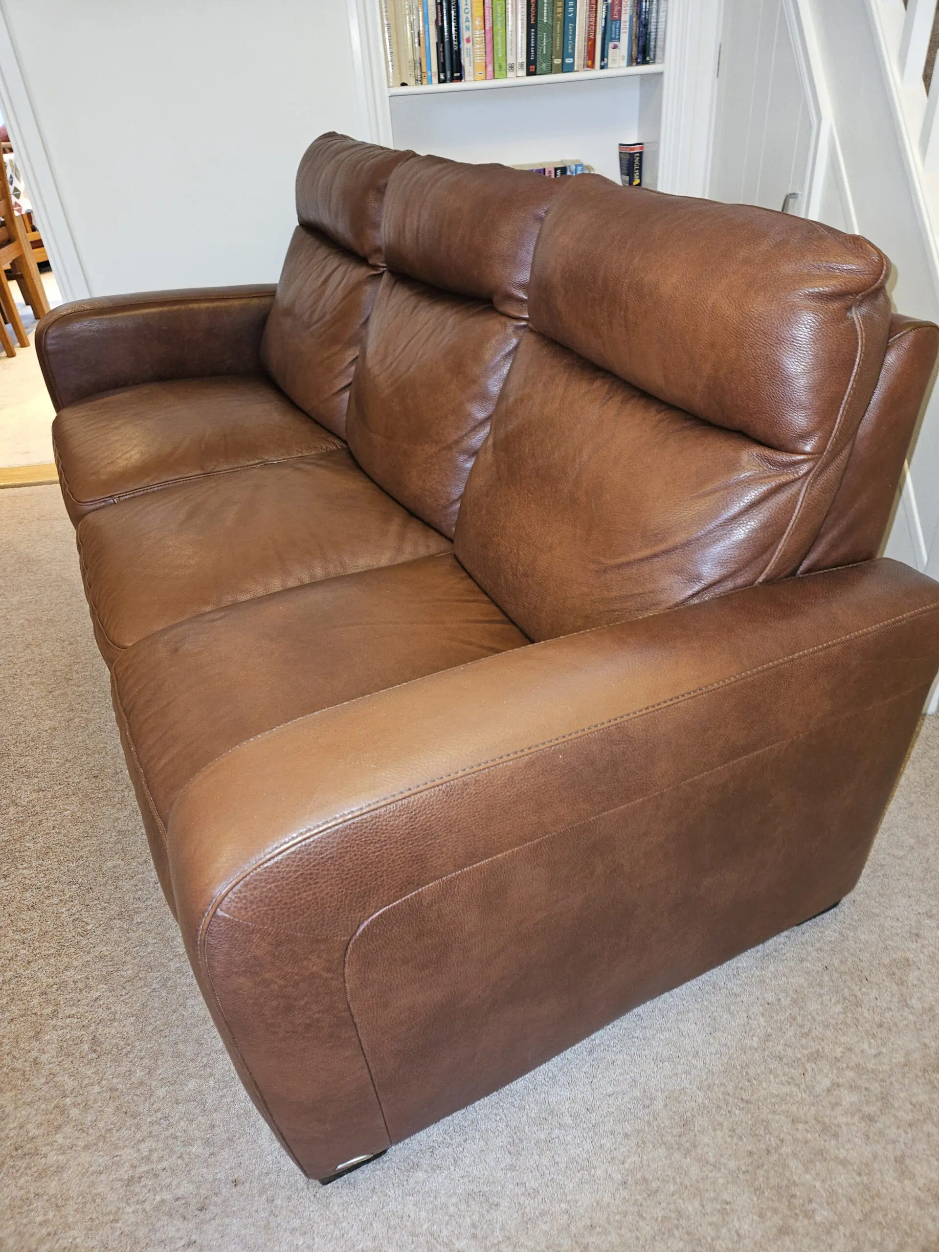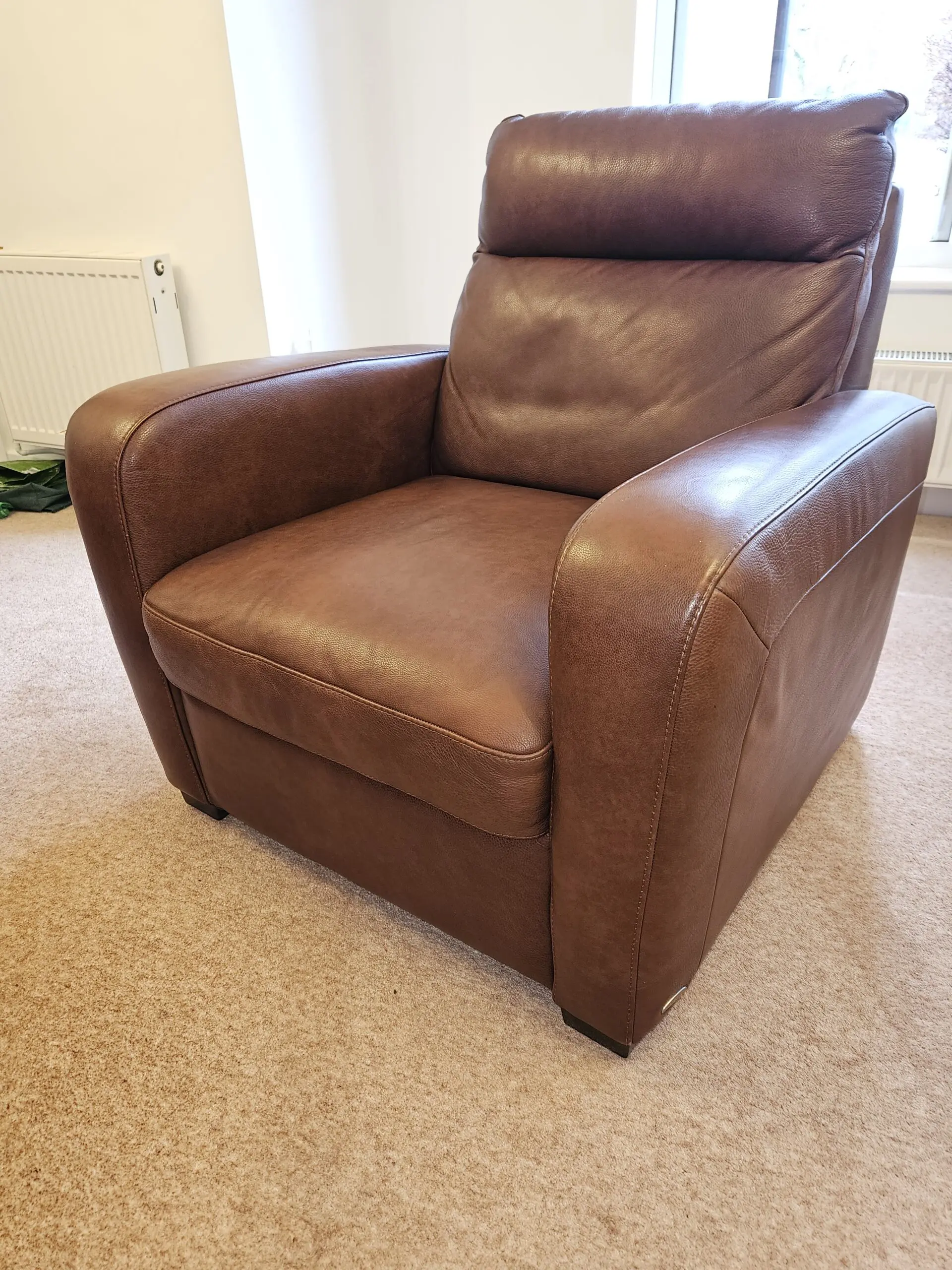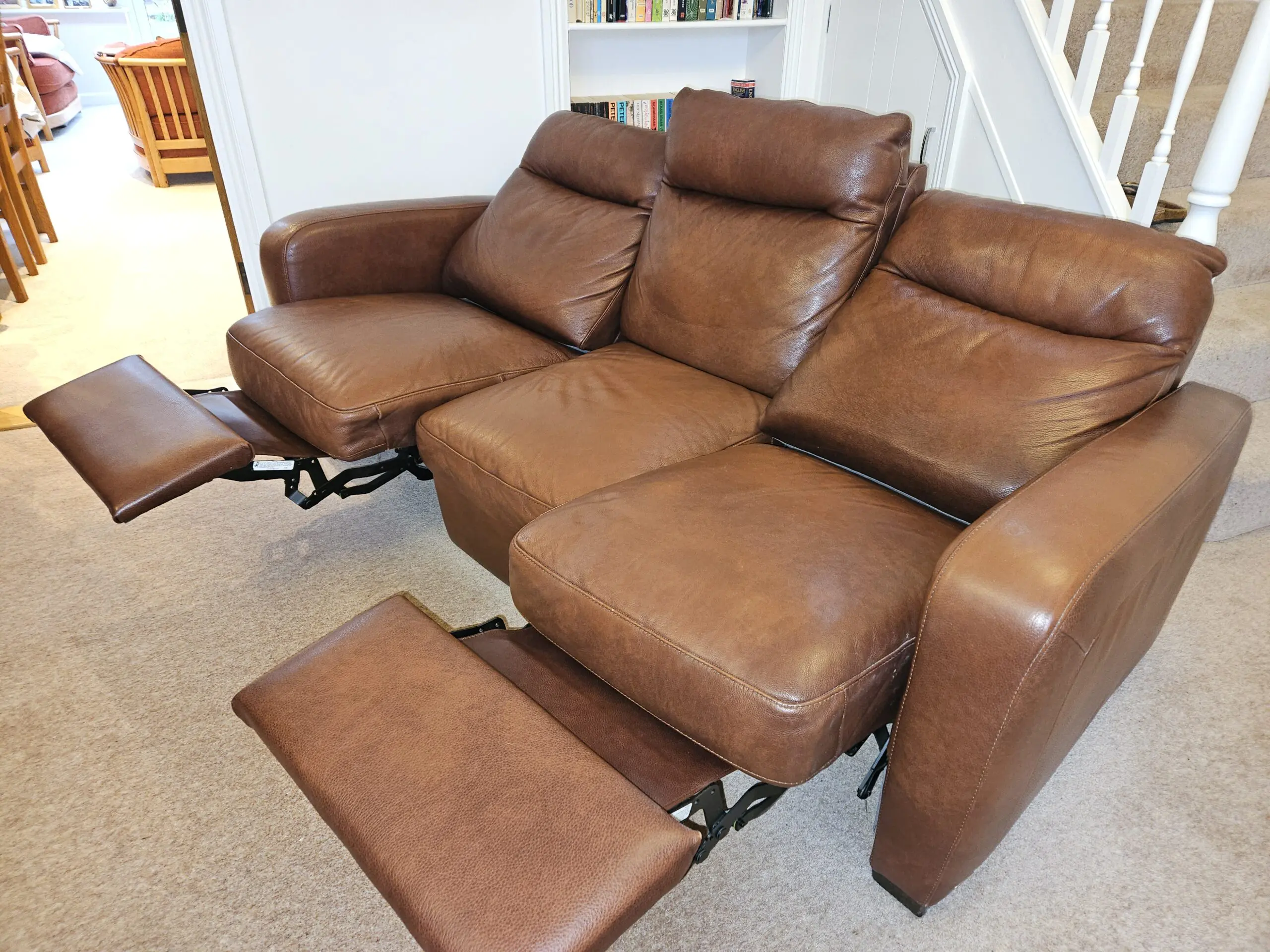 3 seater sofa, manual recliner at either end, plus two static chairs. All italian leather. Seat cushion webbing has been professionally tightened and foam added where needed. From non smoking household with no pets.