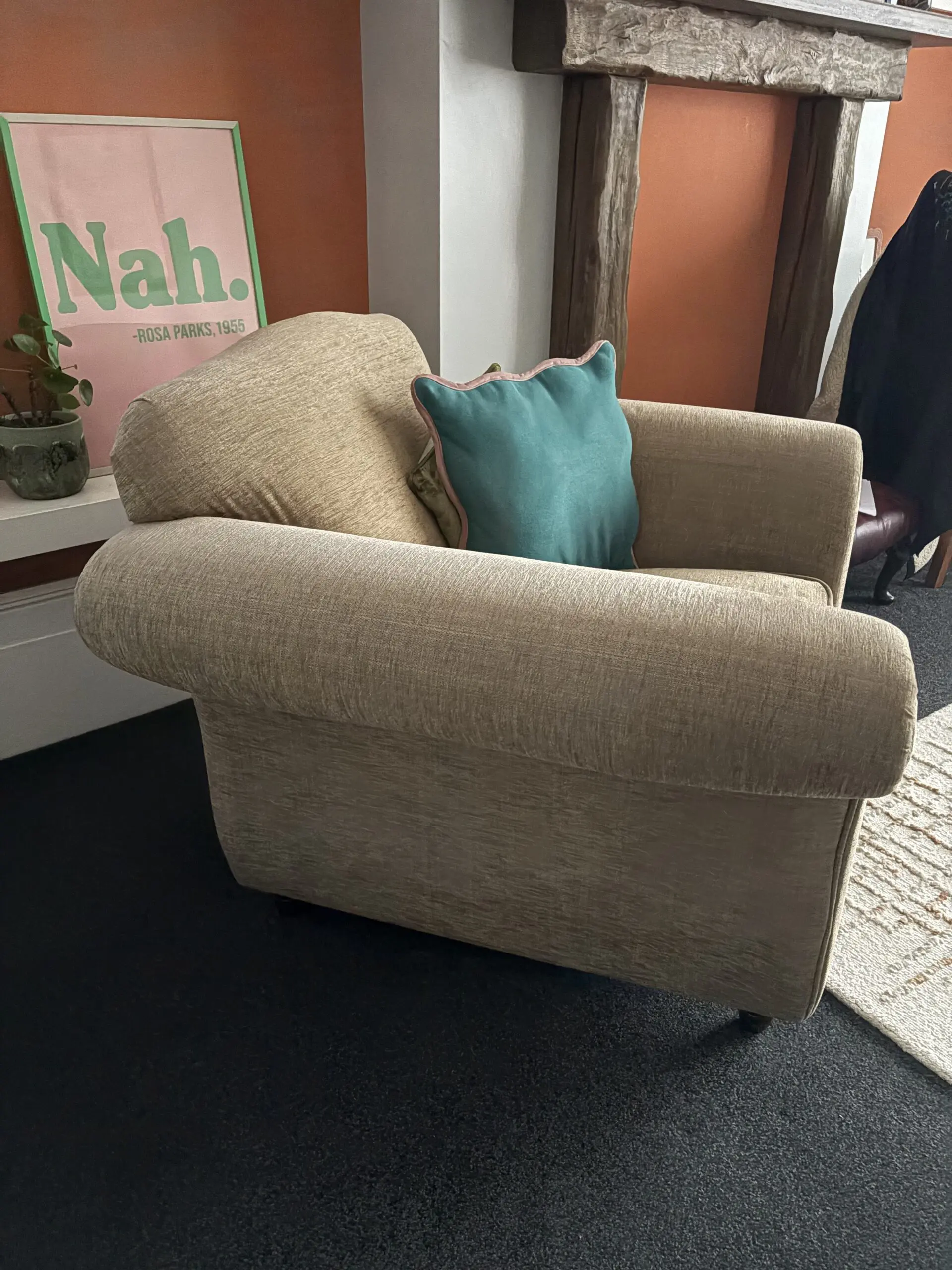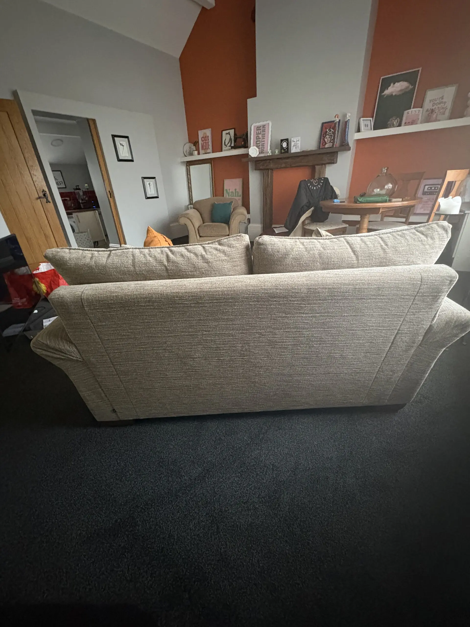 Comfortable 2-seater sofa and matching armchair set in great condition. Well cared for and structurally sound. Some visible colour variation from general use, but no damage or defects – still plenty of life left in them!