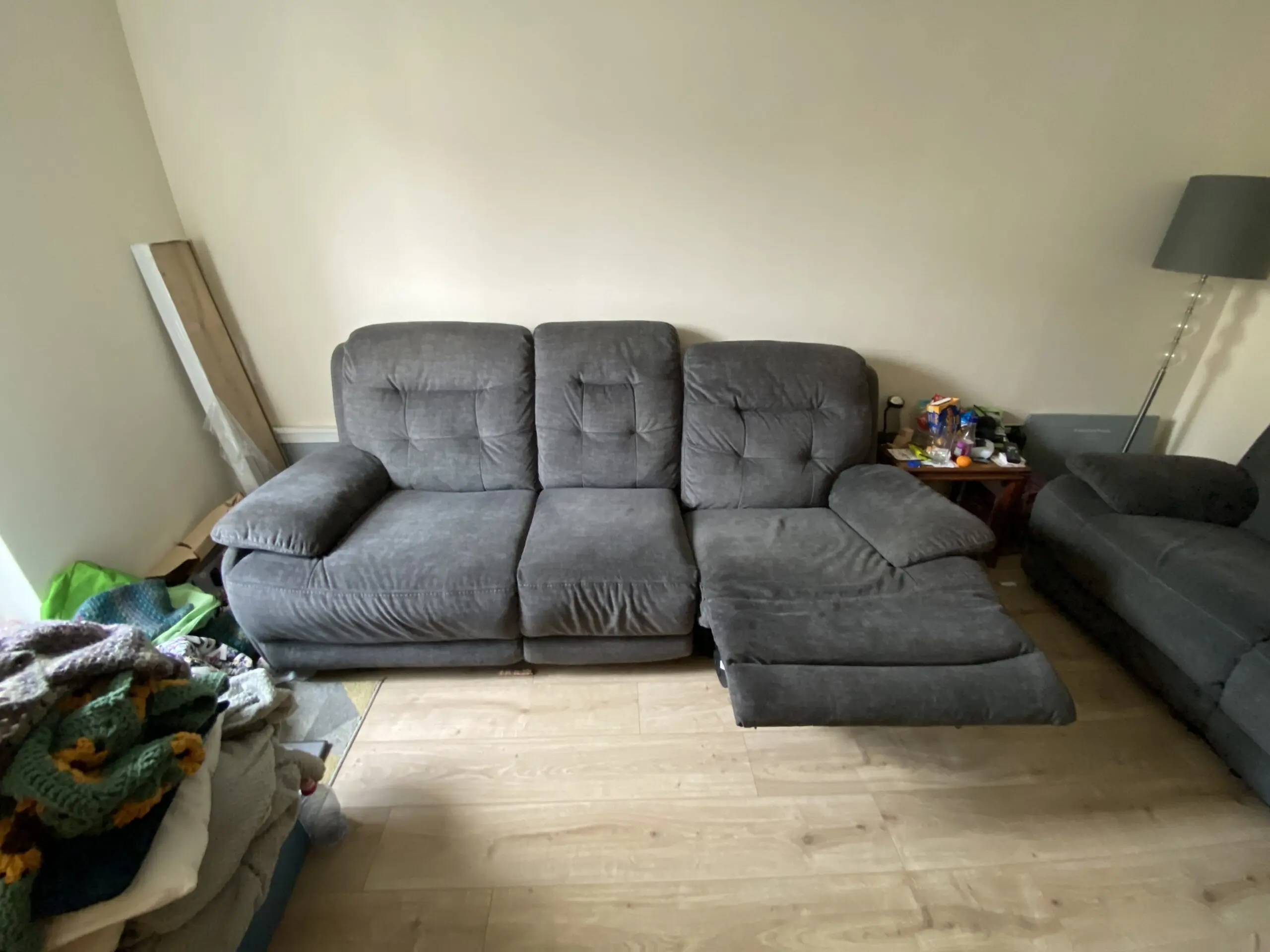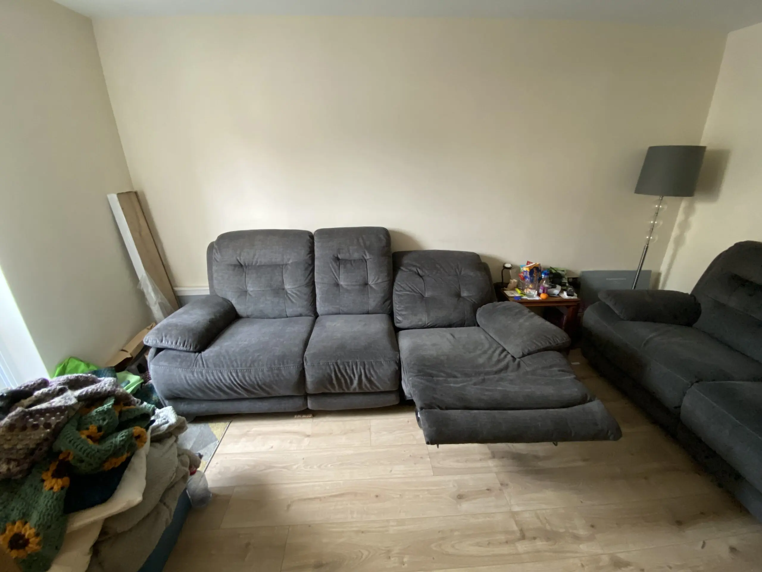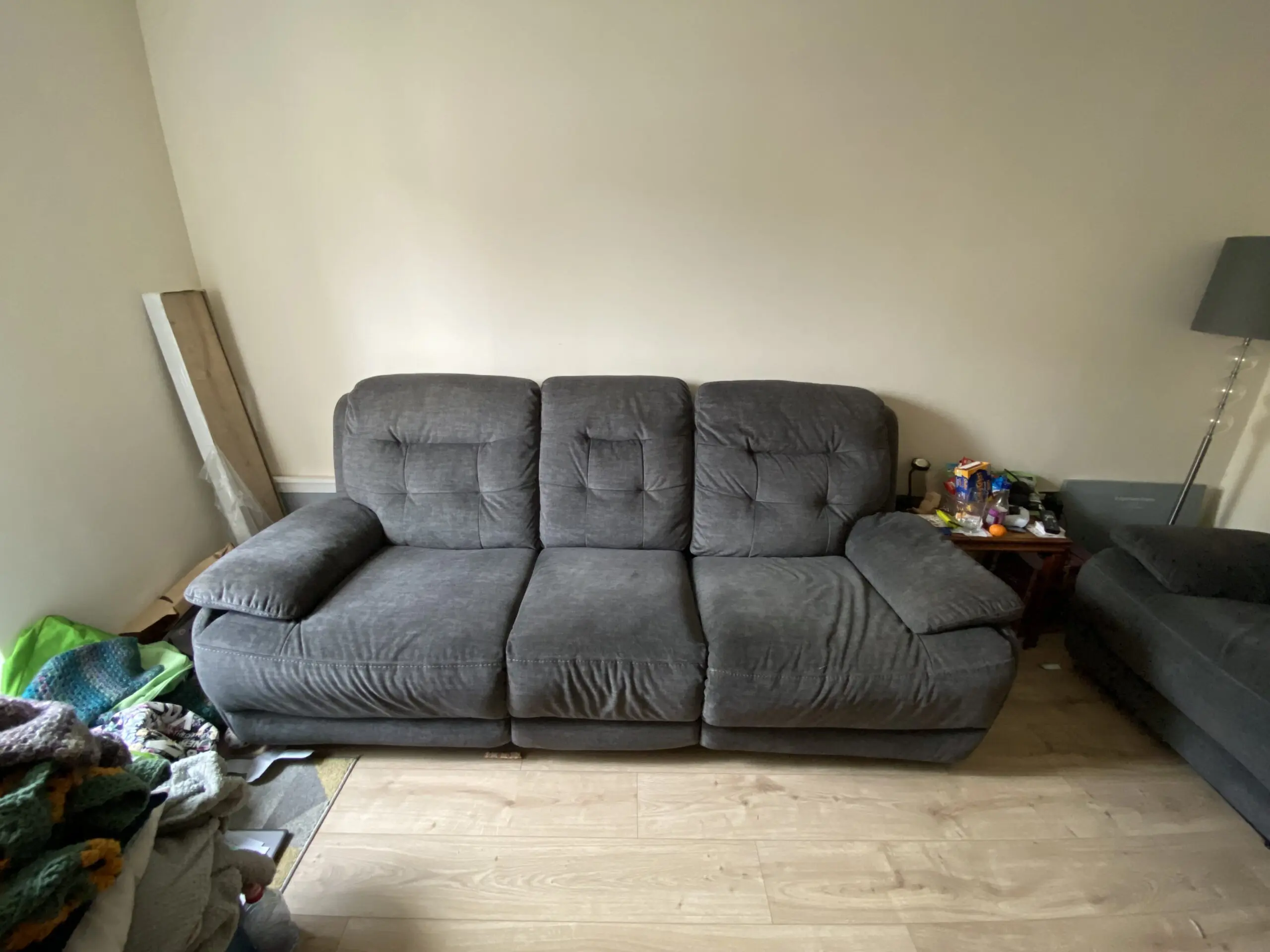 Sofas are upholstered in soft yet durable fabric. The seats on either end recline smoothly at the touch of a button and have built-in USB ports.