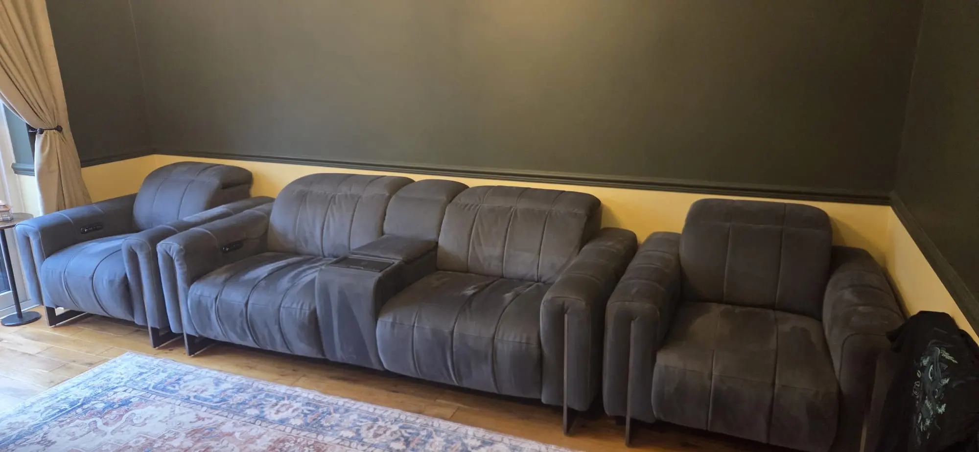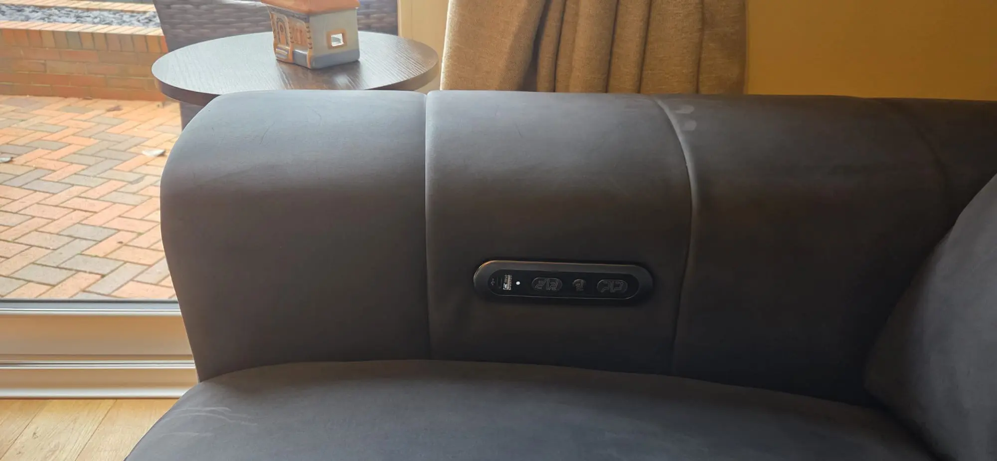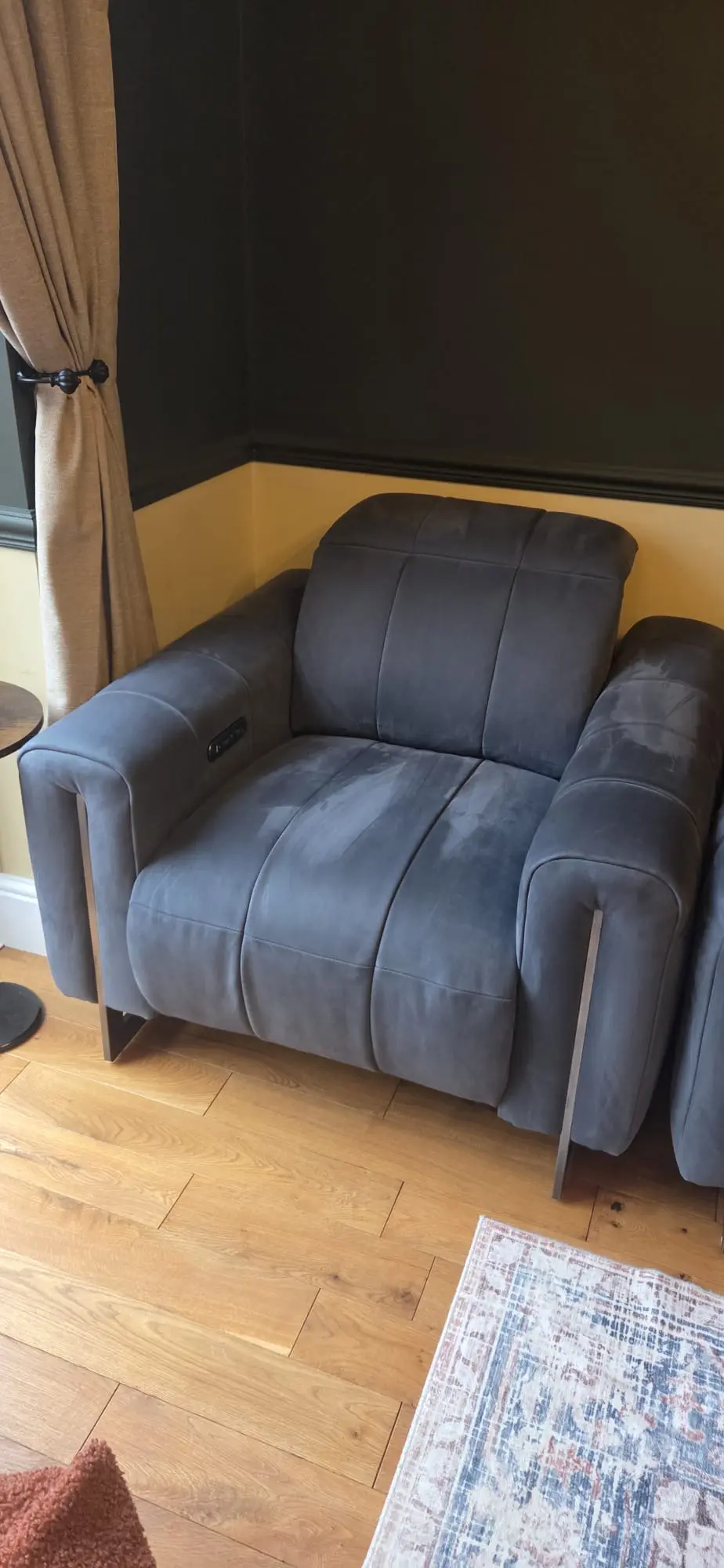 6 Month old, like new set of Paramount settees. 1x 2.5 seater Power recliner sofa, headrest, console & speakers and 2 x power recliner chairs with headrest & speakers. All in colour Charcoal with gunmetal feet. Very good condition, not had for long, only selling as they are quiet large and we are moving our living area in to a smaller room which we will not be able to fit this set into.