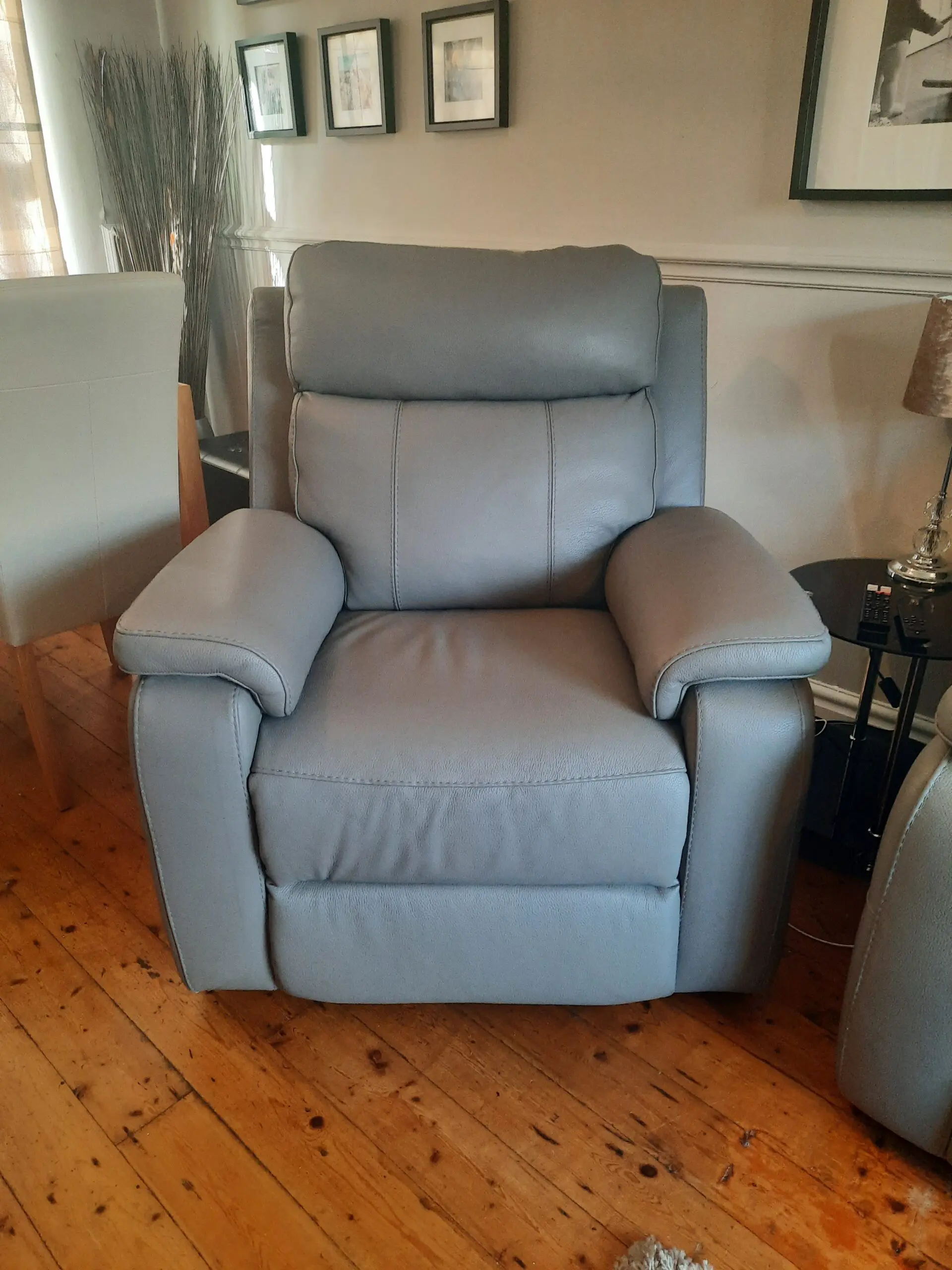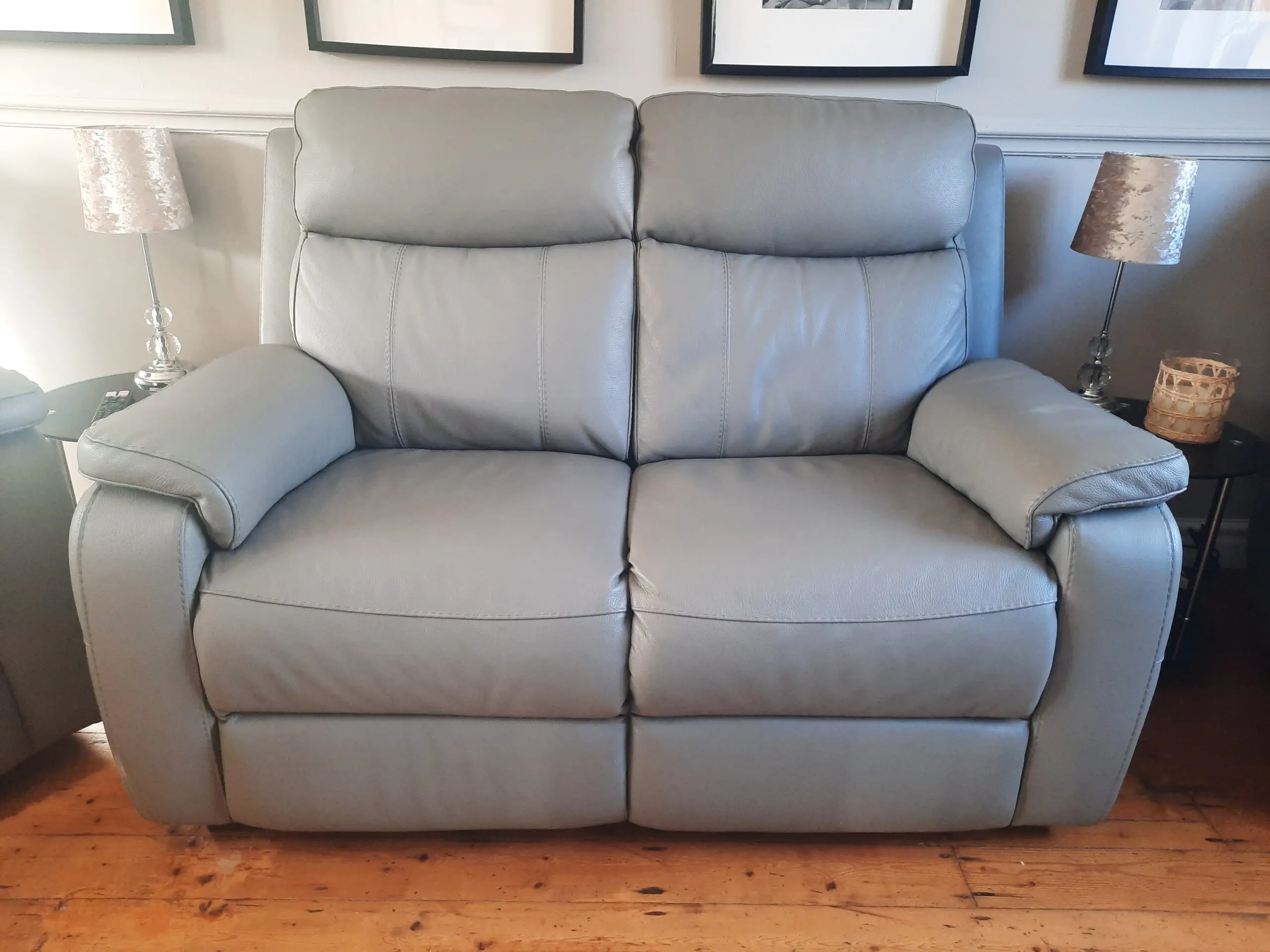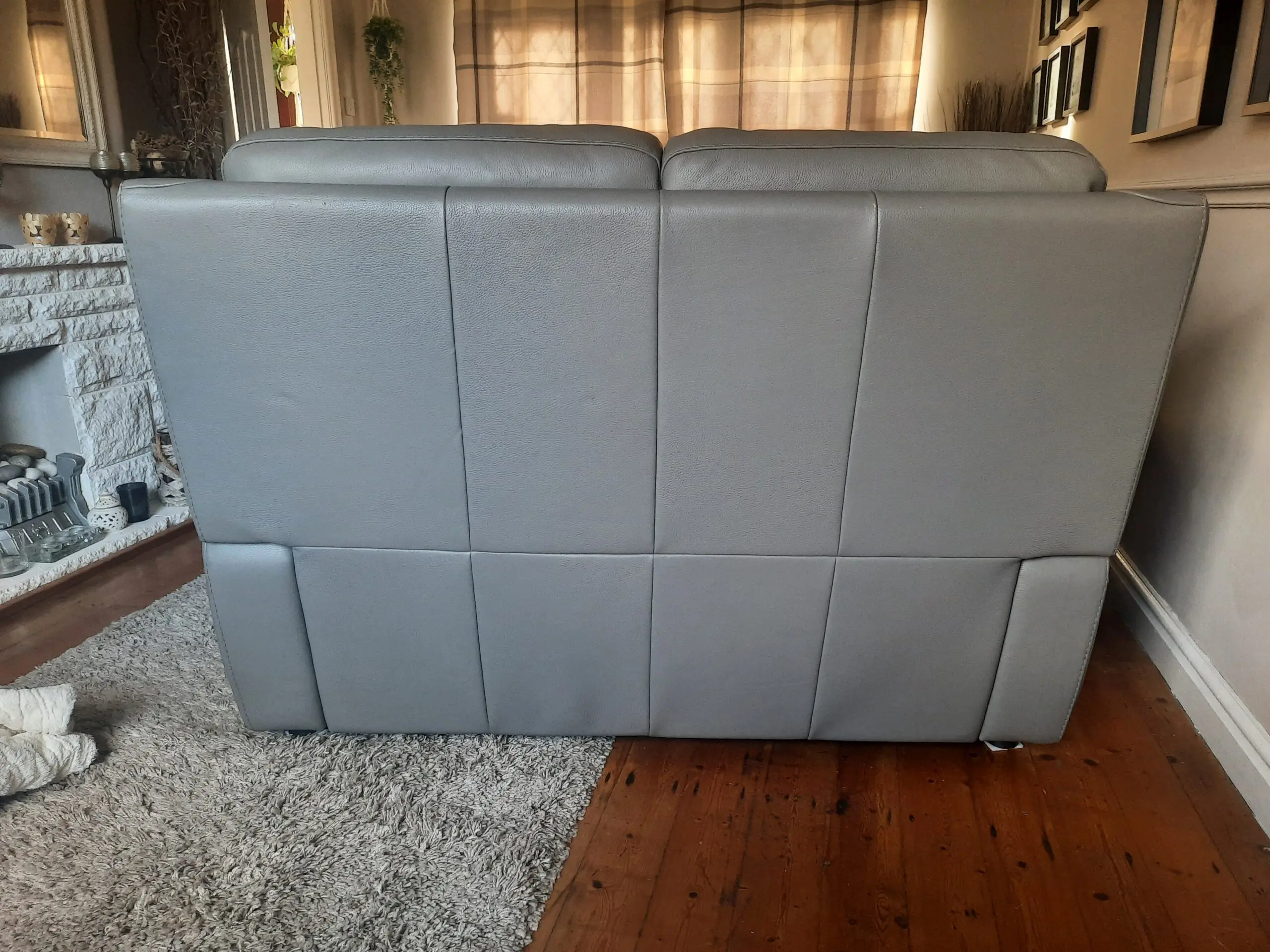 Two seater leather sofa and two power recliner chairs. In grey Italian leather. Both chairs have USB ports and phone charger ports. All in immaculate condition apart from slight scuffing on the rear and upper end of the two seater sofa.