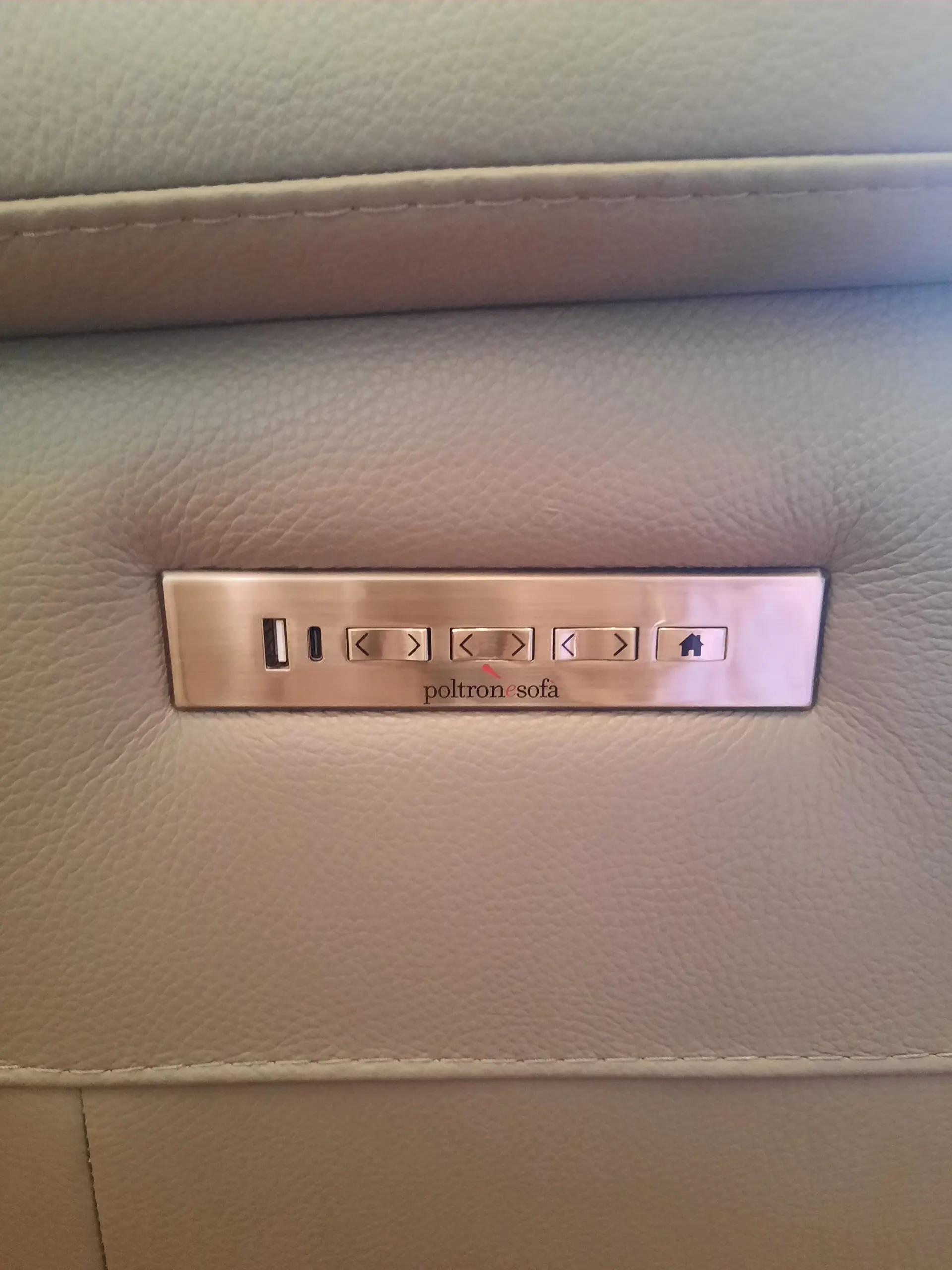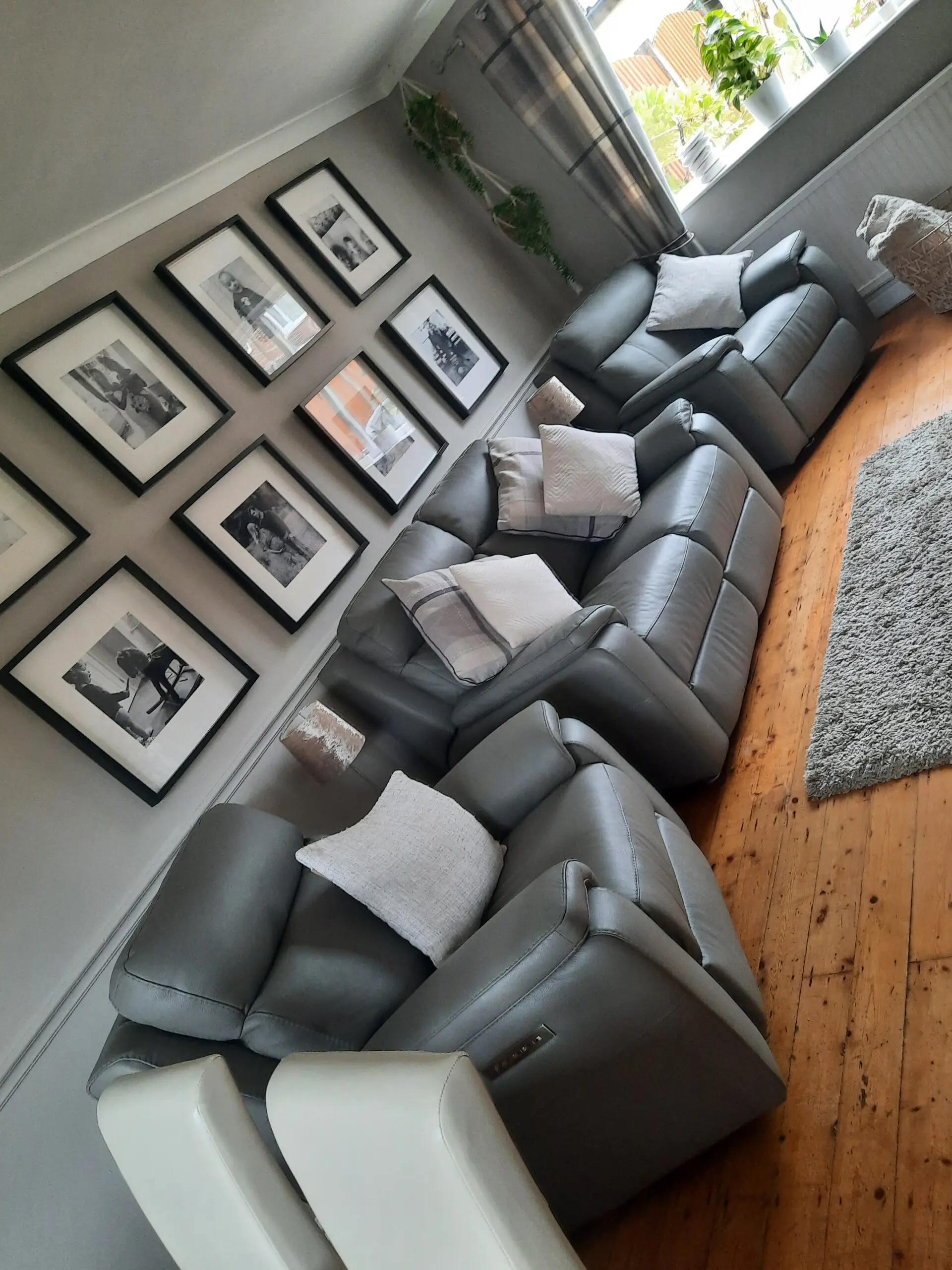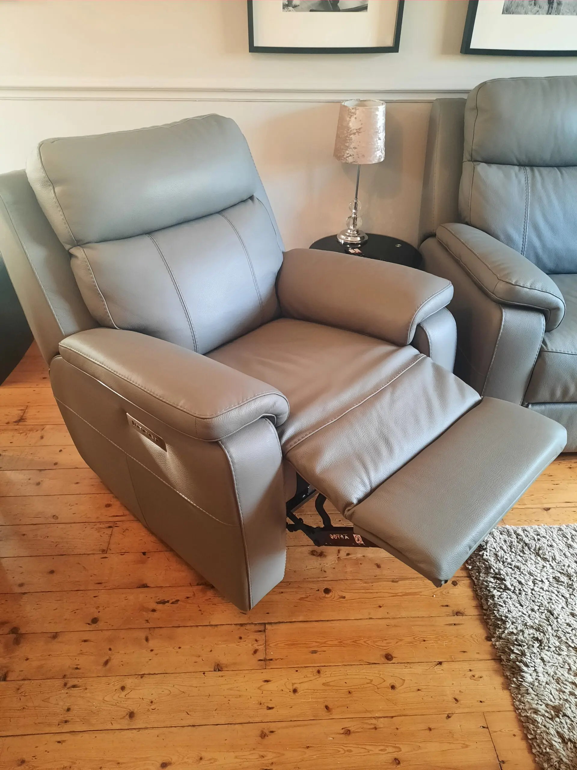 Two seater leather sofa and two power recliner chairs. In grey Italian leather. Both chairs have USB ports and phone charger ports. All in immaculate condition apart from slight scuffing on the rear and upper end of the two seater sofa.