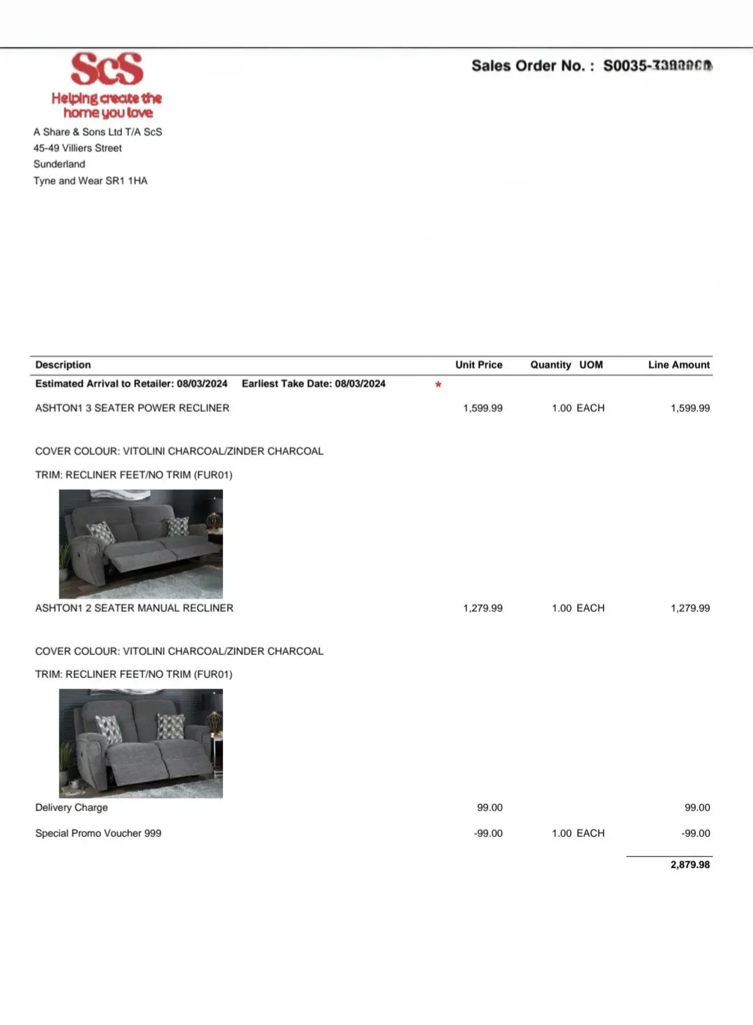SCS Ashton 3 Seater power recliner & 2 Seater manual recliner.