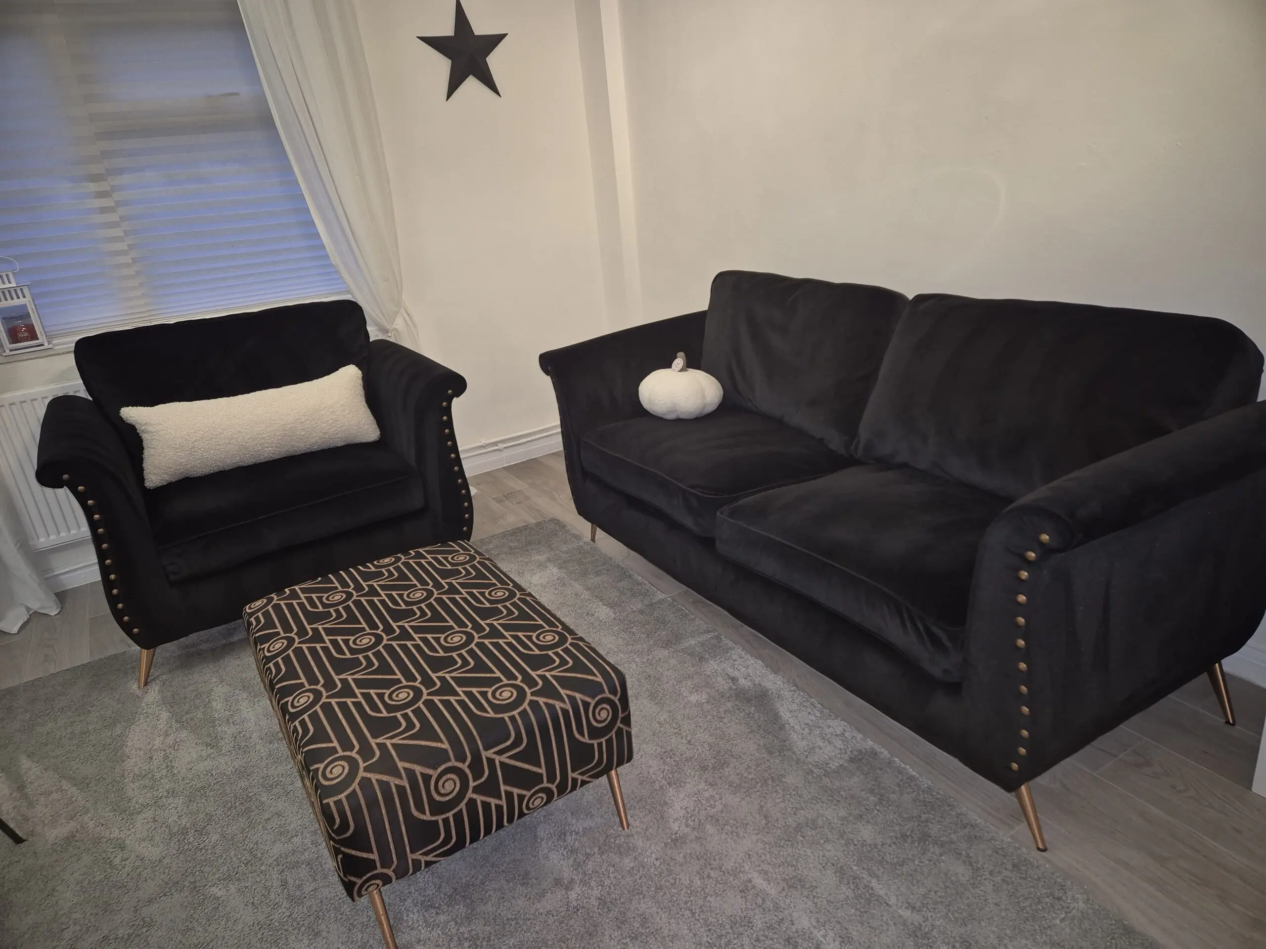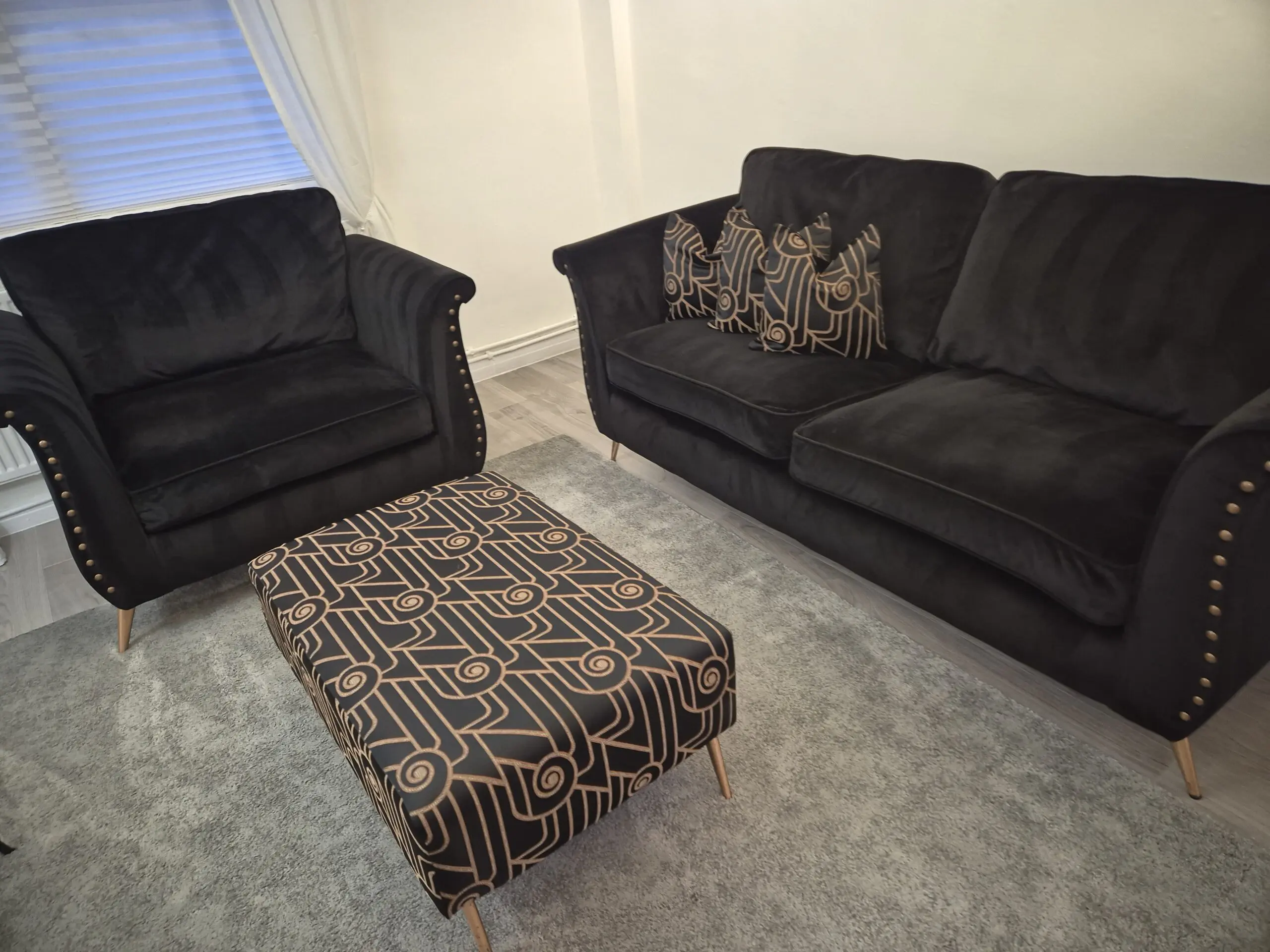Lovely condition scs 3 seater sofa , large chair , footstool & cushions , clean set , well looked after , smoke free home