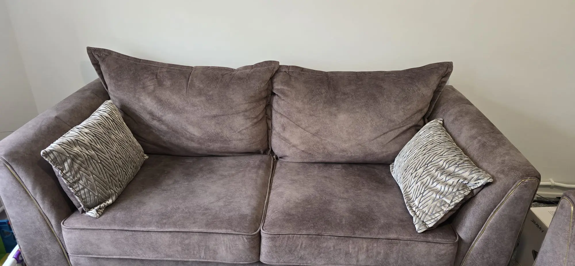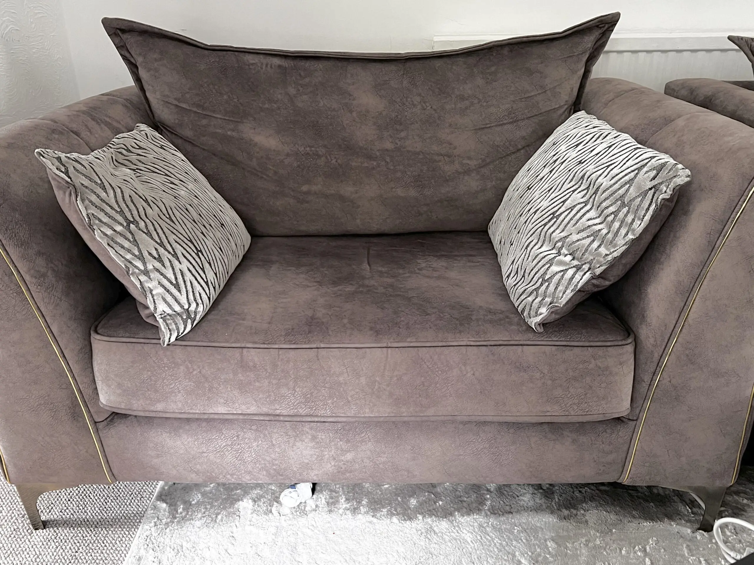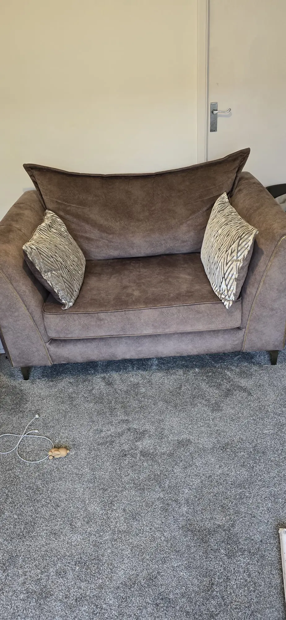 Comfortable, supportive seating with a dapple chocolate colour. that suits most interiors. Both pieces are clean, well cared for, and from a smoke-free home. Includes matching scatter cushions.