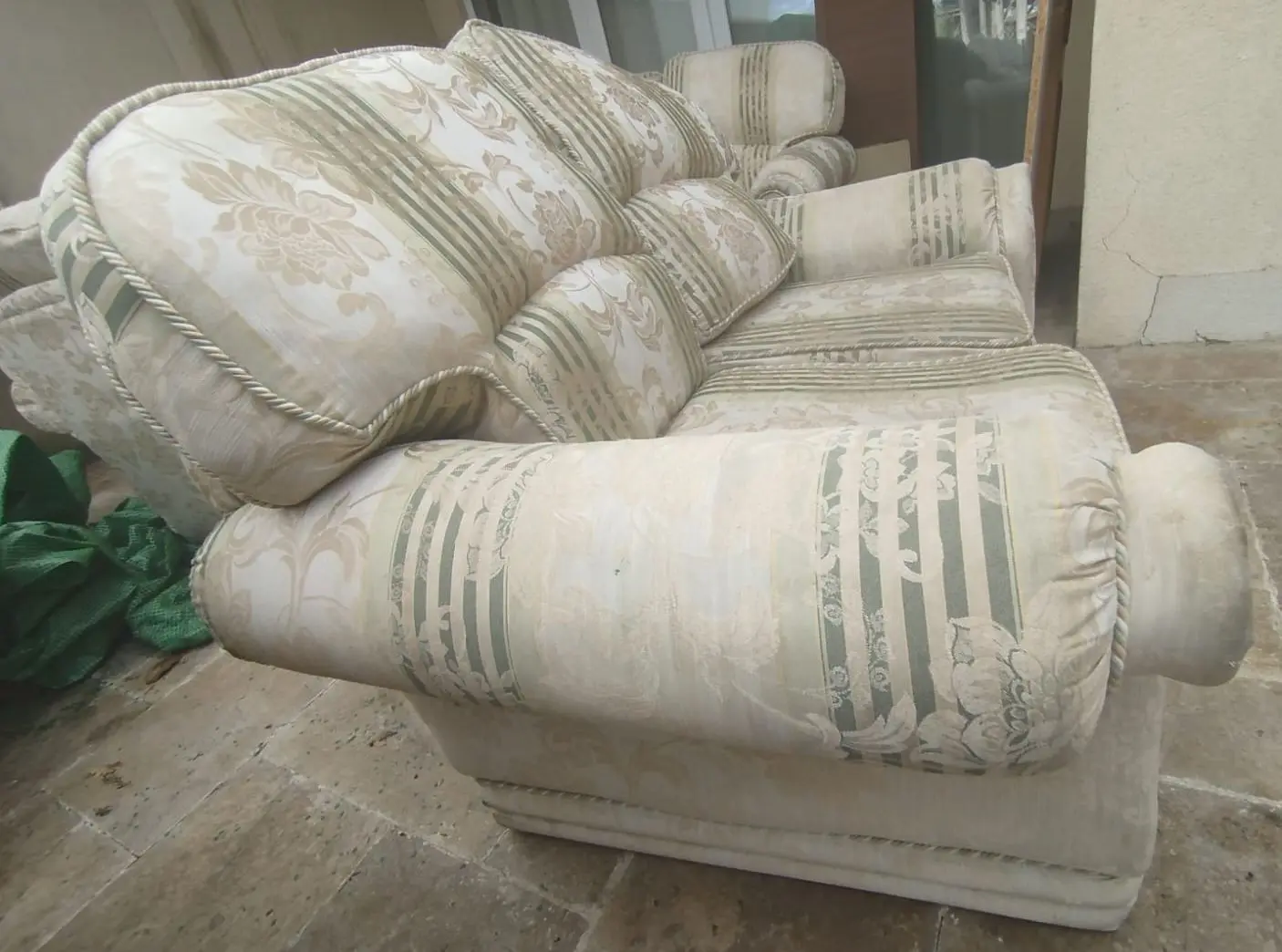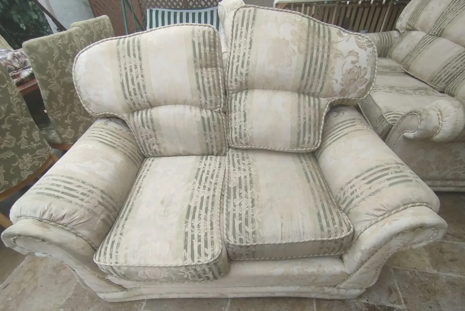 The seat section of the sofa set is for 1 3-seater sofa, 2x 2-seater sofas and 1 sofa. The couch and chair are crafted from a light beige or grey patterned microfibre synthetic fabric, which provides a clean yet textured appearance. The pillows, situated on the back cushion of the couch, add a touch of elegance to the overall design. Given the positioning of the couch, chair, and pillows. The couch resides in a residential setting, possibly a living room or family room.
