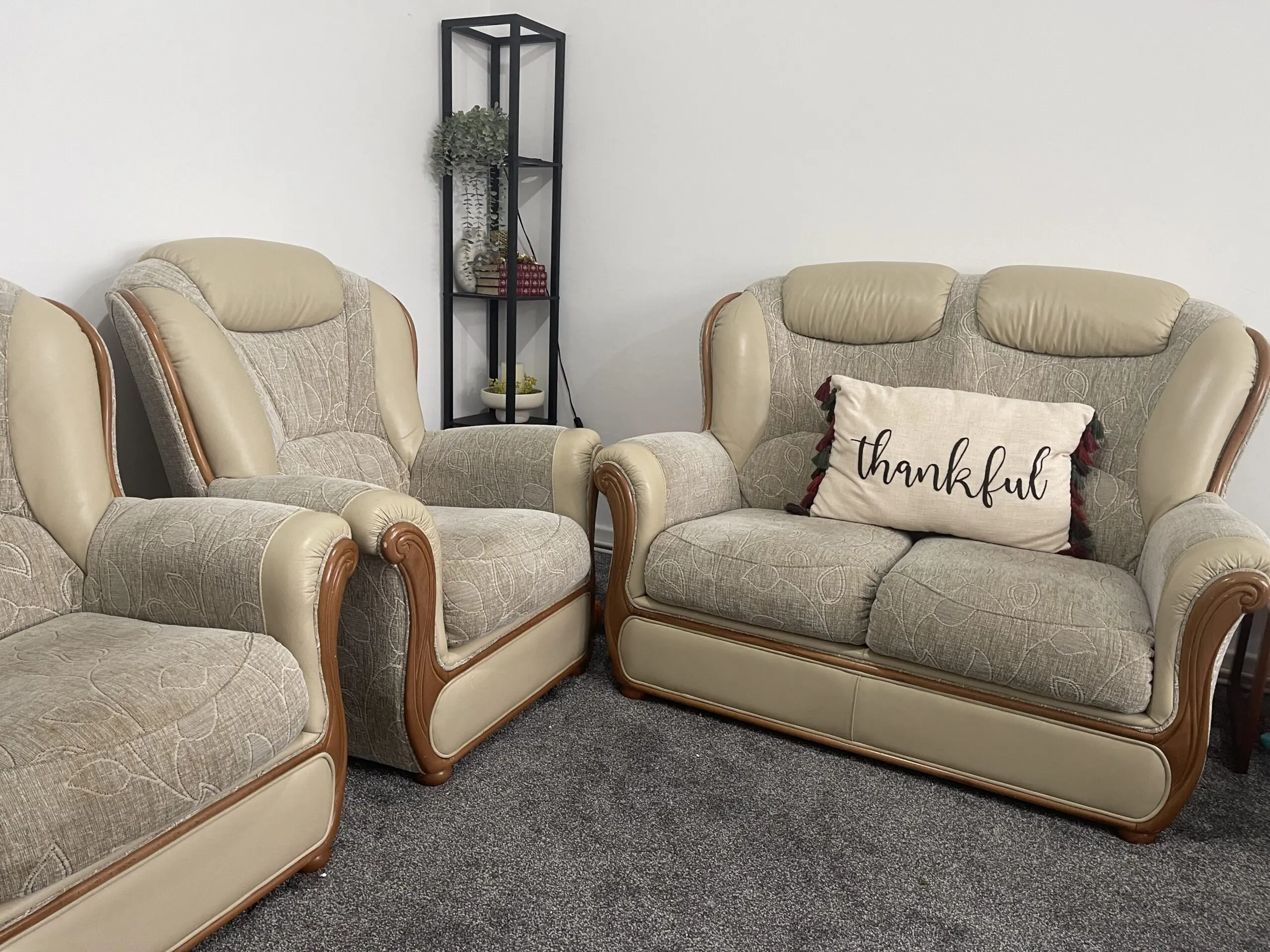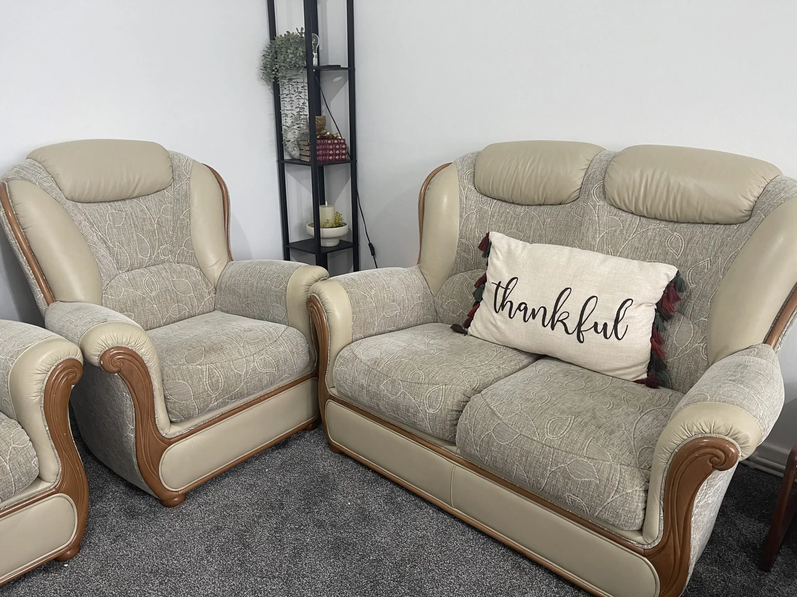 Combination of leather , wood and Fabric.
