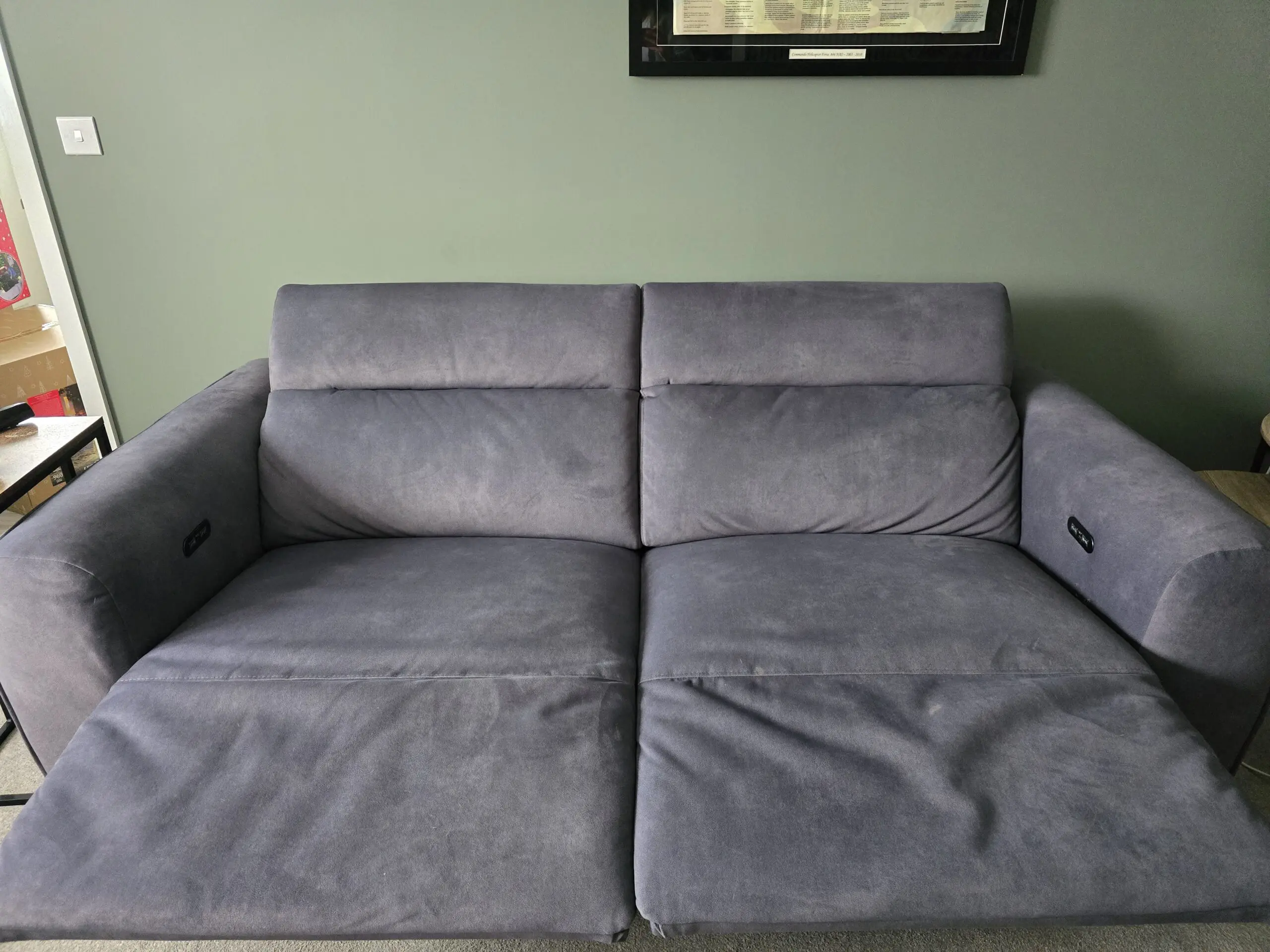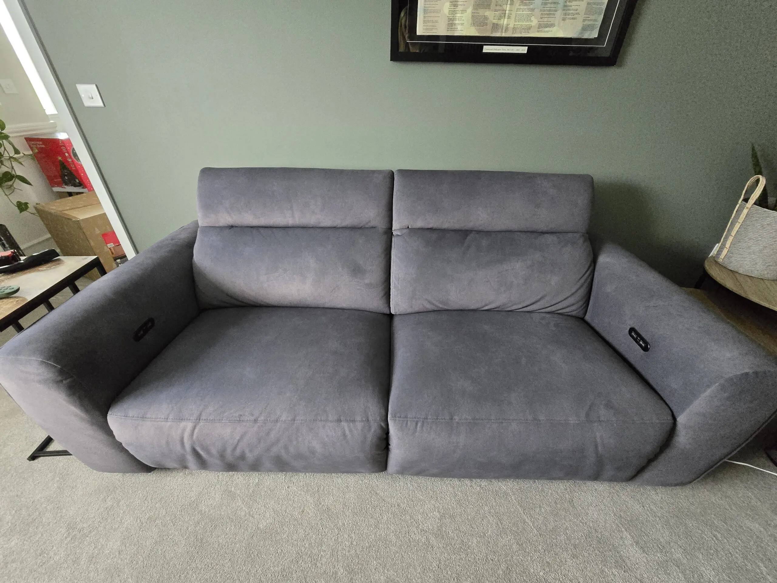 A stylish and comfortable matching 3 and 2 seater electric recliner sofa set in excellent condition. Upholstered in a beautiful charcoal velvet-look fabric that feels soft to the touch and is very easy to clean.