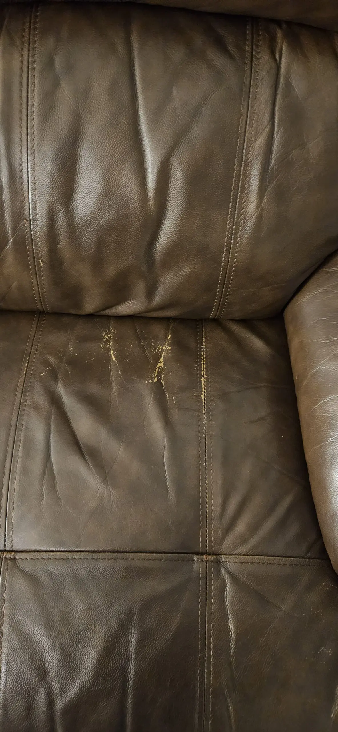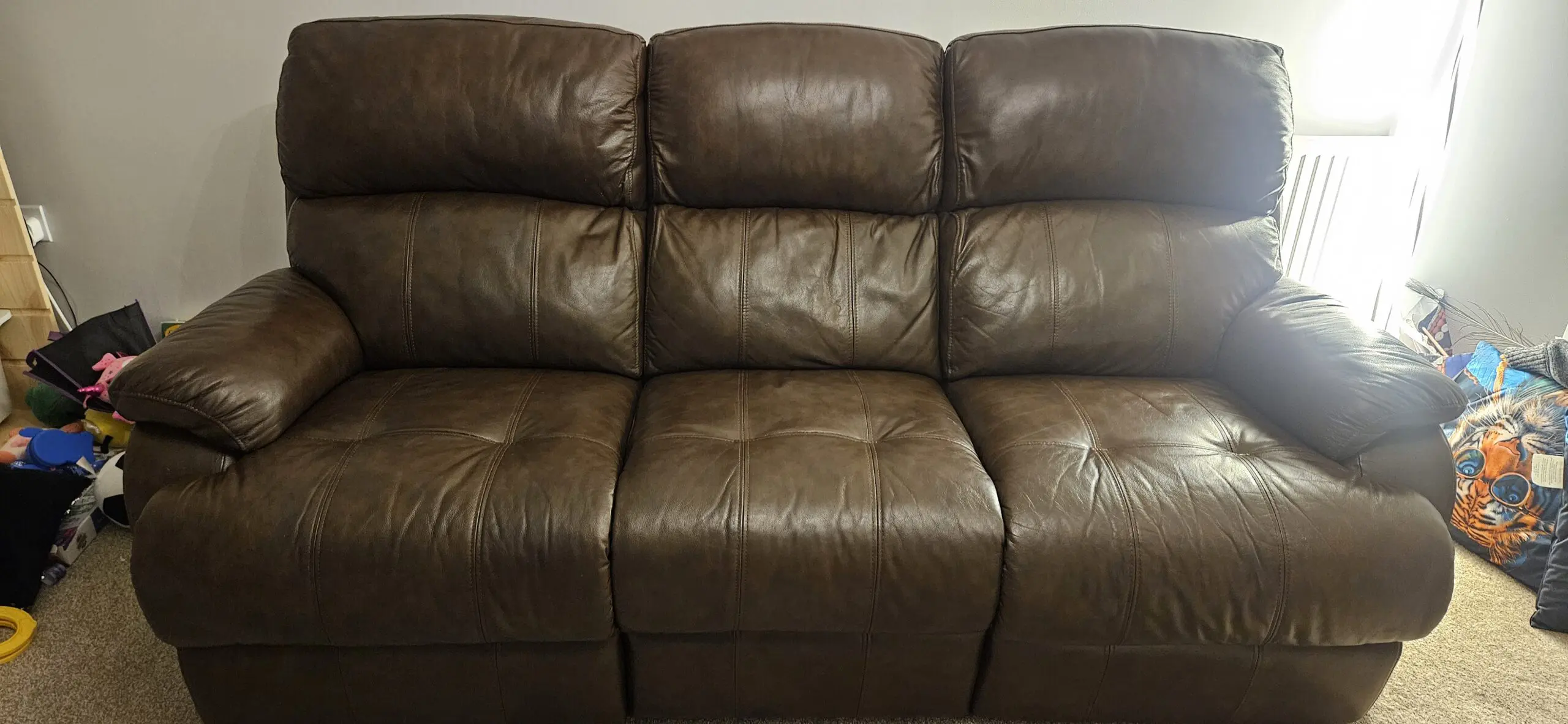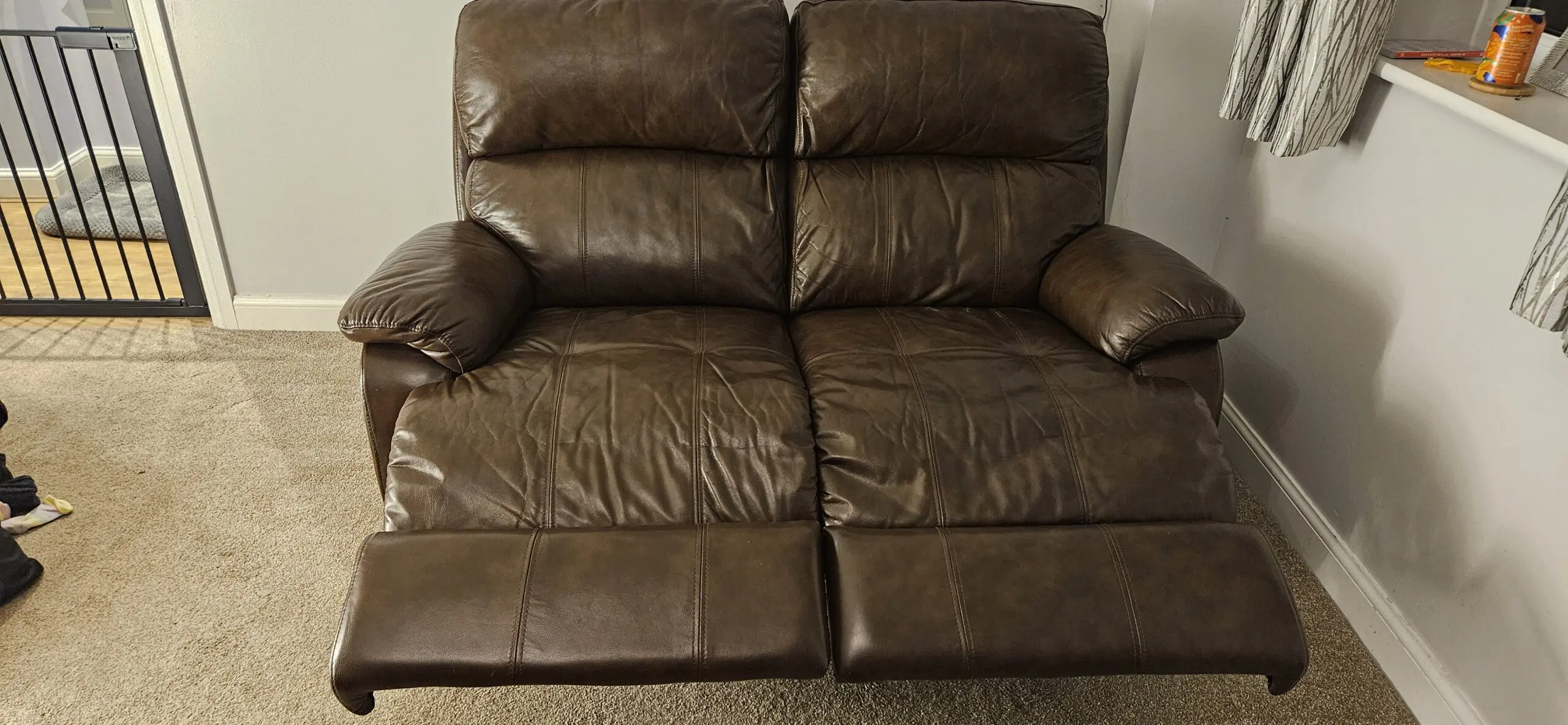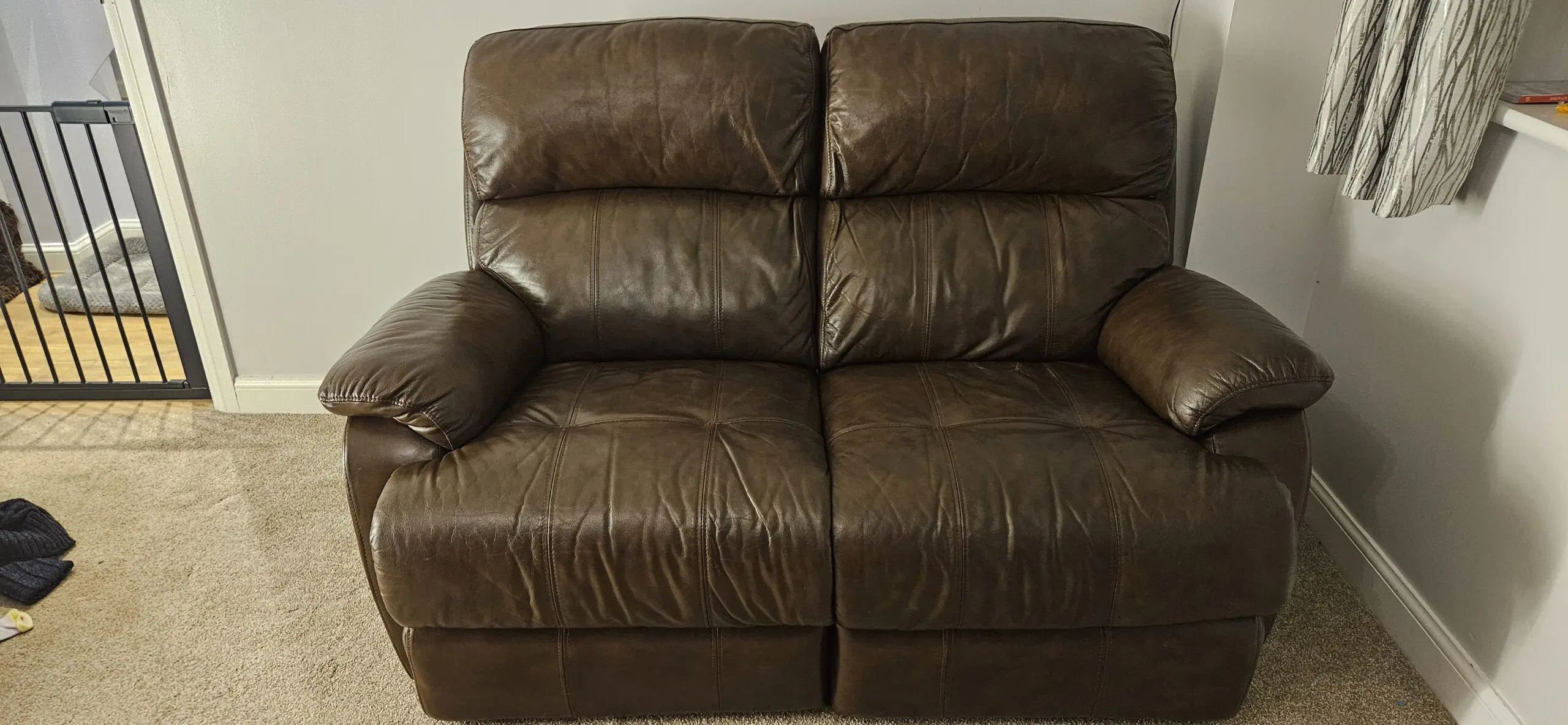 Minimal wear and tear. 2 seater has one seat cushion with cracking leather.