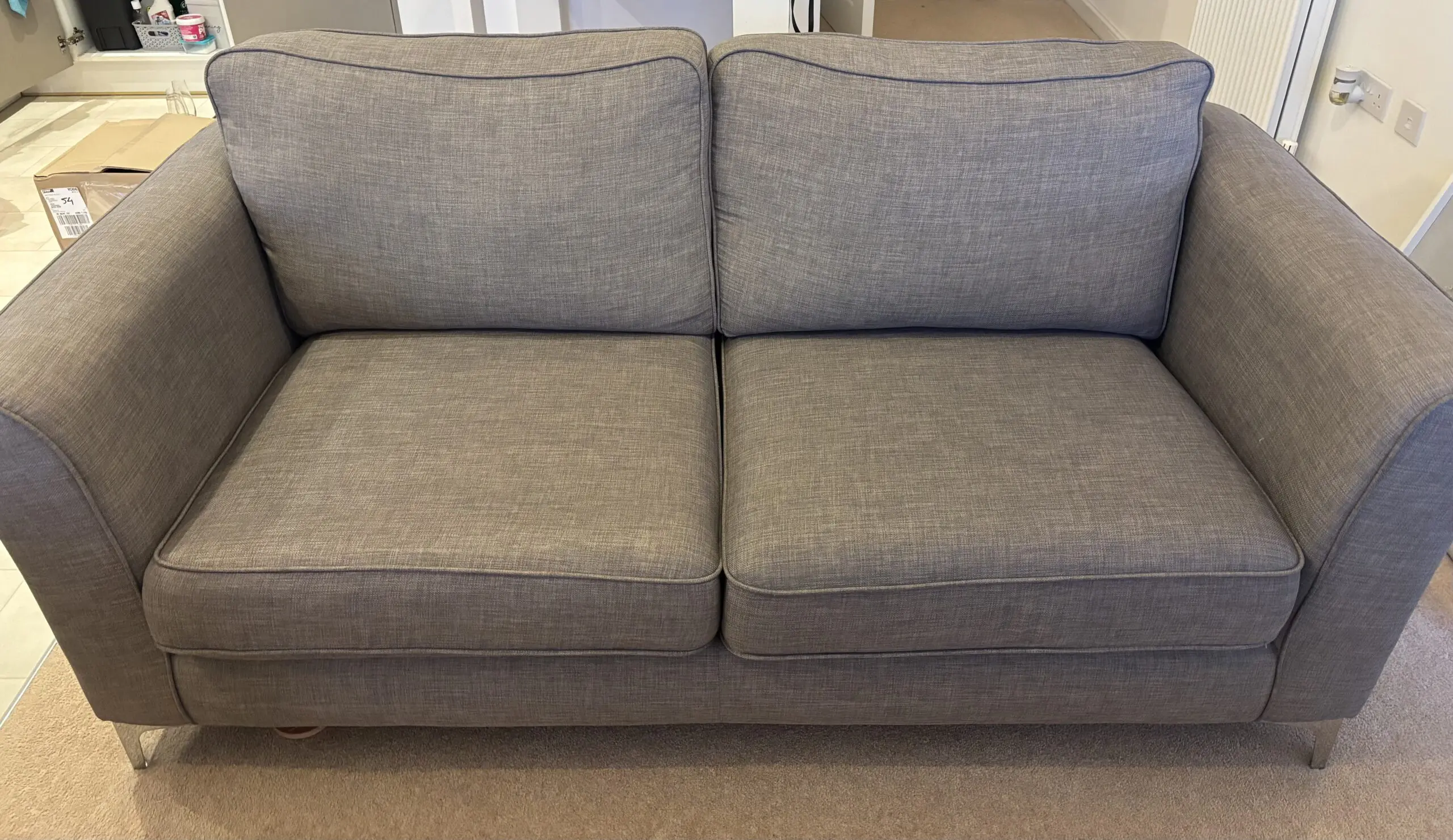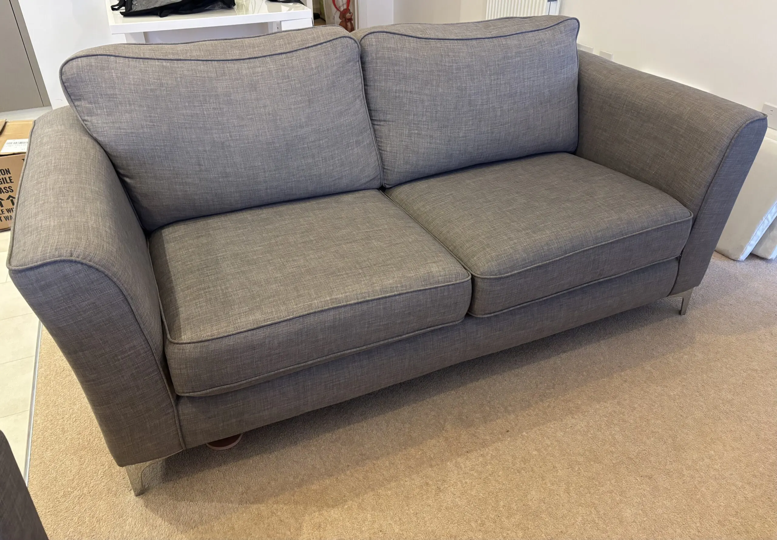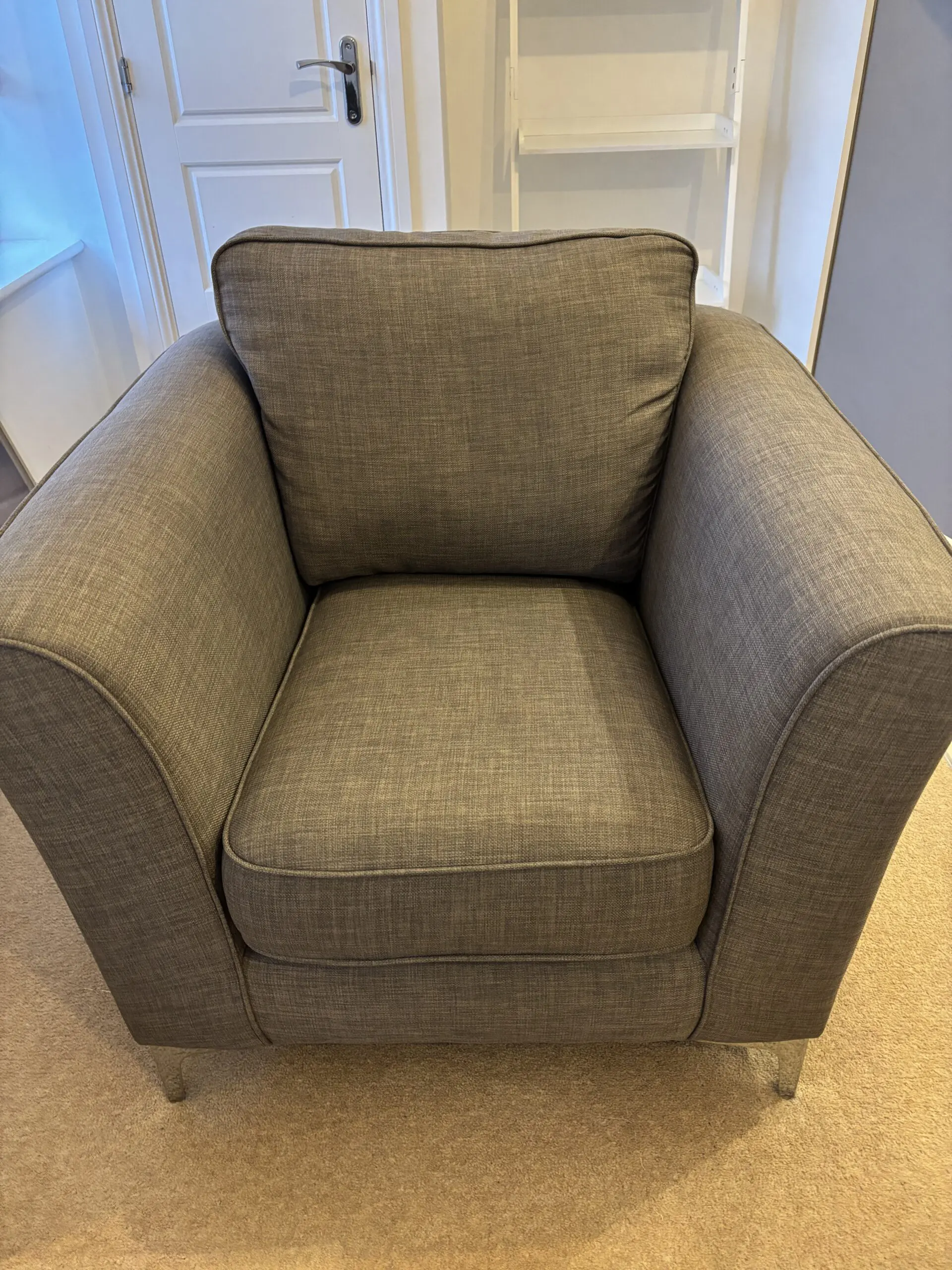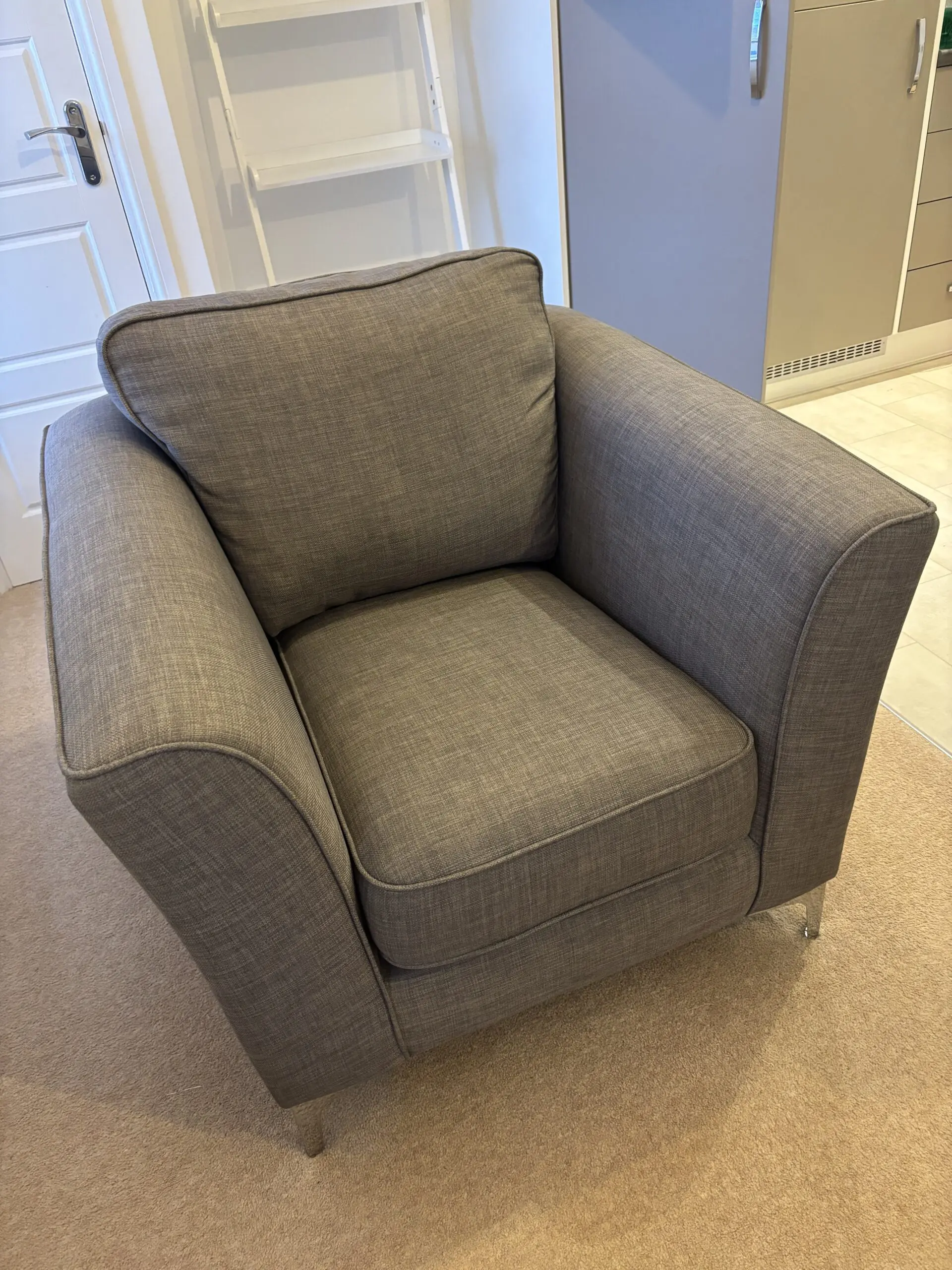 Good sized 2 seater sofa and matching chair. Grey colour originally from Sofology, in excellent condition with no marks or stains and no damage to fabric.