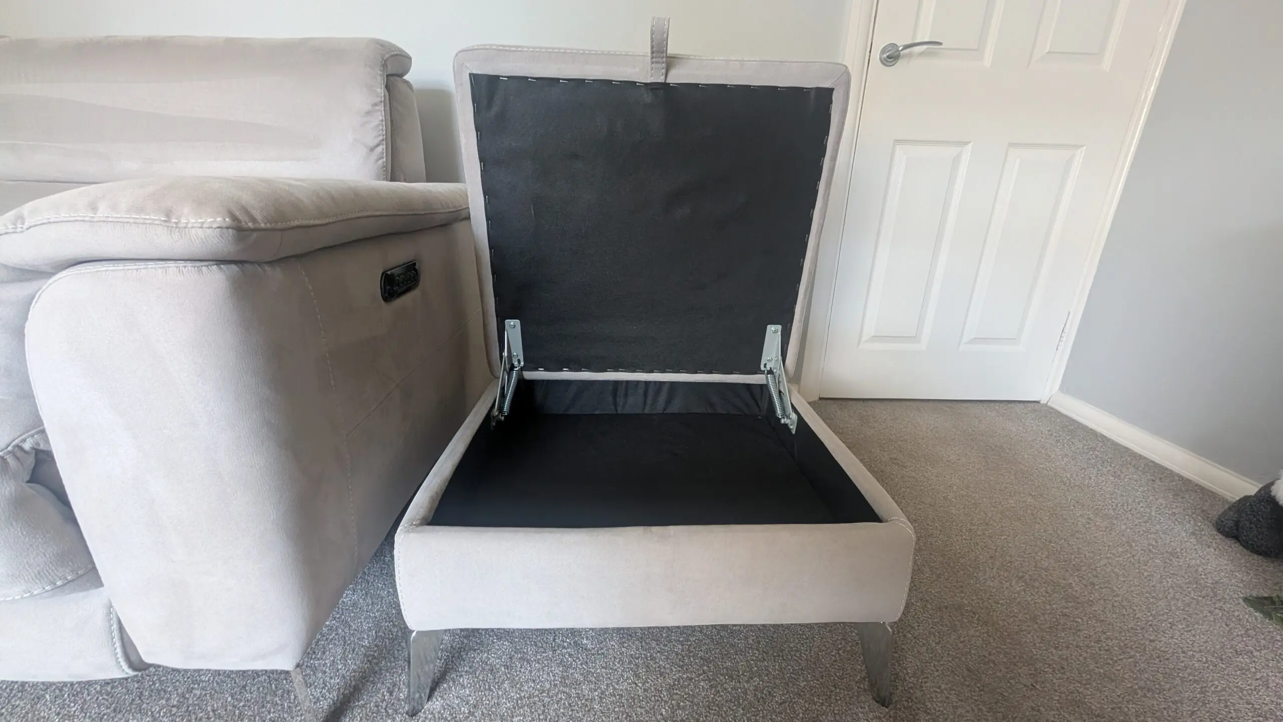 Footstool lifts up for storage.