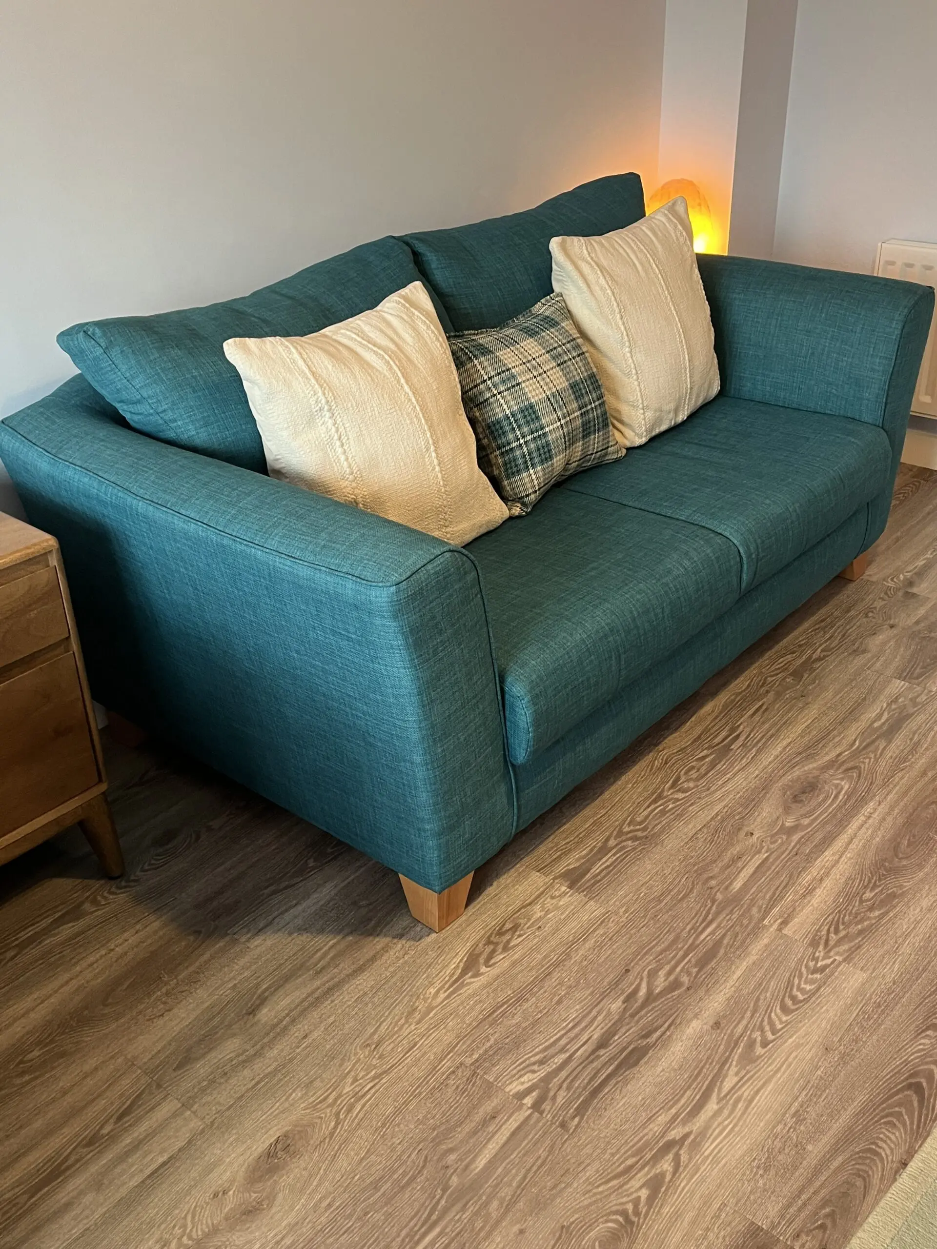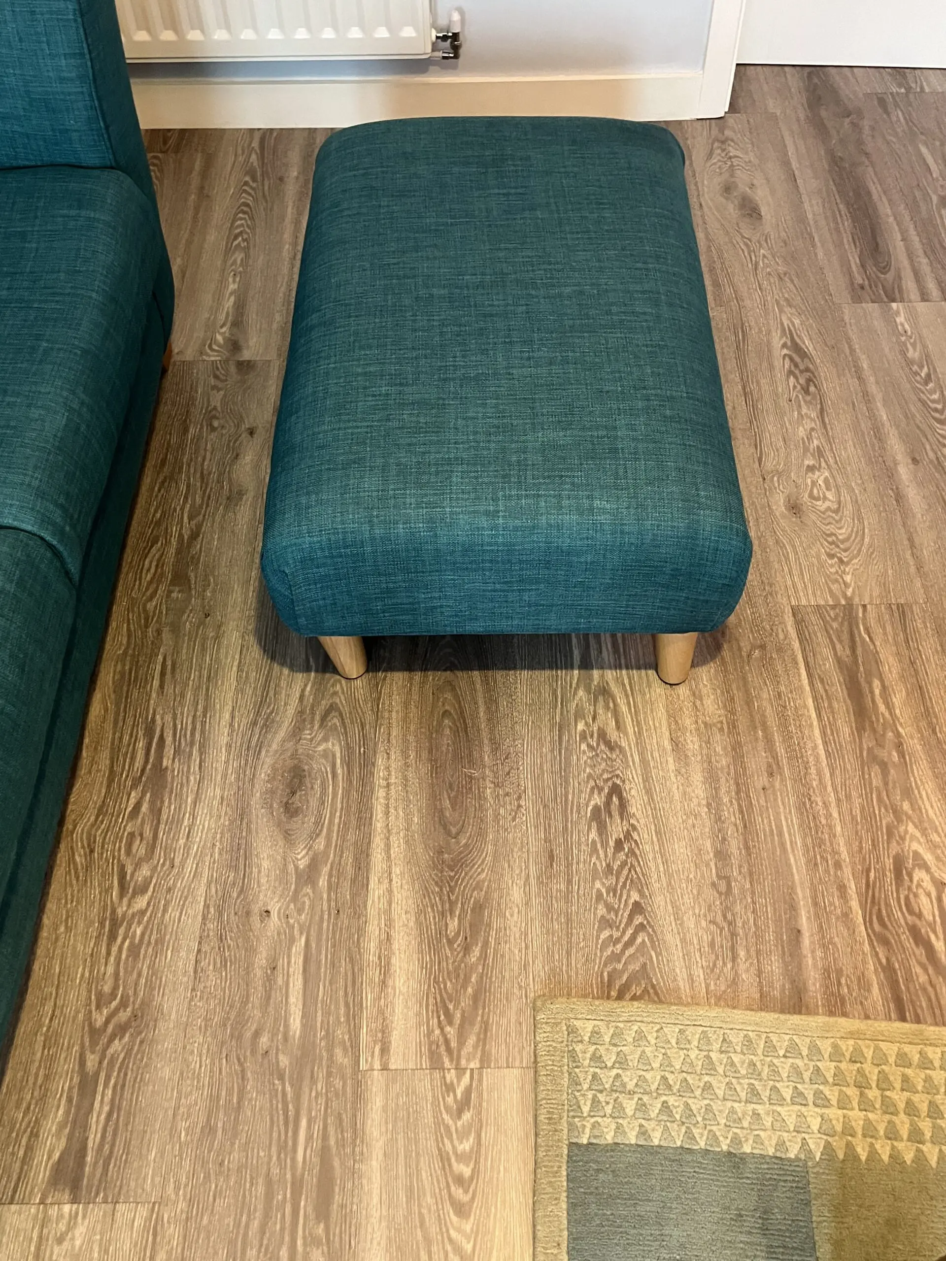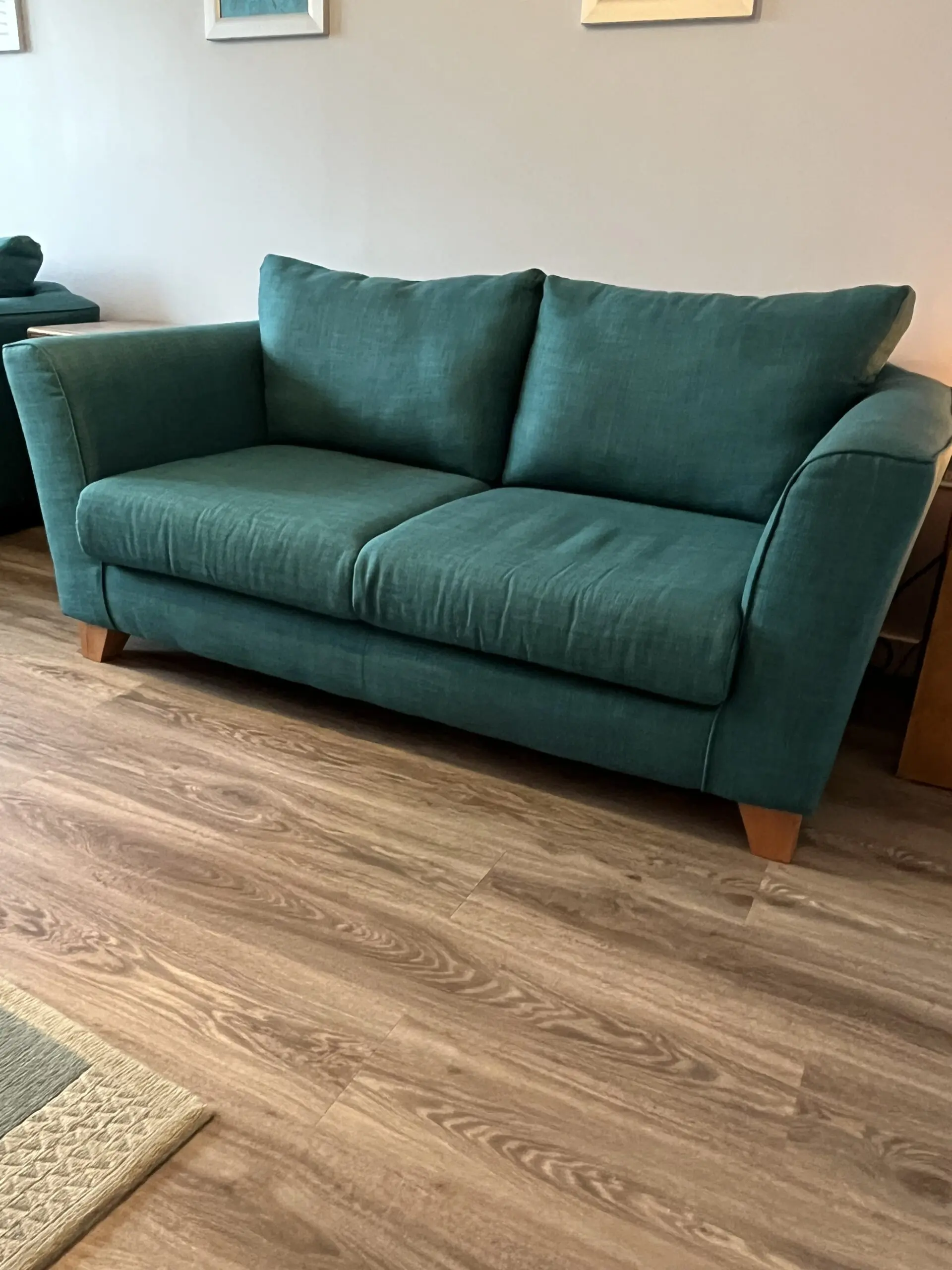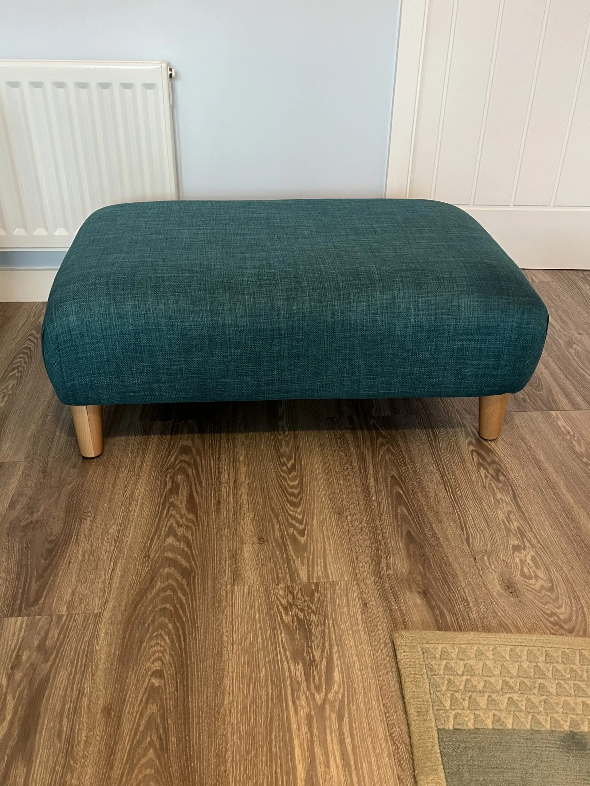 Items purchased from Sofology in December 2022. The fabric is Lino’s Teal basket weave which is sturdy and tonal and endures well over time. There is no damage to the fabric on any of the items such as nicks or tears or stains.