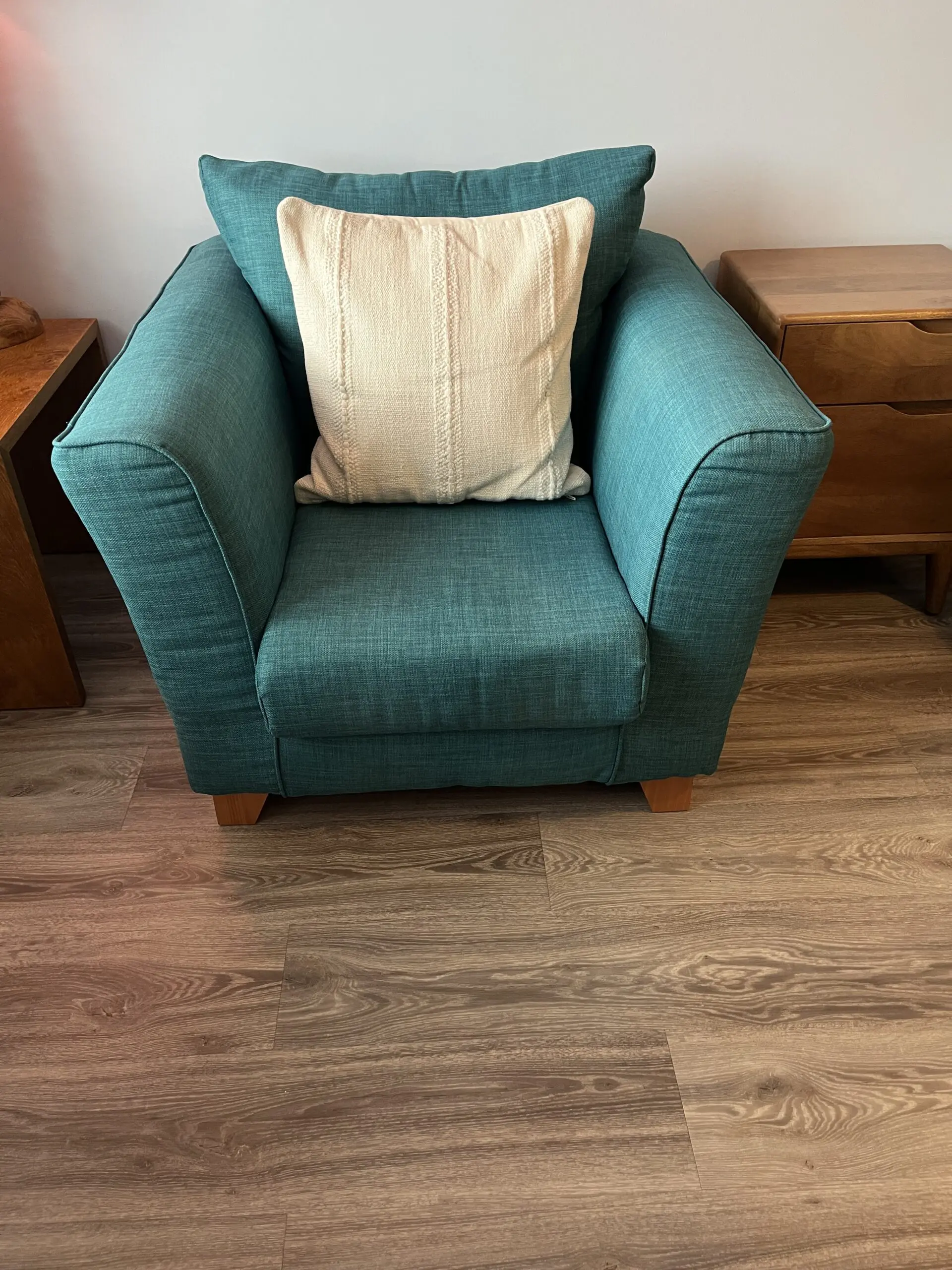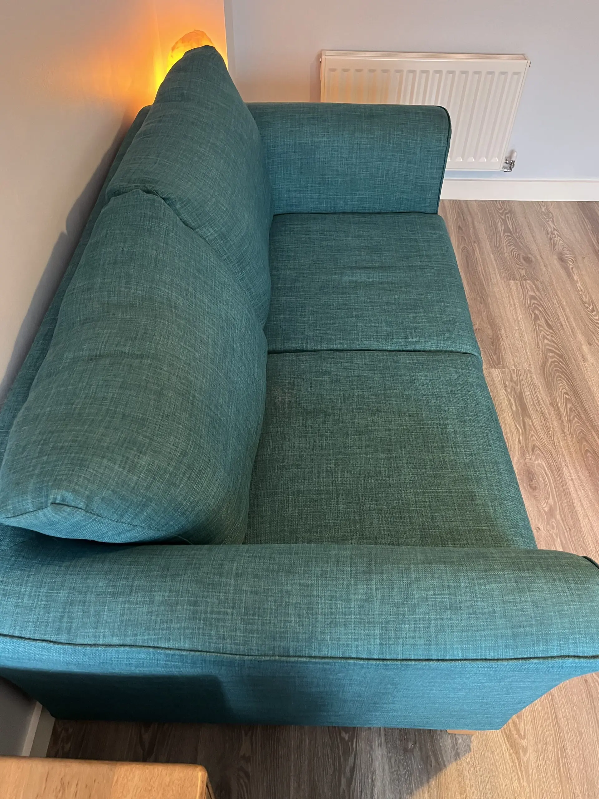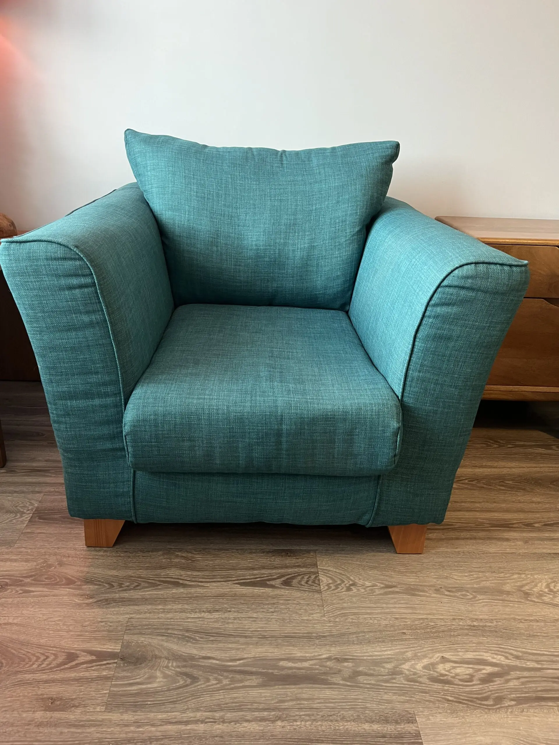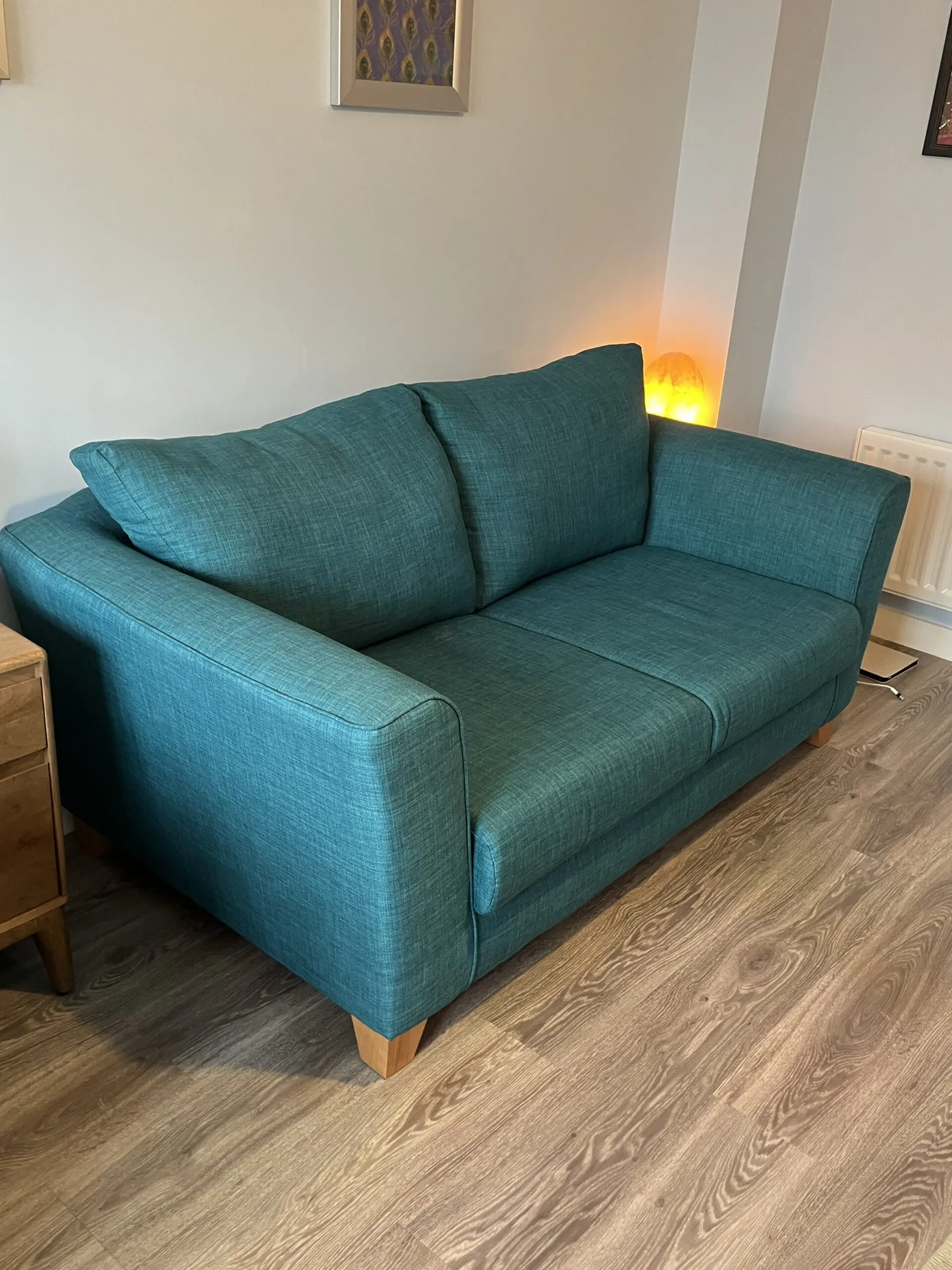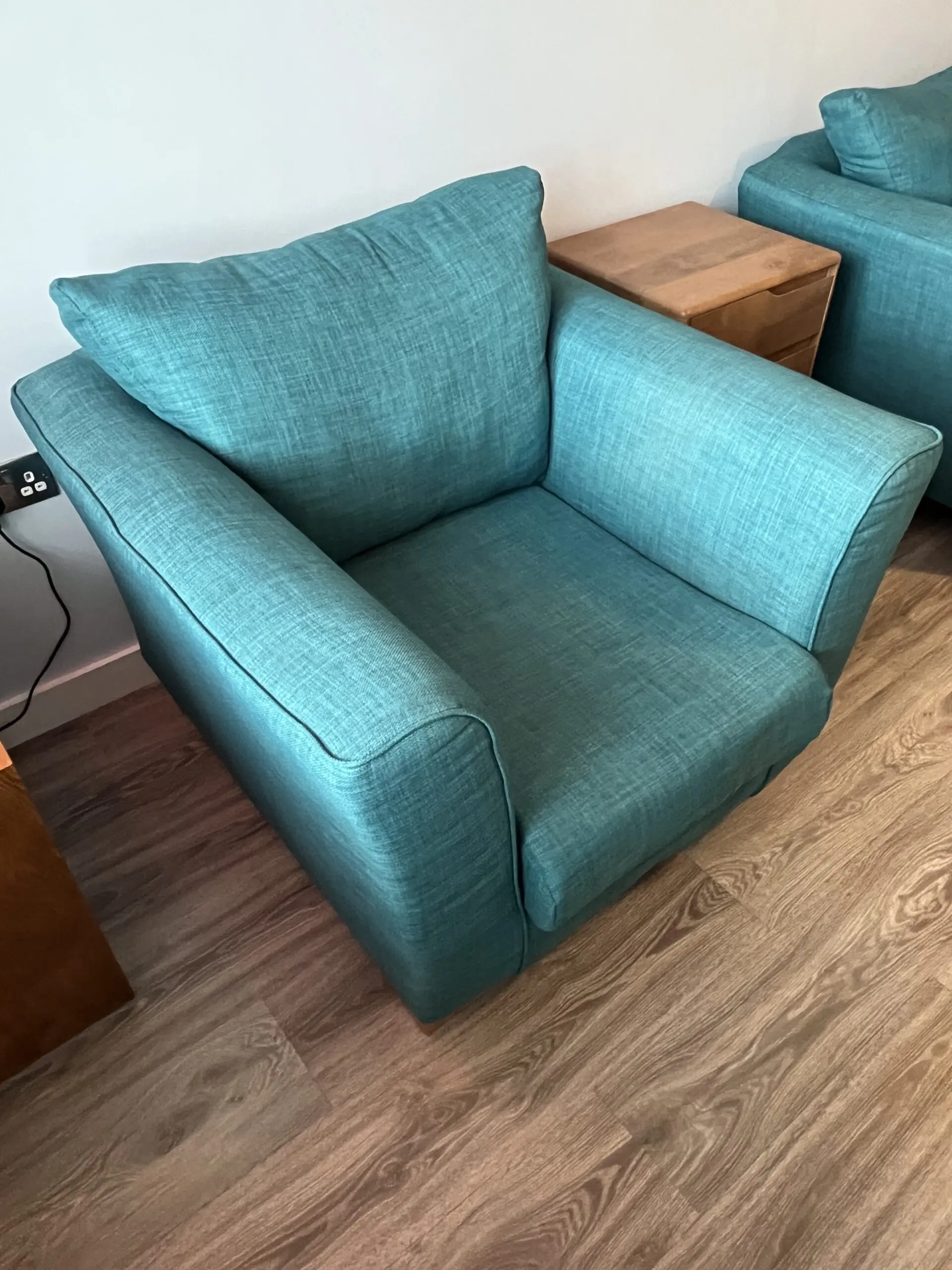 Items purchased from Sofology in December 2022. The fabric is Lino’s Teal basket weave which is sturdy and tonal and endures well over time. There is no damage to the fabric on any of the items such as nicks or tears or stains.