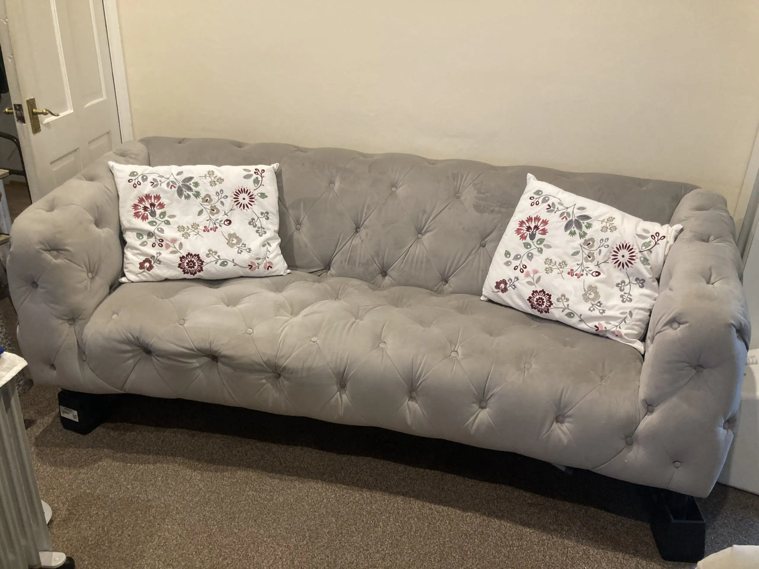 In excellent condition. The material is actually ‘fabric’ according to the site. Measurements- three seater is 215cm W by 90cm D by 80cm H. The one seater is 80cm W by 90cm D by 80cm H. The footstool is 90cm W by 60cm D by 45cm H. Collection only. On the pics you can see raisers which raise the height of the sofas but these can be easily removed if not needed
