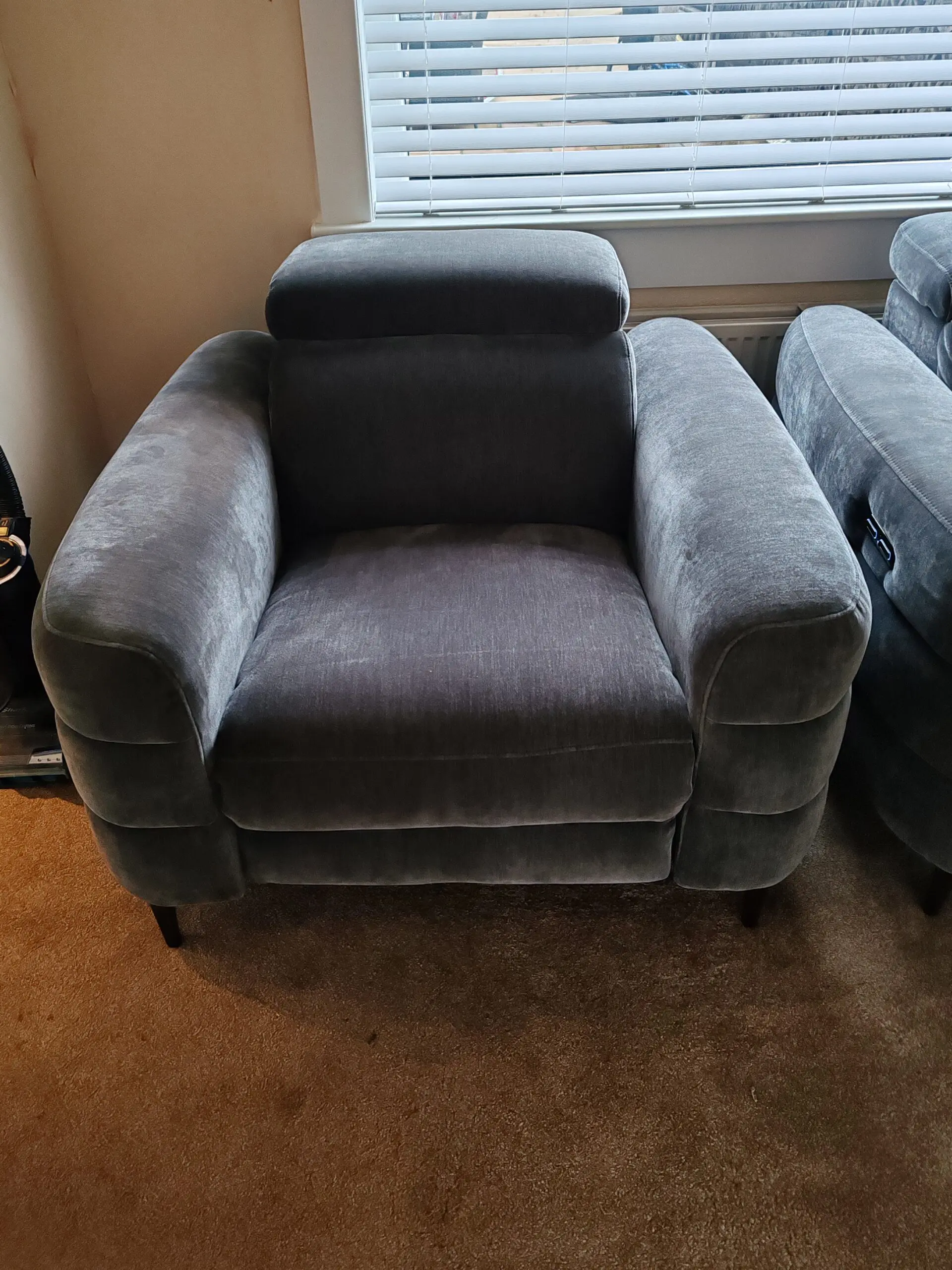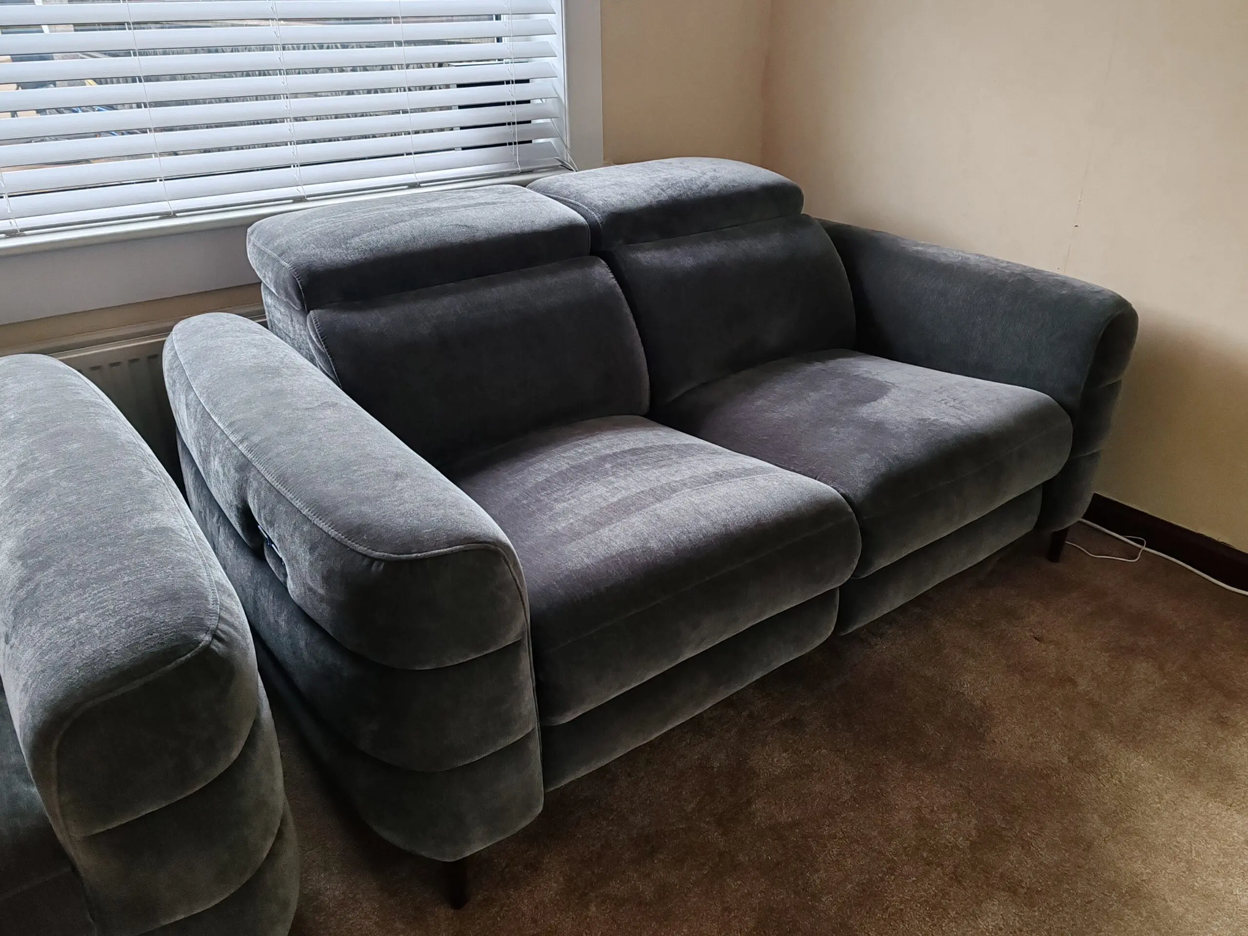 Grey sterling hoy power recliners and head rests.
