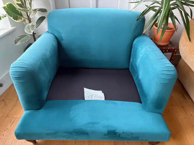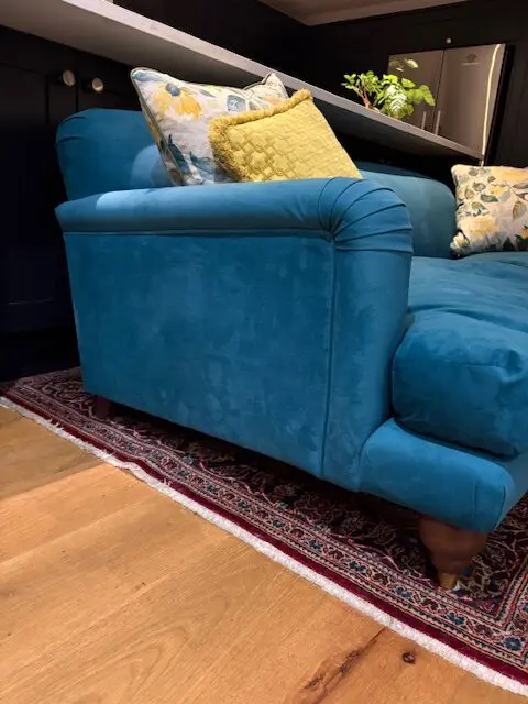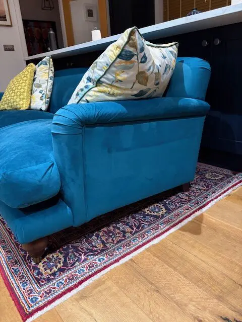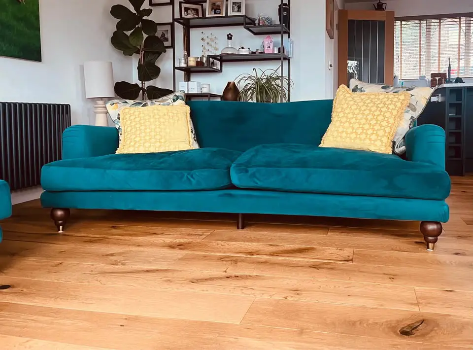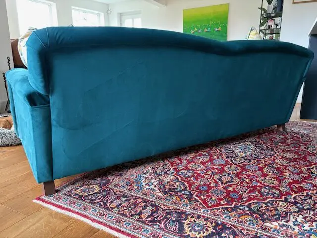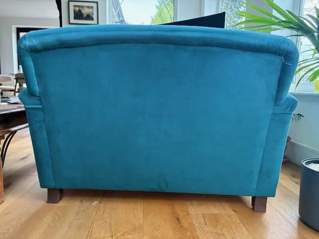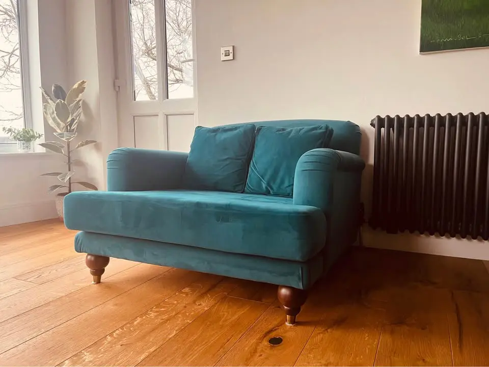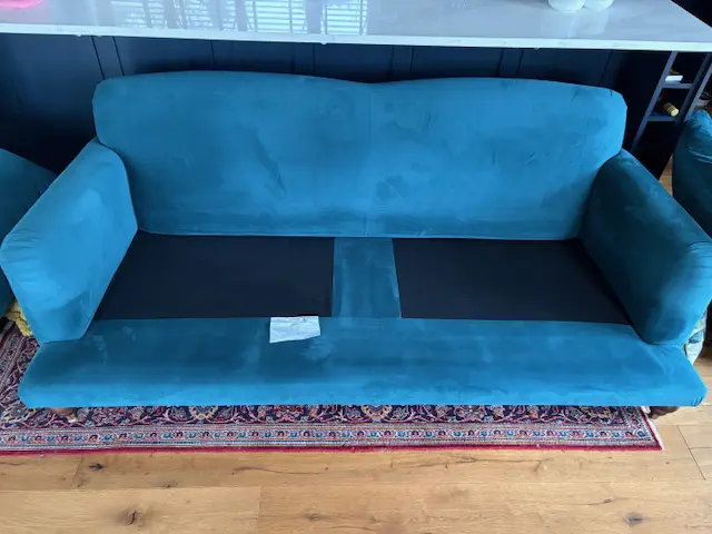 Teal easy velvet, three seat sofa and loveseat purchased from Swoon five years ago and still in very good condition.