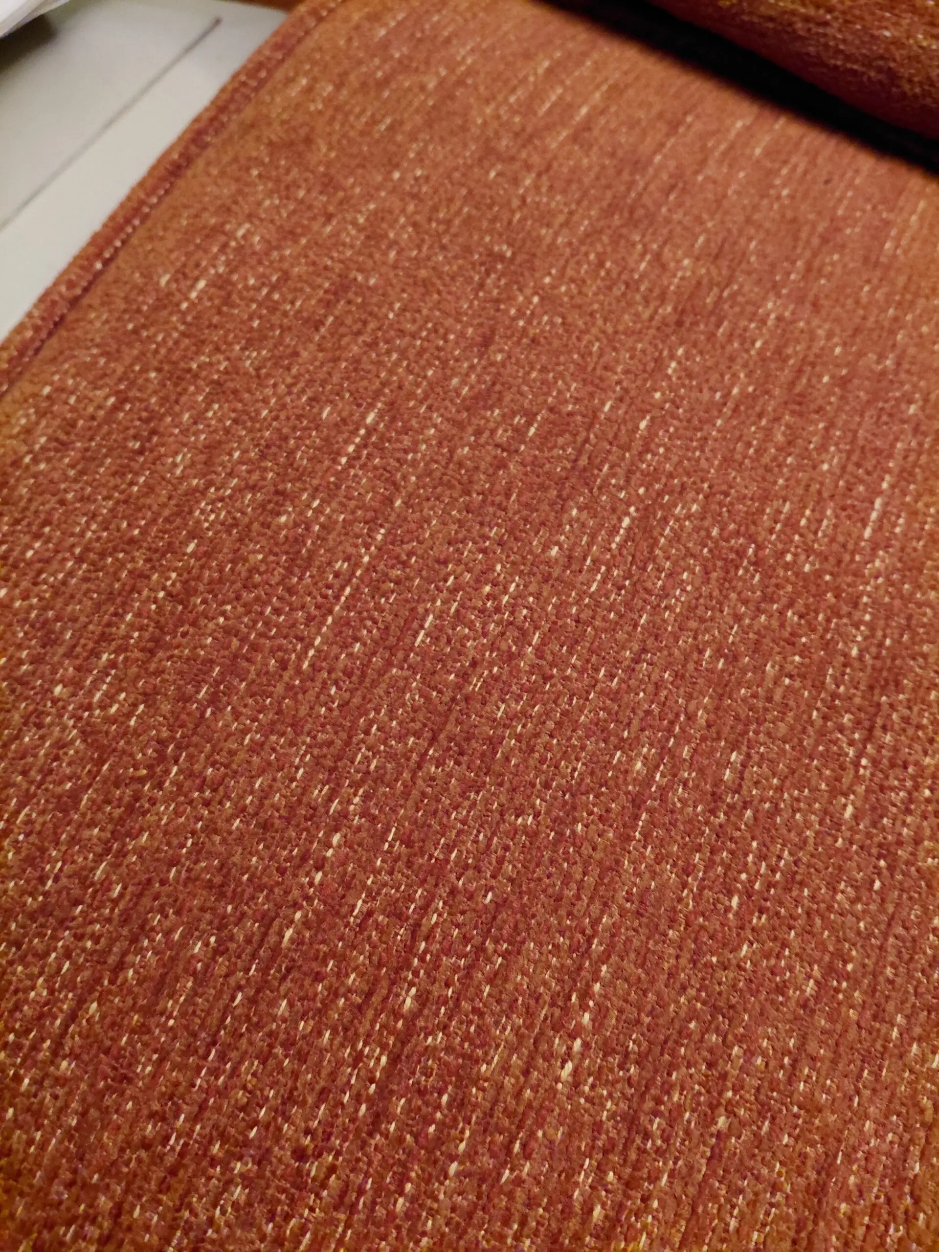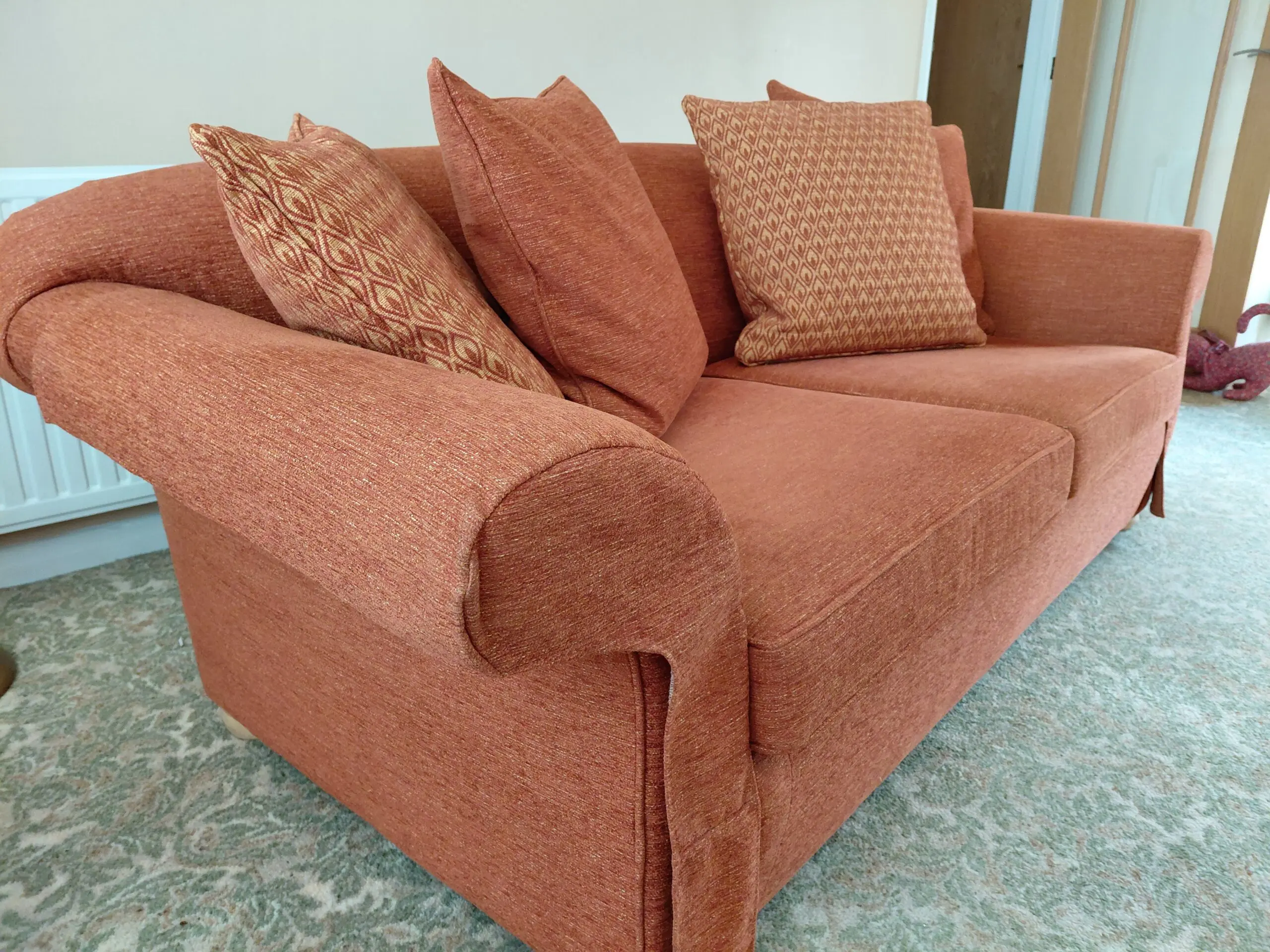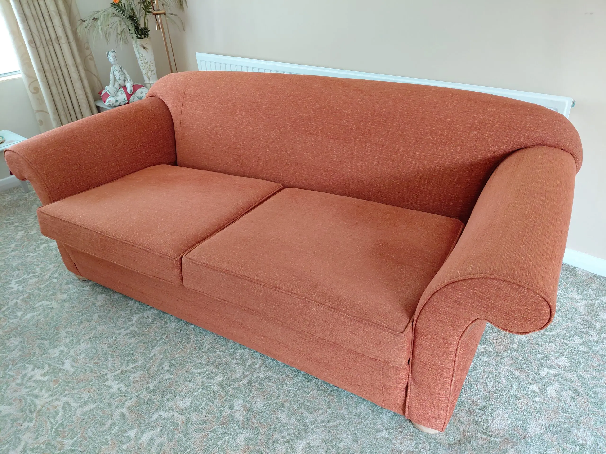 Tetrad 3 seater sofa and chair. Reupholstered in a burnt orange fabric. Removable fitted arm protectors in same fabric. No damage, no stains. Minimal wear.