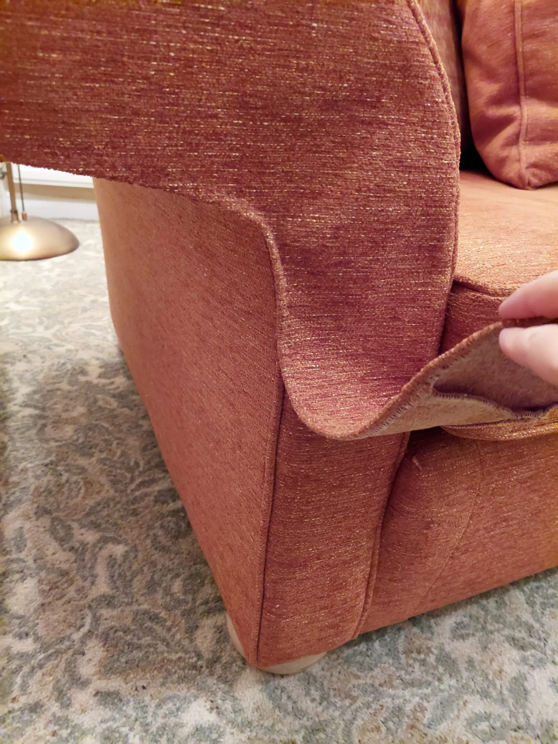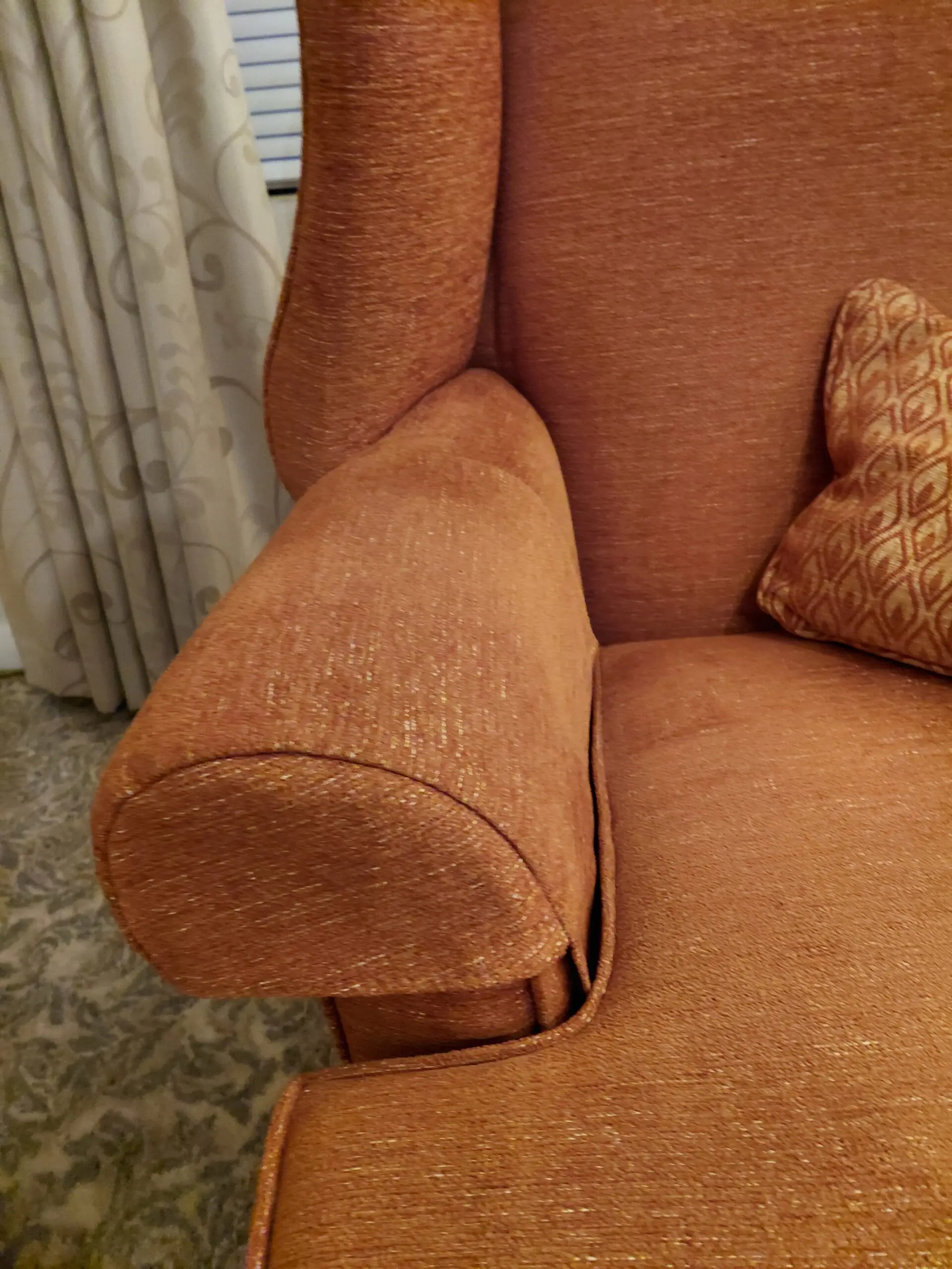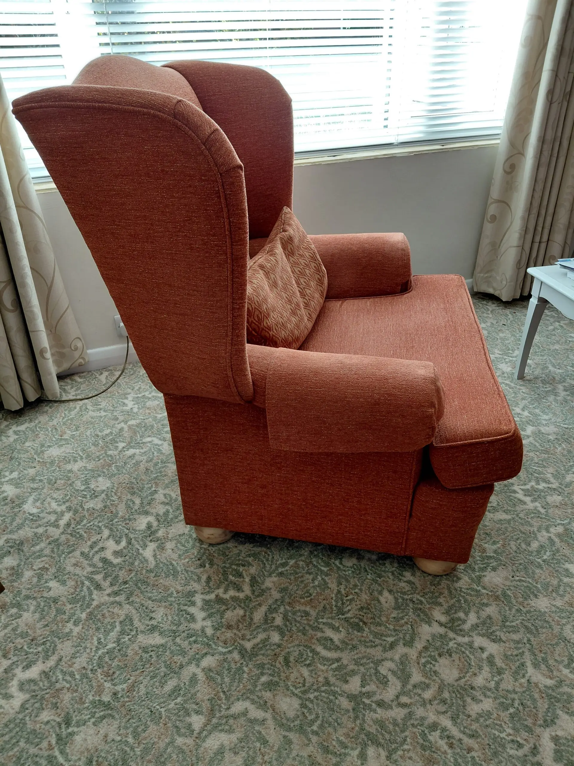 Tetrad 3 seater sofa and chair. Reupholstered in a burnt orange fabric. Removable fitted arm protectors in same fabric. No damage, no stains. Minimal wear.
