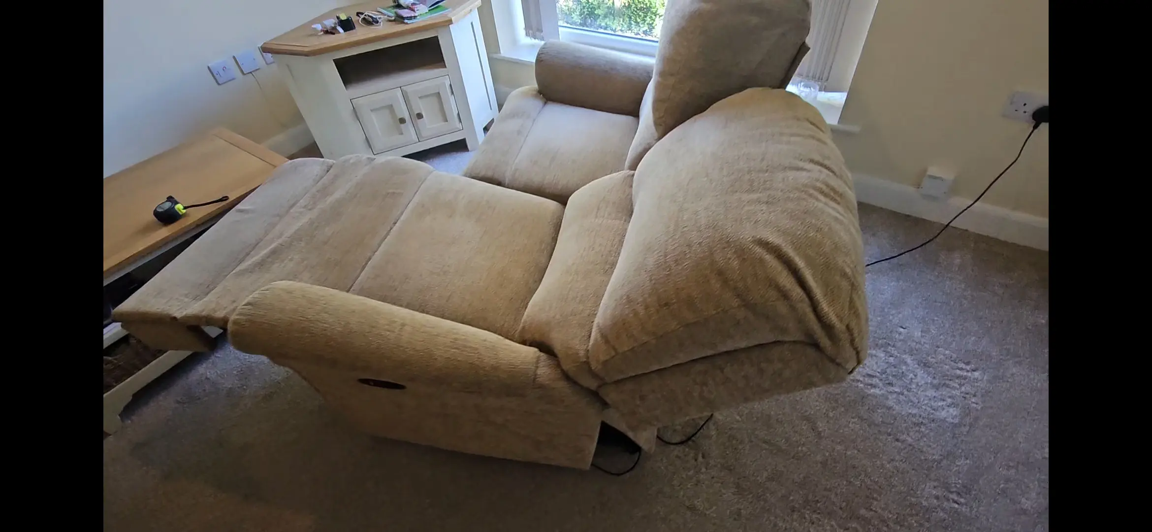 One electric and one manual. Slught stain on one arm on manual recliner. Fabric