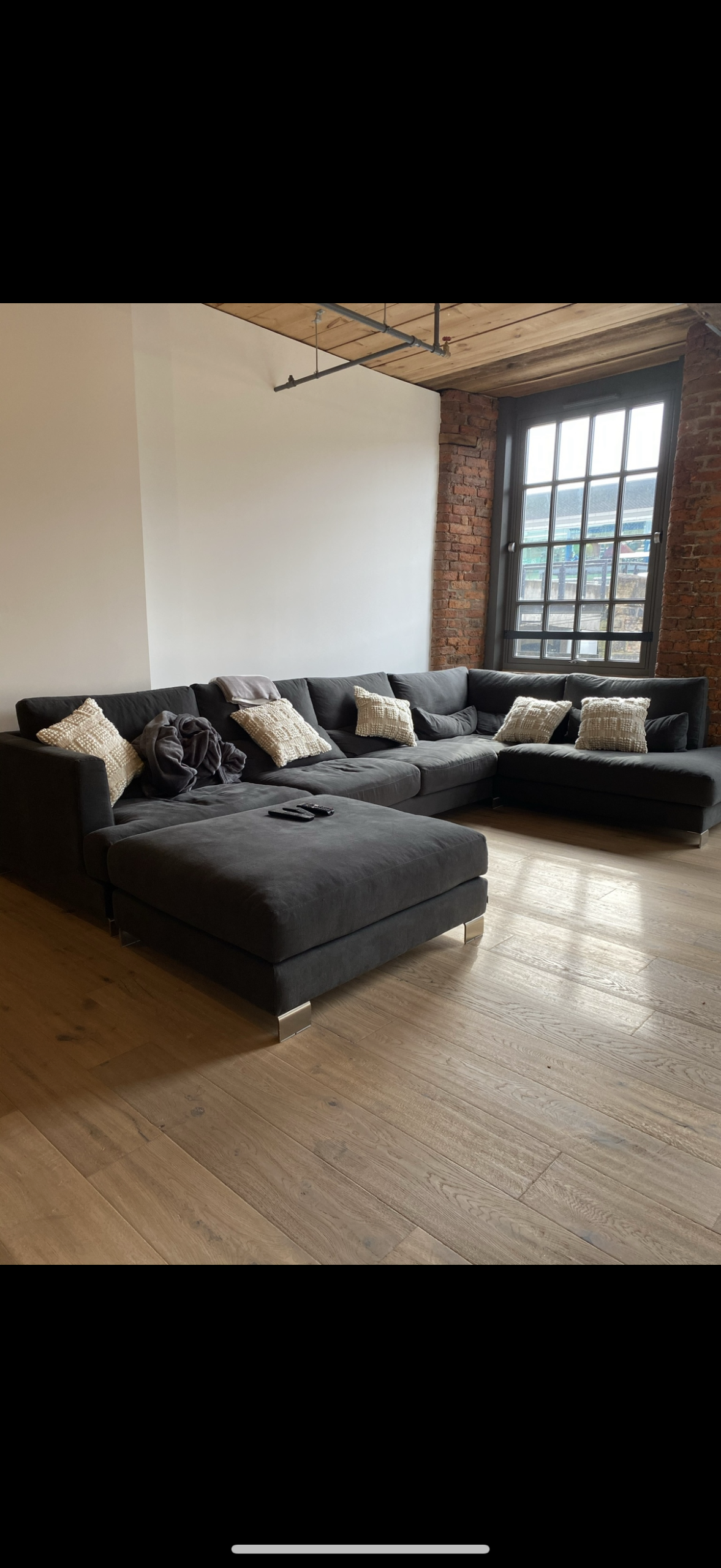 Modular Brandon Sits sofa with dimensions of roughly 380cm width, 230cm (L shape) + footstool 120cm x 90cm which creates a u shape sofa.