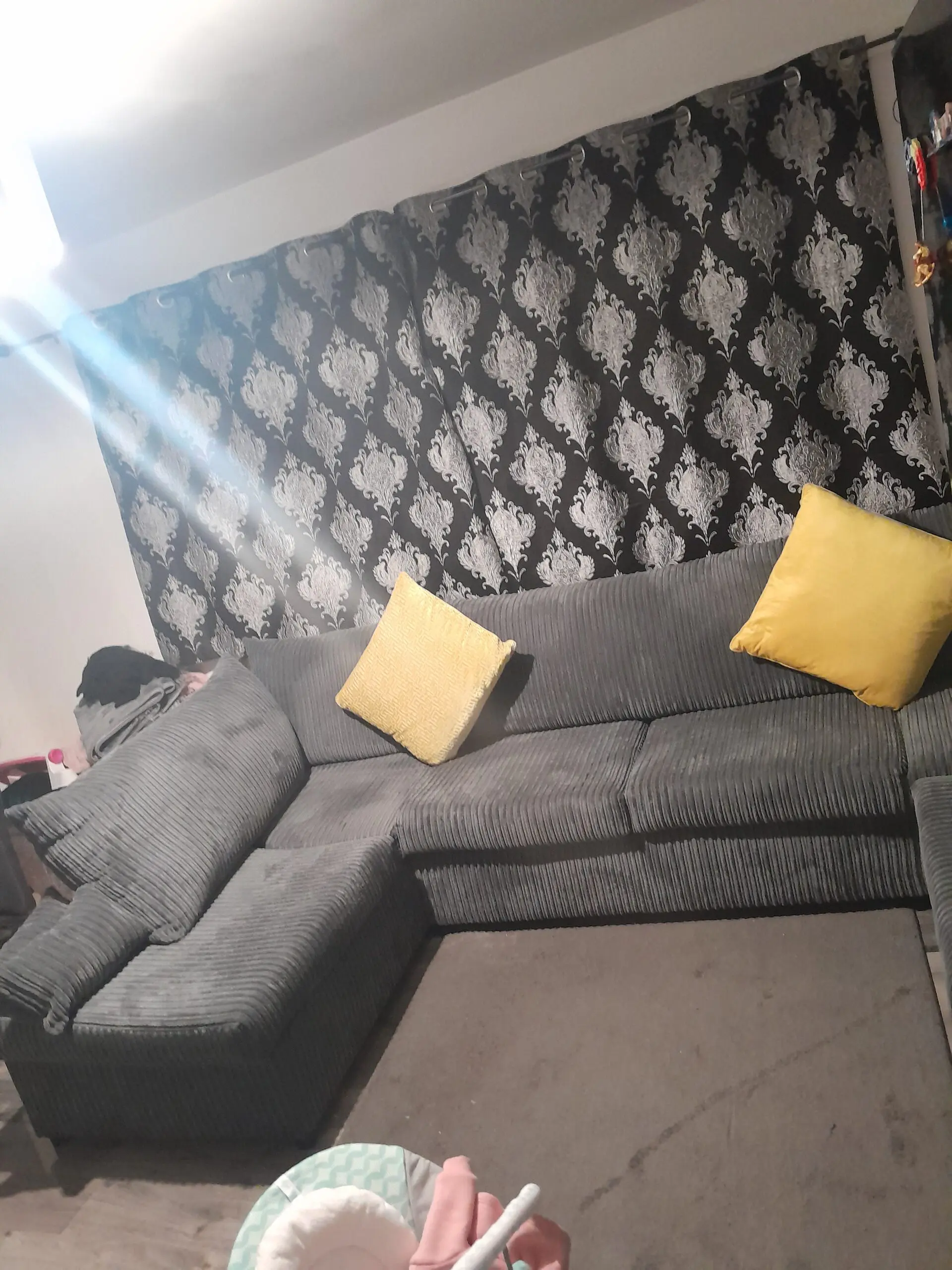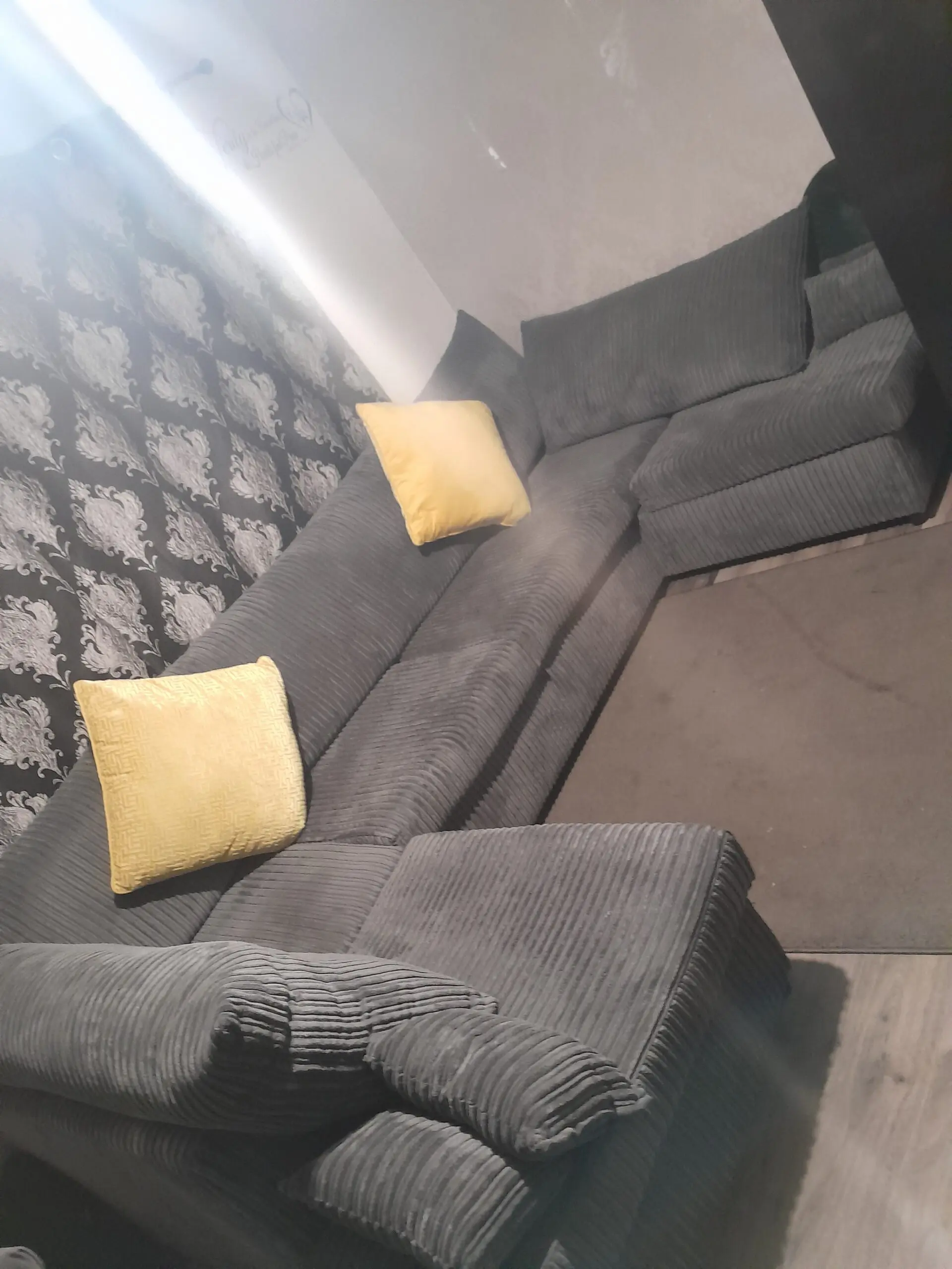 Grey jumbo cord u shaped sofa seats around 7/8 people, only purchased july 2025 so still in very good condition/like new, no marks or stains, non smokers house, only selling as I am moving homes.comes with 2 large yellow pillows and 4 small grey pillows