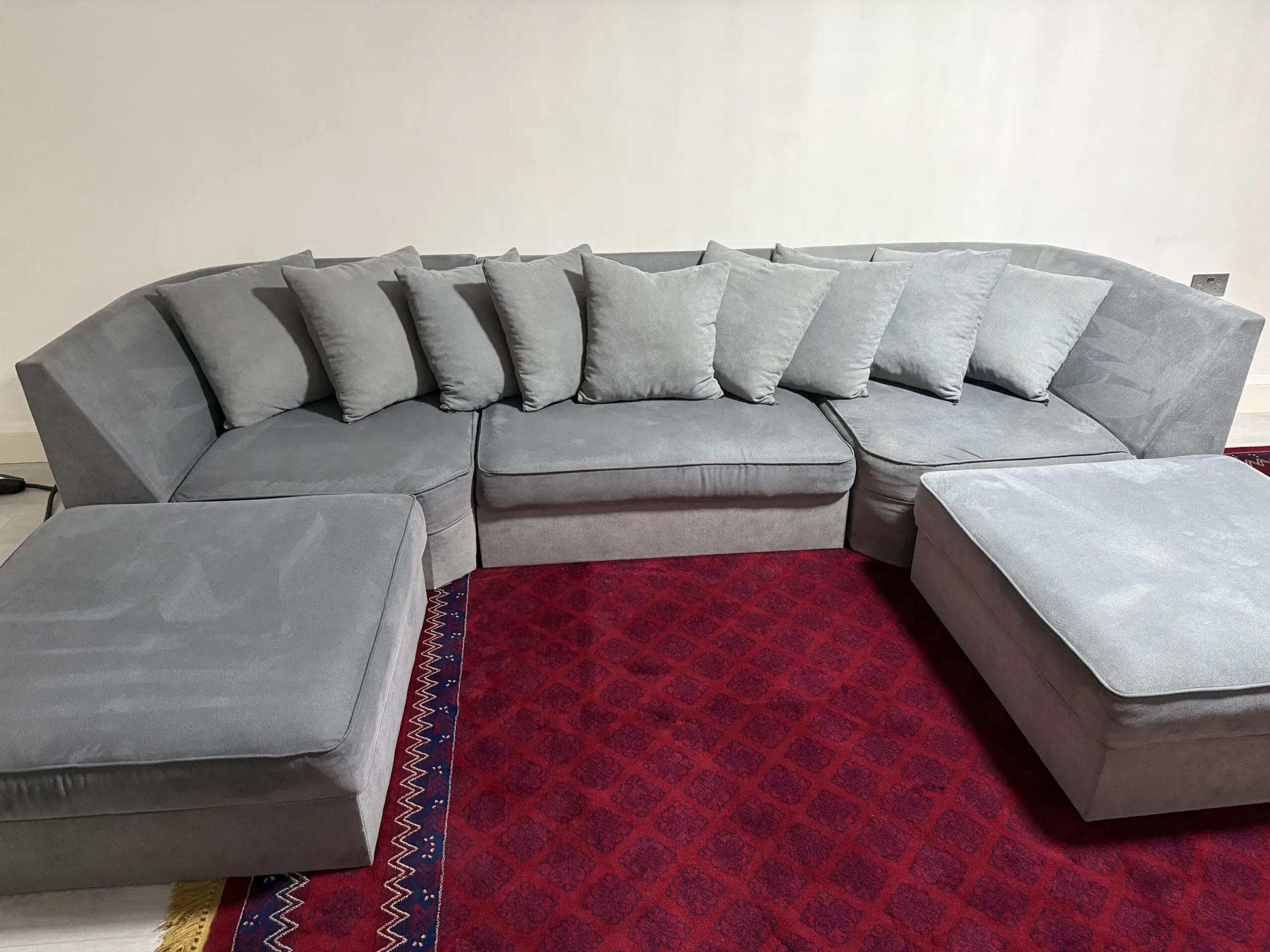 Large U-shaped sectional in light grey fabric with 9 back cushions. Ideal for big families or lounge areas. Minor wear on one side reflected in the price.